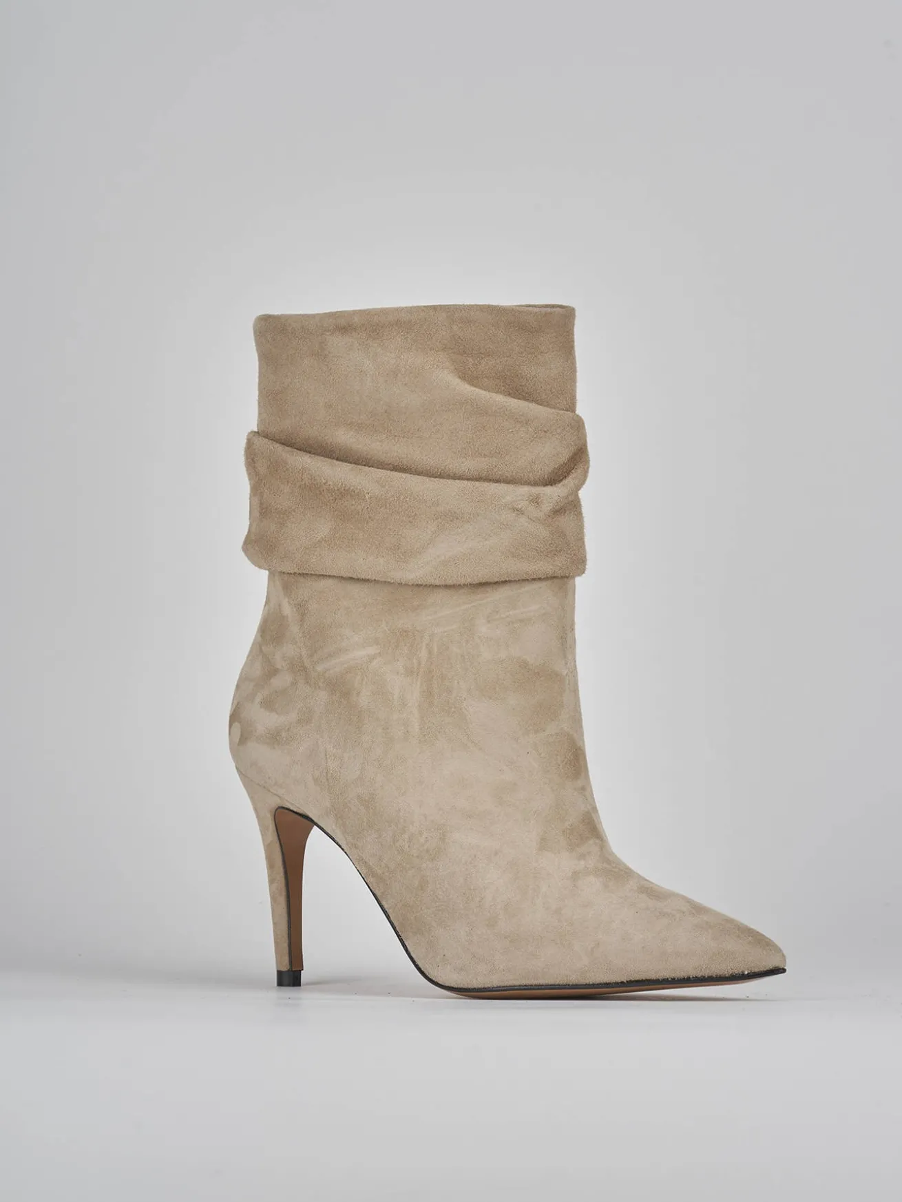 Stivaletto tacco 8.5 cm fondo in gomma e soletto interno in vera pelle. tomaia in morbida pelle scamosciata, punta sfilata, tomaia arricciata in caviglia e tacco fino per un look cool-chic.