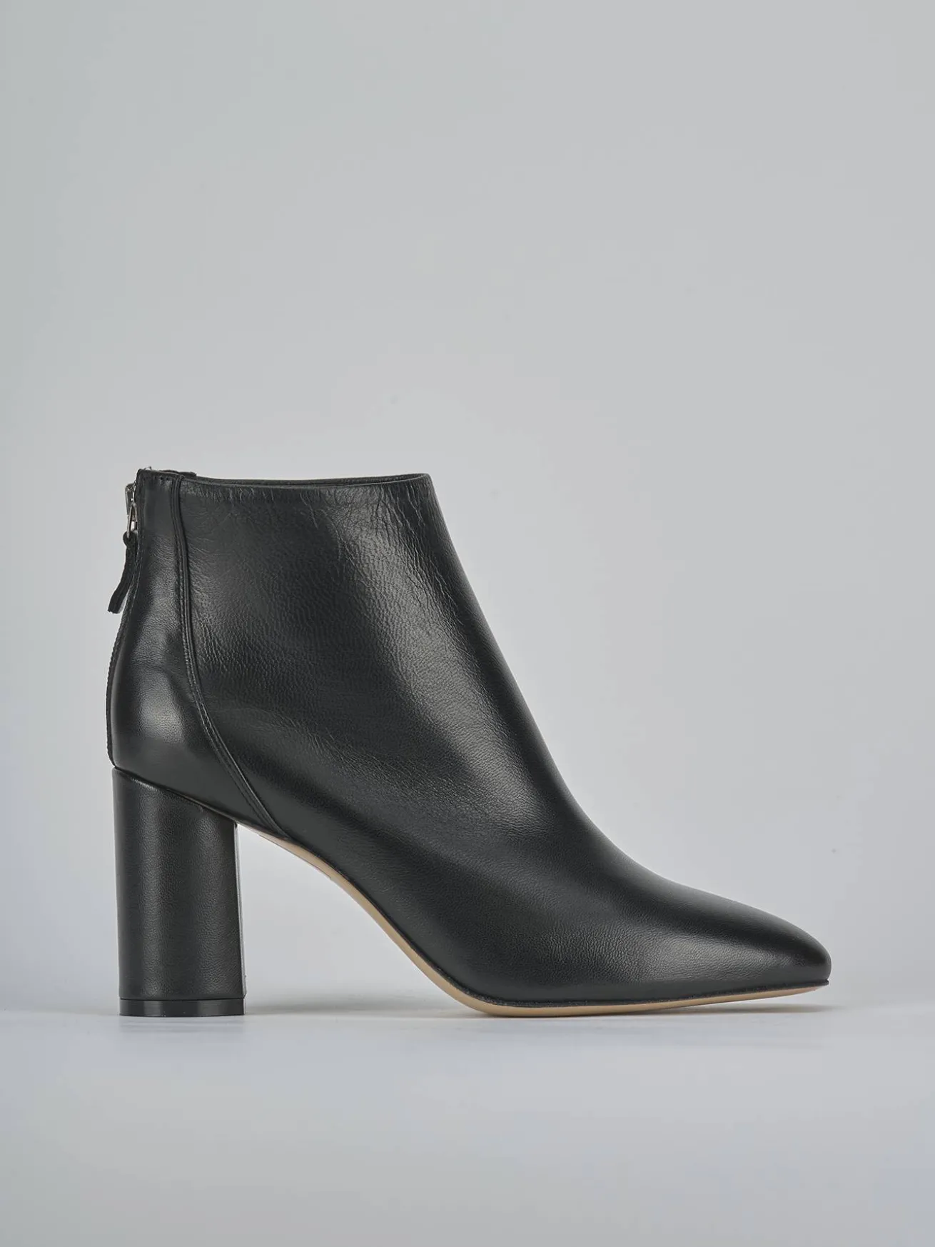 Stivaletto tacco 9 cm fondo in cuoio e soletto interno in vera pelle. Tomaia in morbida pelle, punta sfilata, cuciture, rapida chiusura con cerniera posteriore e tacco grosso. Perfetto sia con una gonna e maglia che con dei jeans vintage.