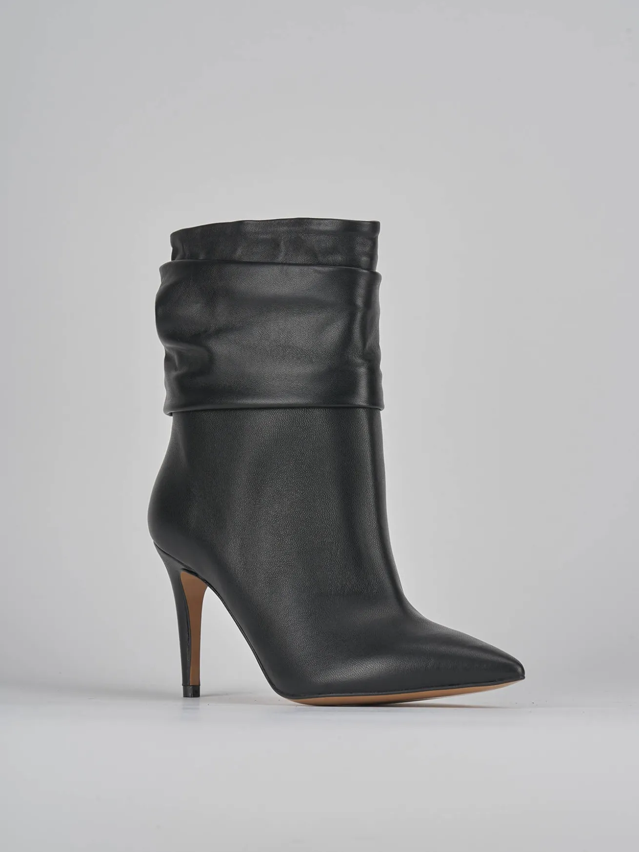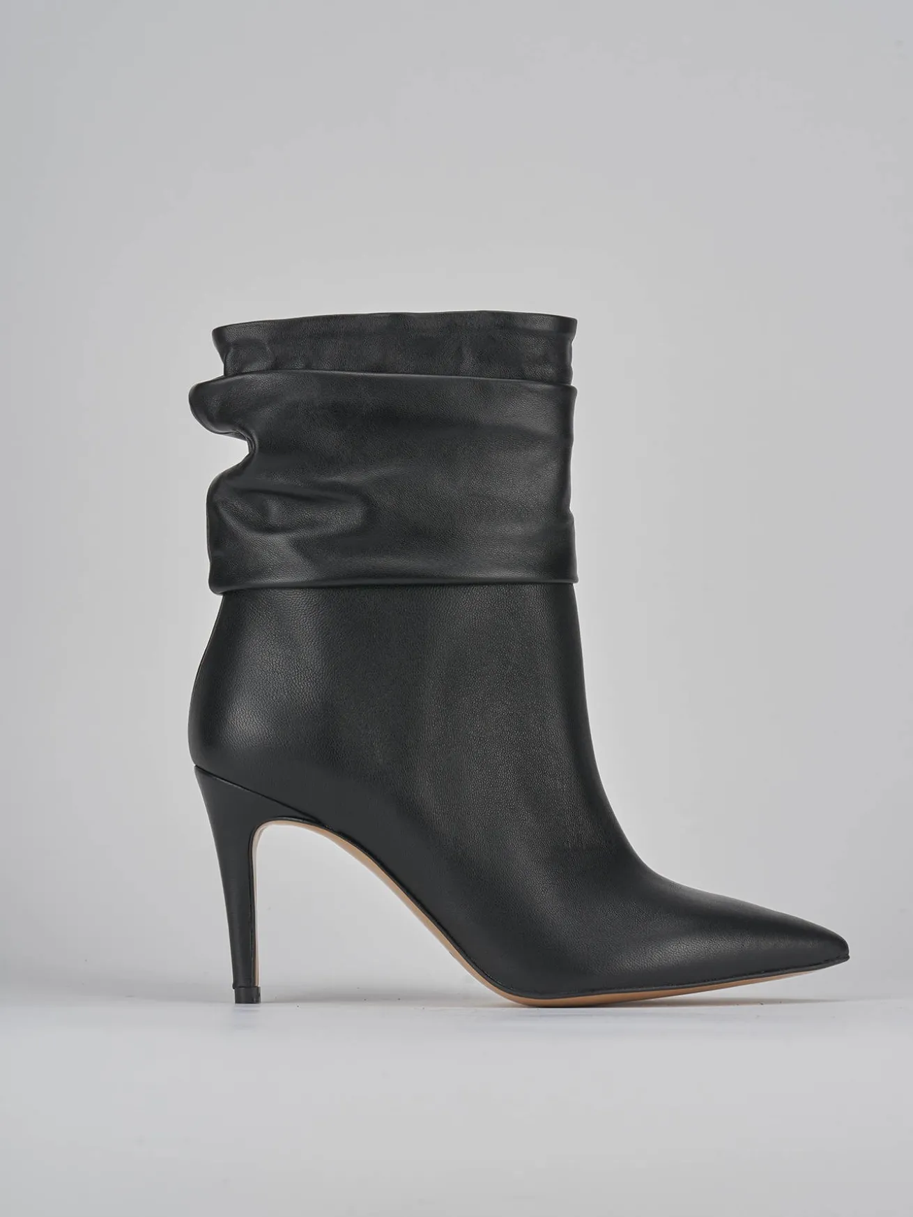 Stivaletto tacco 8.5 cm fondo in gomma e soletto interno in vera pelle. tomaia in morbida pelle, punta sfilata, tomaia arricciata in caviglia e tacco fino per un look cool-chic.