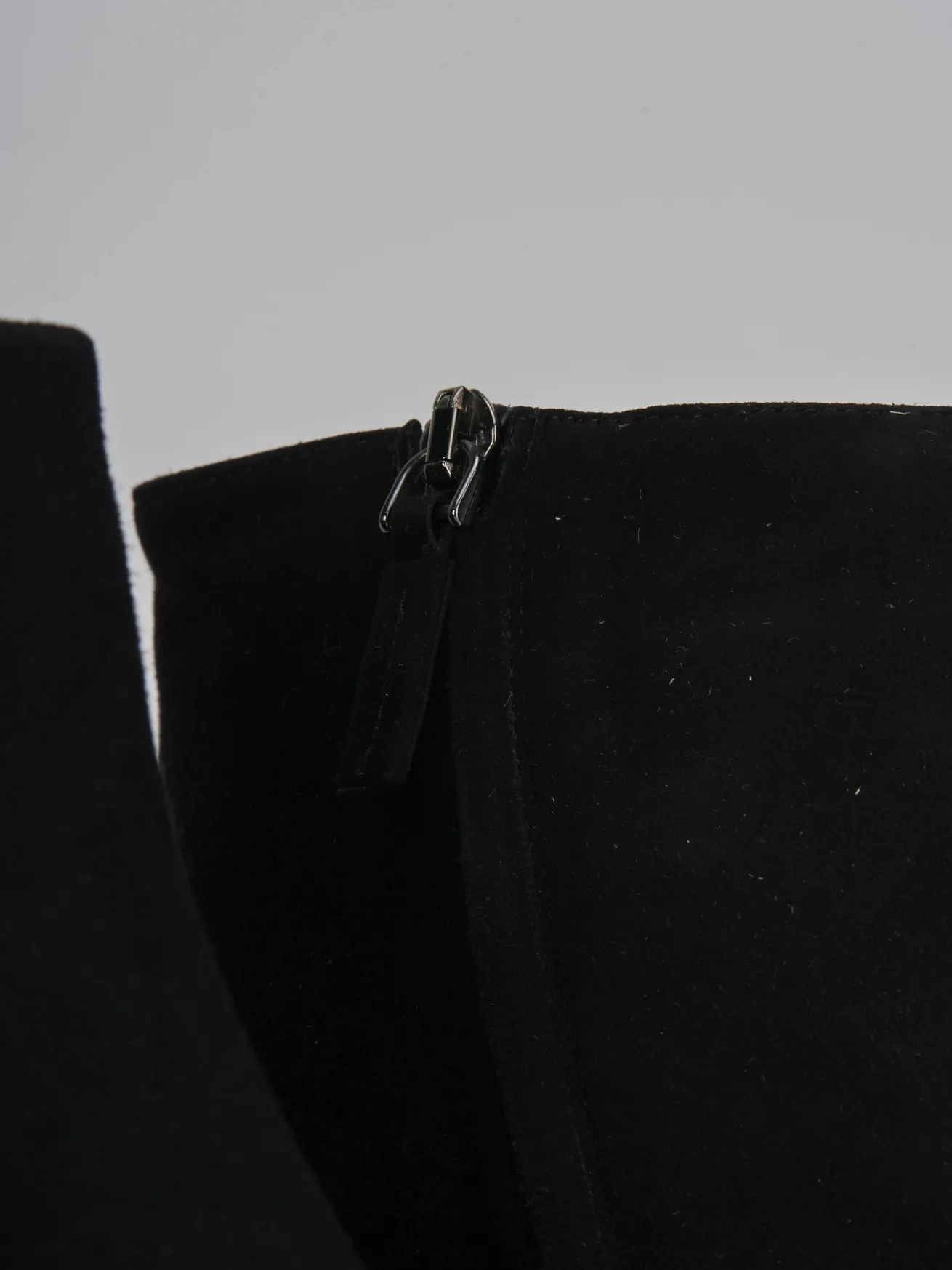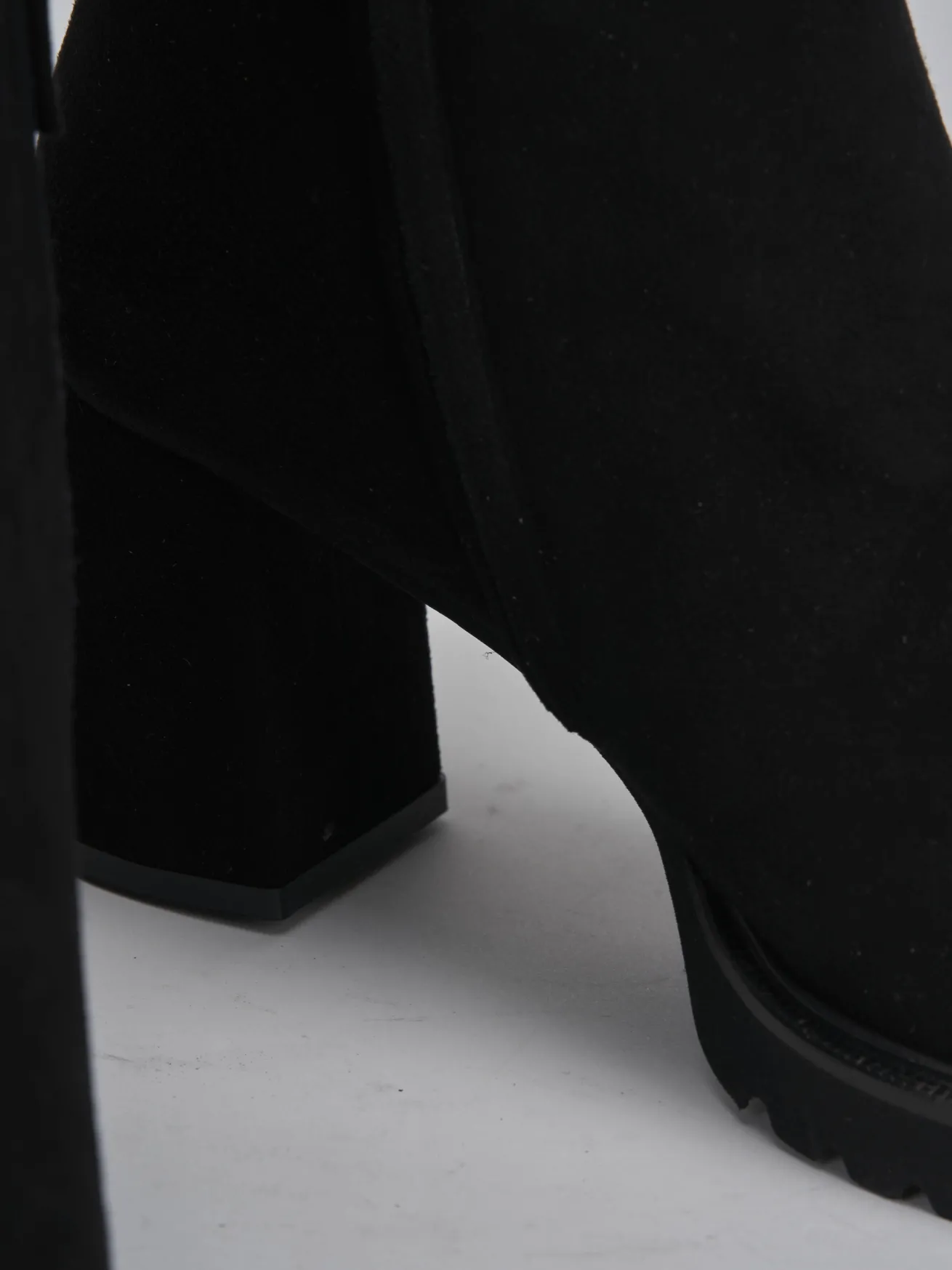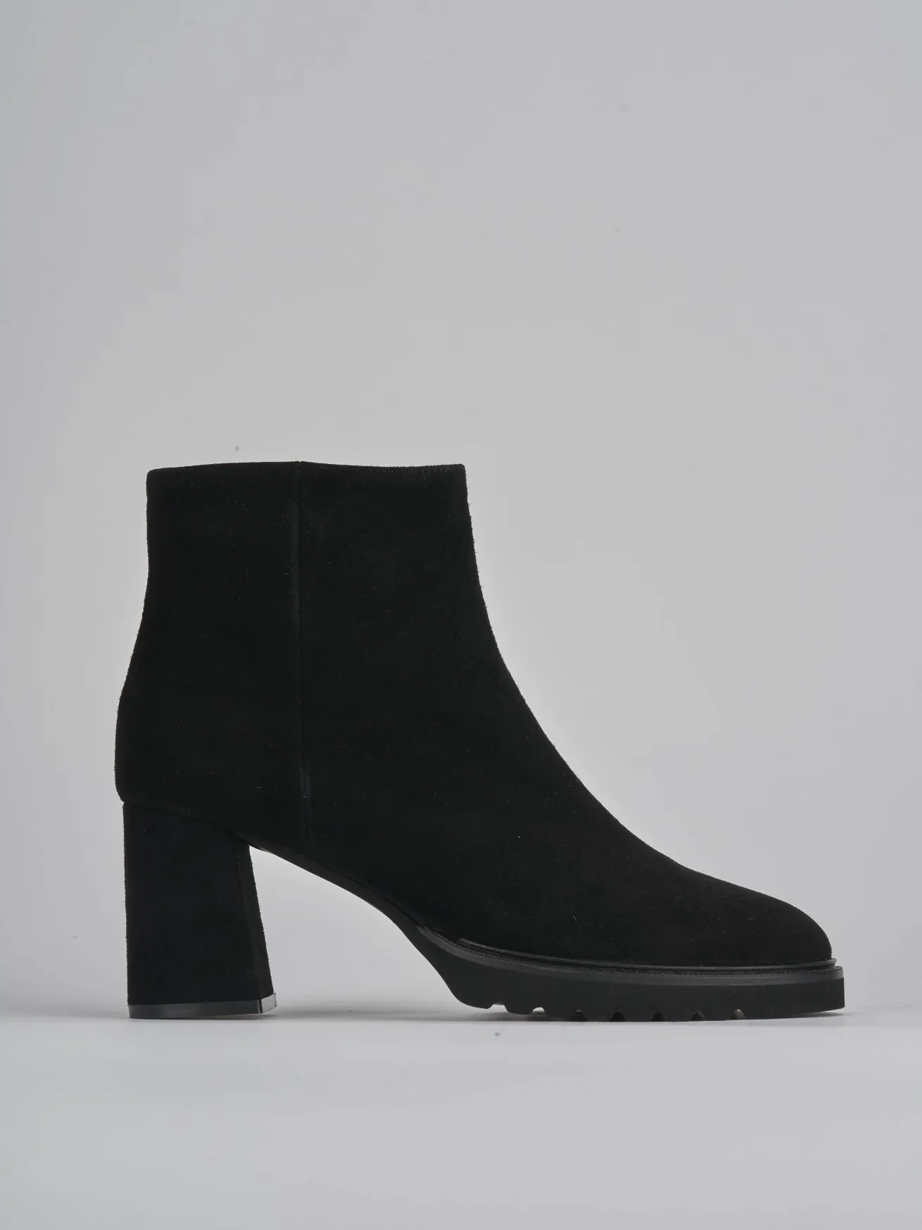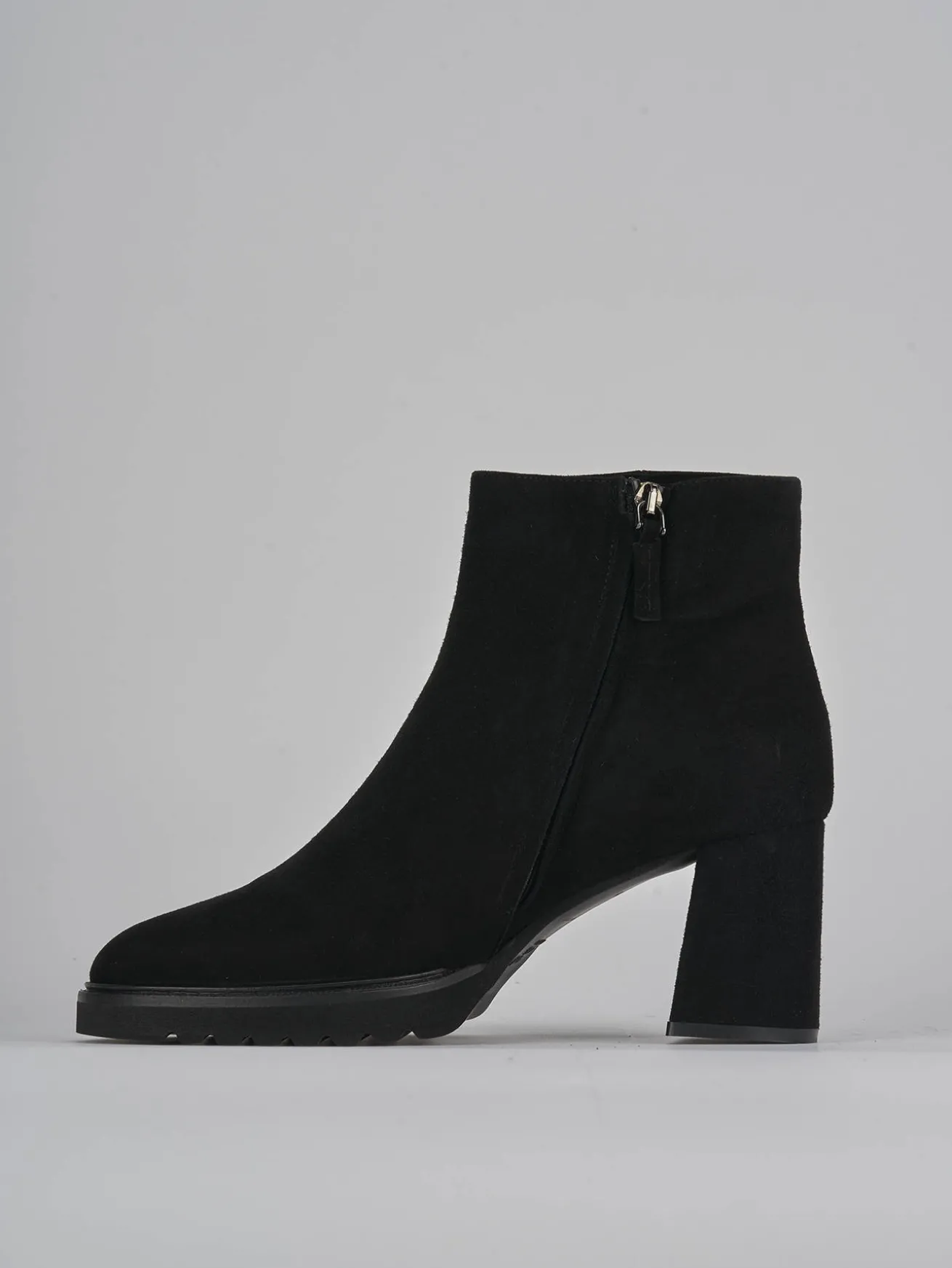 Stivaletto tacco 7,5 cm fondo in gomma e soletto interno in vera pelle. Tomaia in morbida pelle scamosciata, punta affusolata, comoda cerniera laterale, cuciture visibili, plateau di 1 cm sulla parte anteriore, particolare fondo seghettato e tacco grosso per un look cool.