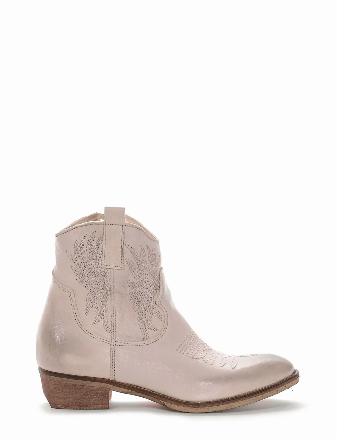 stivaletto texano tacco 3 cm, fondo in cuoio e soletto interno in vera pelle. Tomaia in morbidissima pelle con particolarissimo ricamo sulla punta e sul gambale.