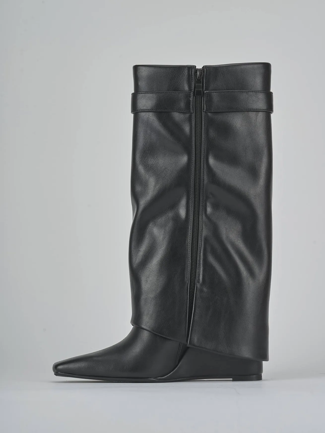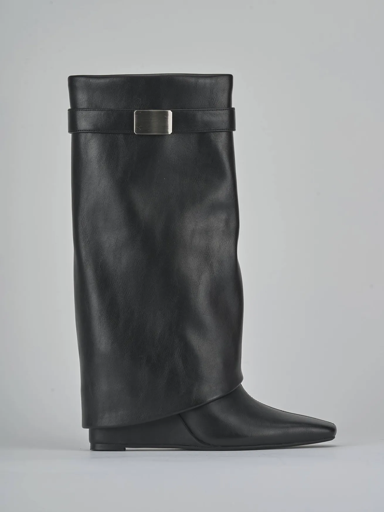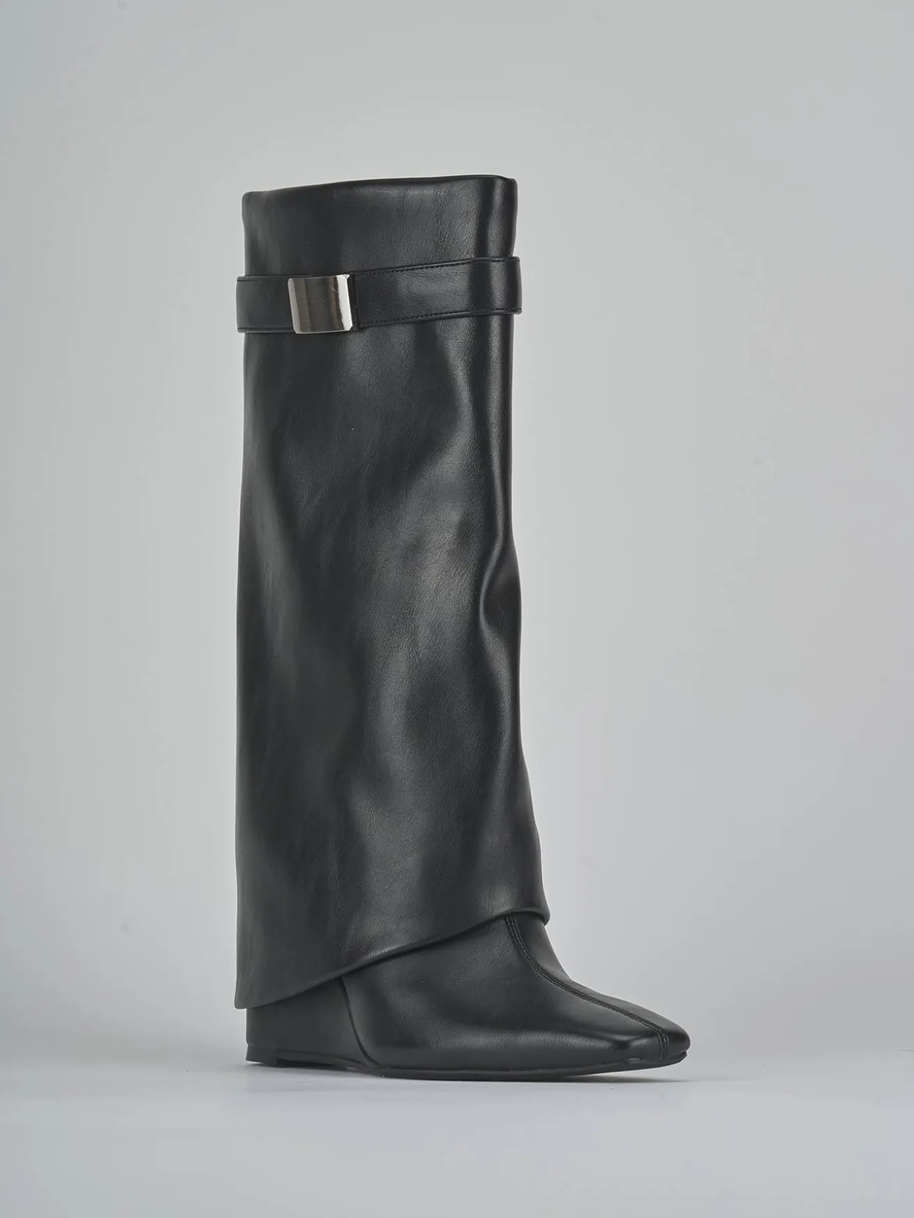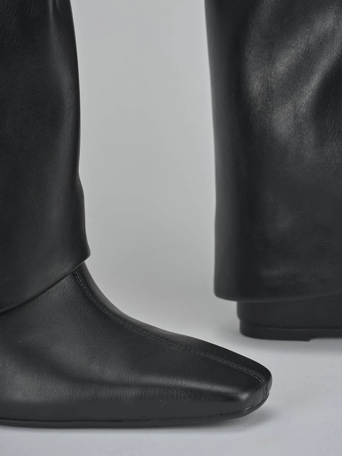 Le cuciture a mano sul gambale tubolare, che arriva appena sotto il ginocchio, aggiungono un tocco artigianale e raffinato.