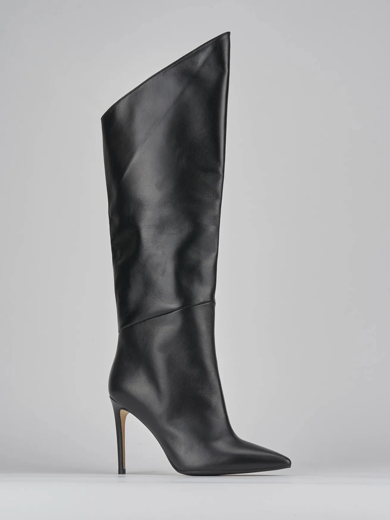 Stivale tacco 11 cm fondo in cuoio e soletto interno in vera pelle. Tomaia in morbida pelle, punta sfilata, comoda cerniera laterale, gambale con taglio obliquo cje misura appena sotto il ginocchio e tacco a spillo per un look che non passa mai di moda.
