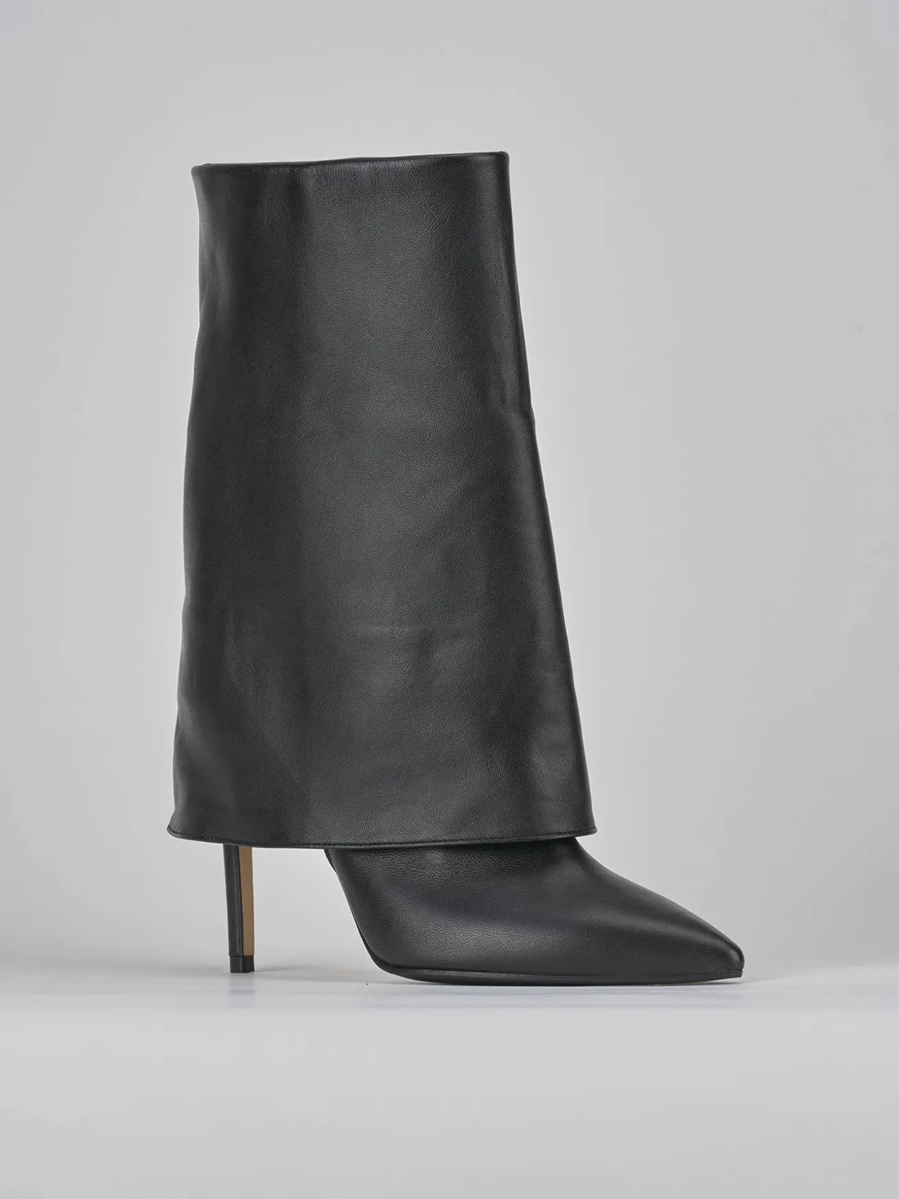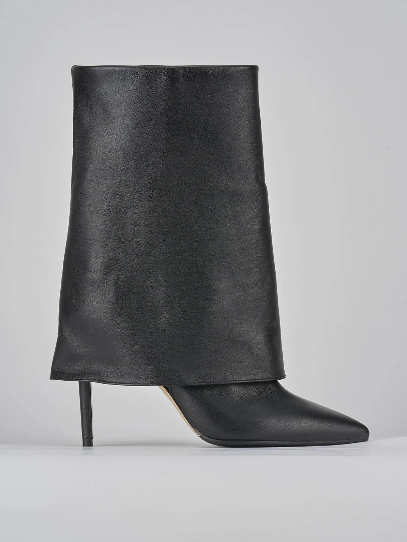 Stivale tacco 11 cm fondo in cuoio con inserto di gomma in punta e soletto interno in vera pelle. Tomaia in morbida pelle, punta sfilata, ampio gambale con risvolto che arriva appena sotto al ginocchio e tacco a spillo per un look chic.