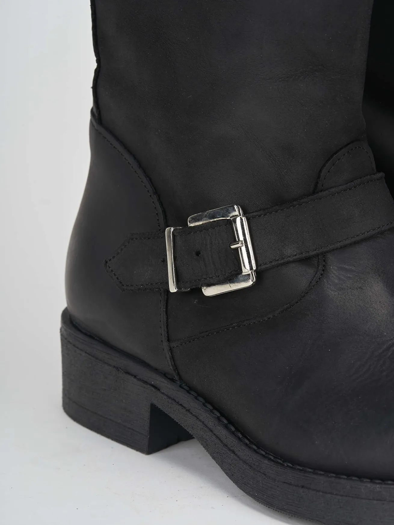 Realizzati in vitello nabuk spazzolato anticato, questi stivali presentano una doppia fibbia decorativa che richiama il classico stile biker.