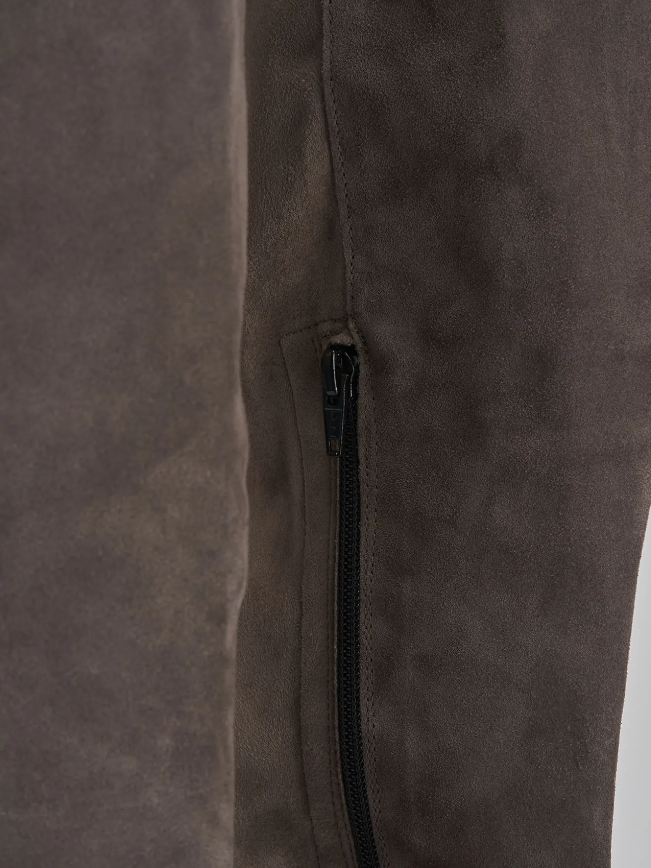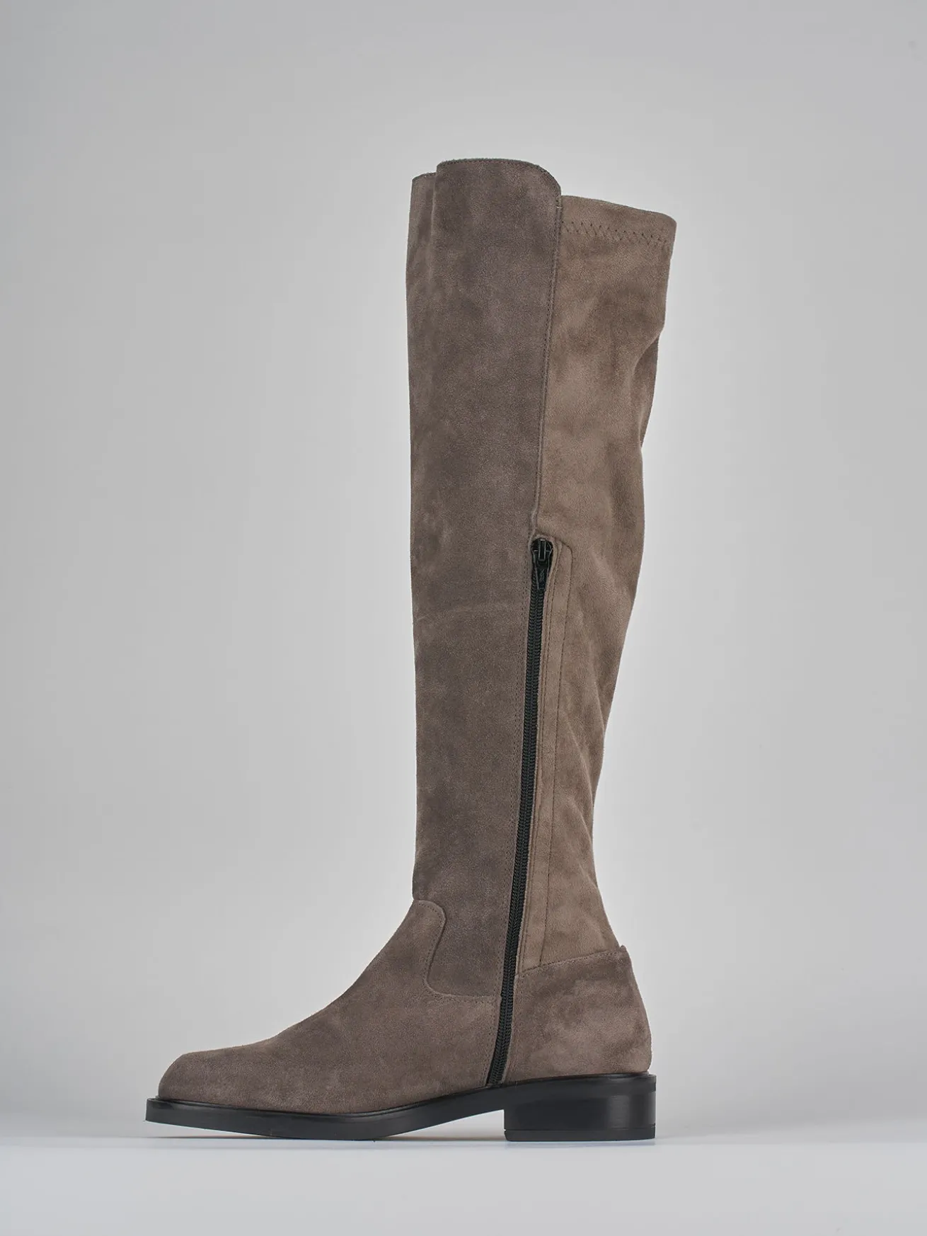 Stivale tacco 2 cm fondo in gomma e soletto interno in vera pelle. Tomaia in morbido camoscio, punta tonda, cuciture visibili, gambale elasticizzato sul polpaccio per una calzata personalizzata. altezza gambale appena sopra il ginocchio, tacco classico e cerniera laterale per un look che non passa mai di moda.