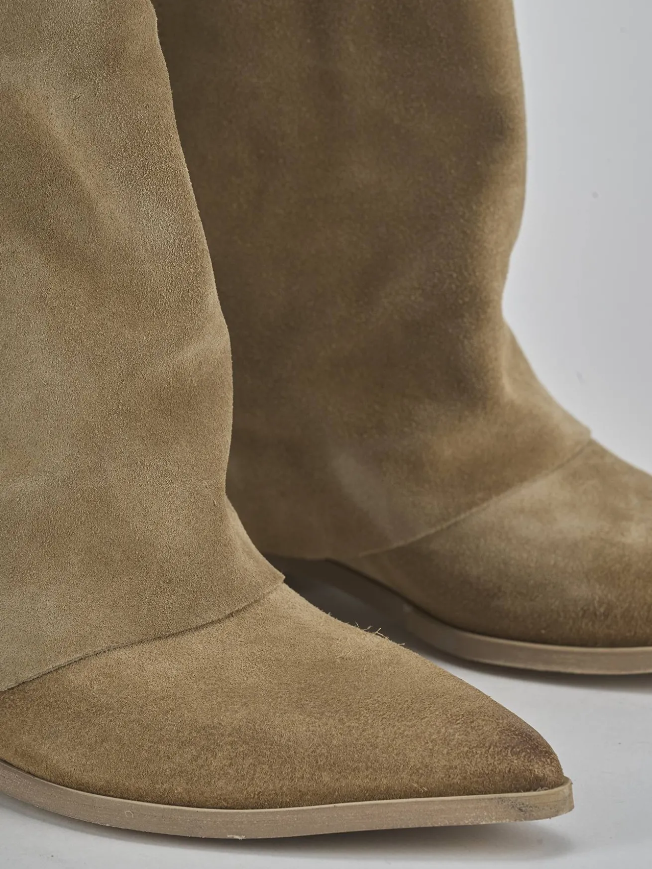 Stivale tacco 2 cm fondo in gomma e soletto interno in vera pelle. Tomaia in morbido camoscio, punta sfilata, cuciture a mano, liscio, risvolto sul gambale che misura appena sotto il ginocchio per un look elegante.