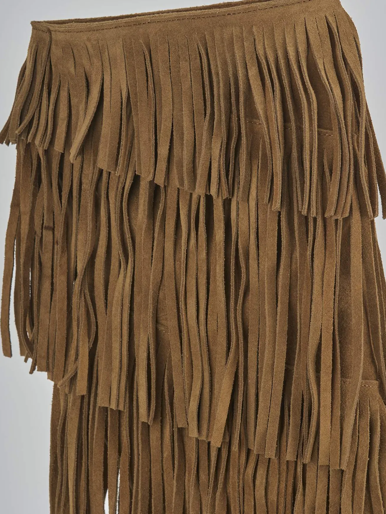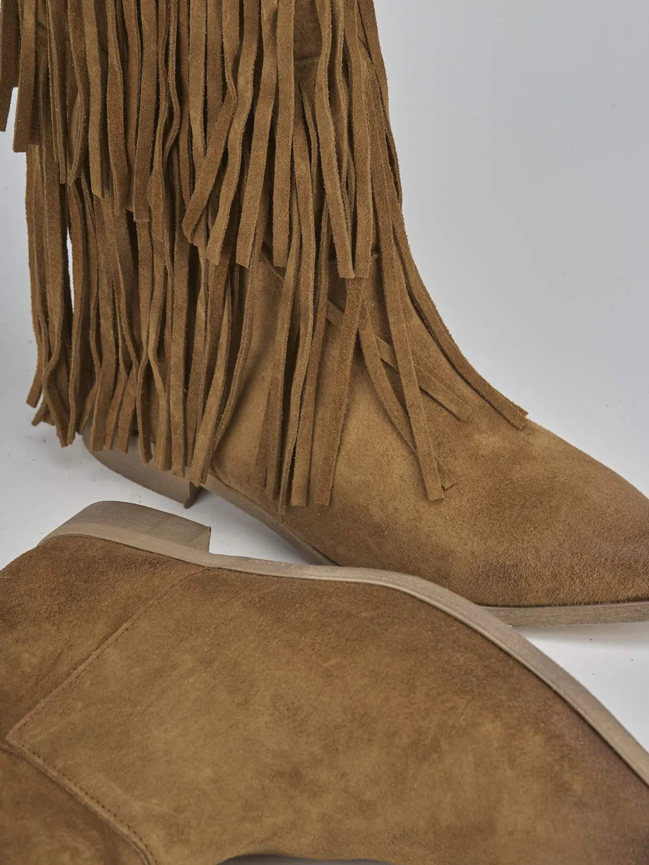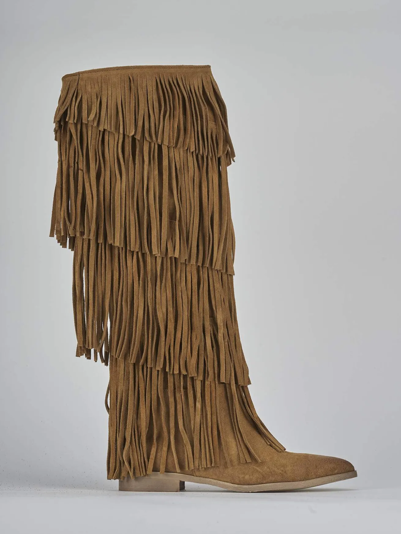 Stivale tacco 2 cm fondo in gomma e soletto interno in vera pelle. Tomaia in morbido camoscio, punta sfilata, frange su entrambi i lati del gambale che misura appena sotto il ginocchio. Perfetto con una minigonna e una maglia.