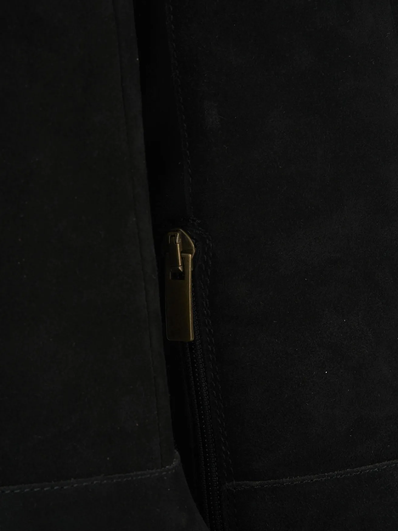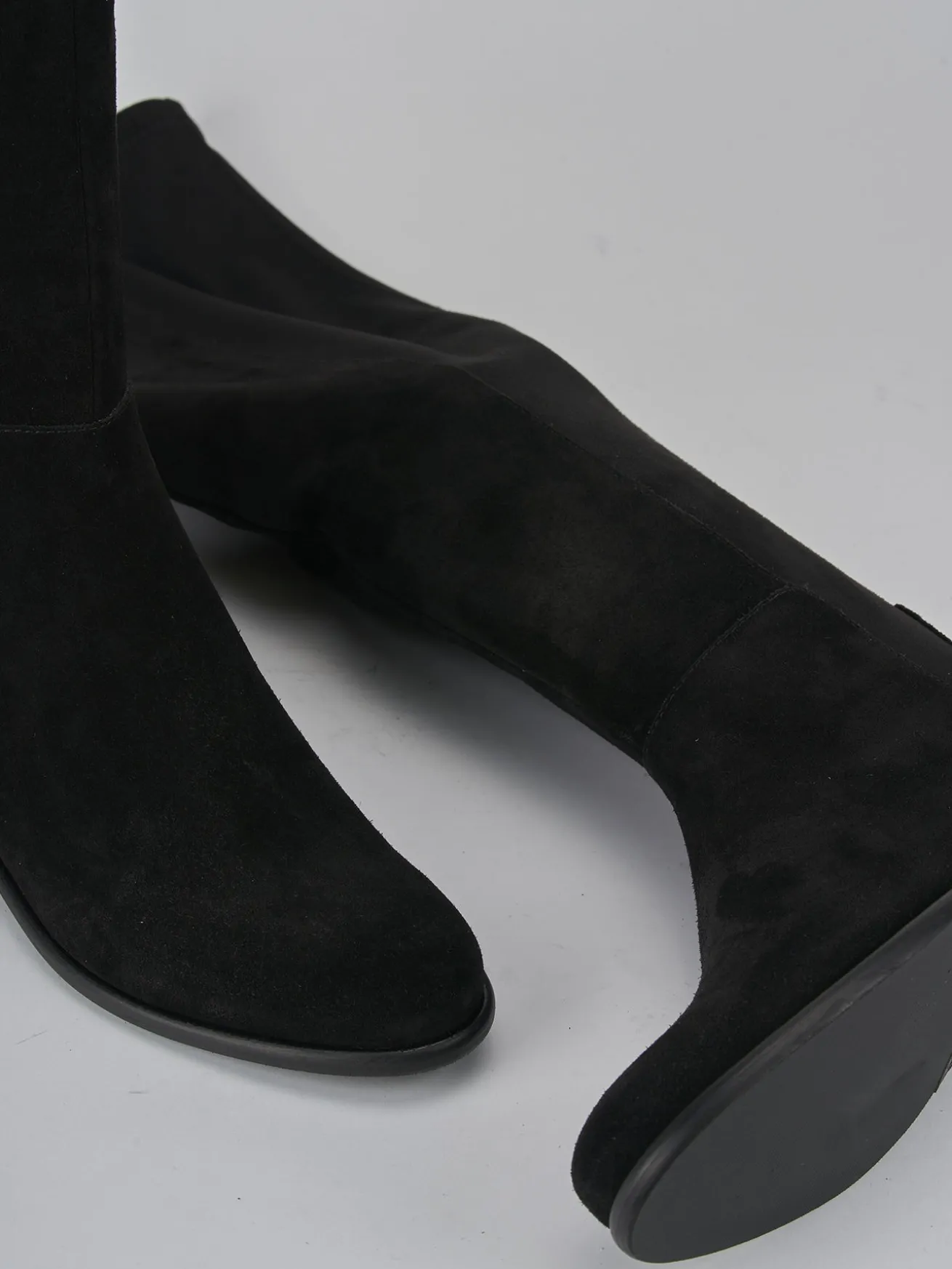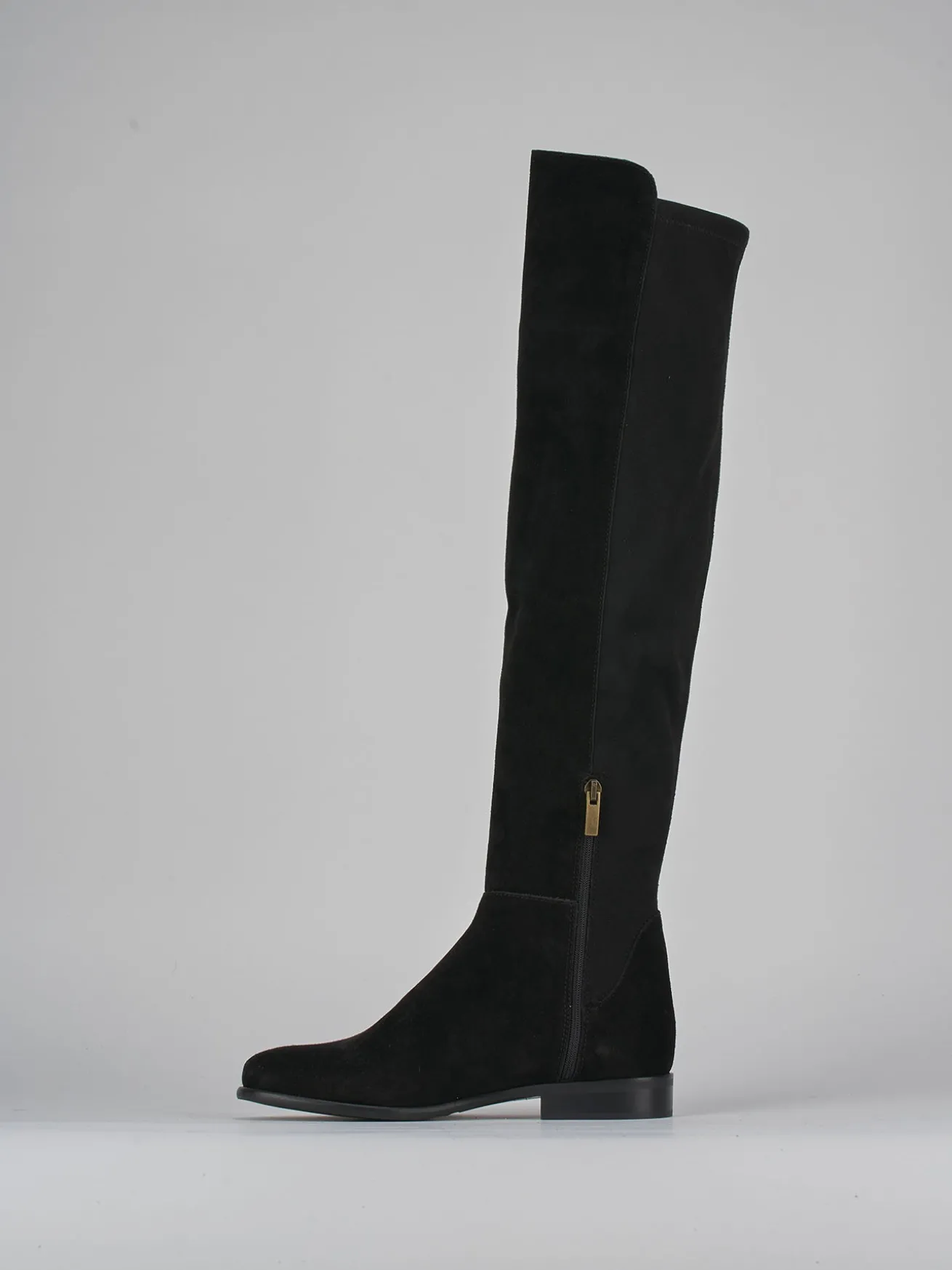Stivale tacco 2 cm fondo in gomma e soletto interno in vera pelle. Tomaia in morbido camoscio, punta tonda, comoda zip laterale, gambale con tessuto elasticizzato dietro che misura appena sopra il ginocchio per un look cool.