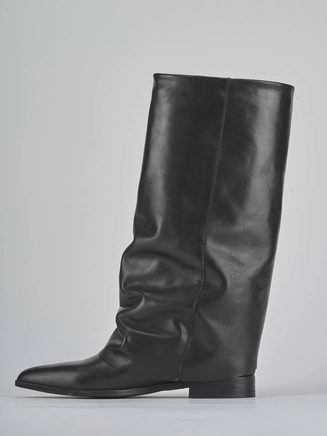 Stivale tacco 2 cm fondo in gomma e soletto interno in vera pelle. Tomaia in morbida pelle, punta sfilata, risvolto aderente sul gambale che si arriccia e che misura a 3cm dal ginocchio. Dalle linee versatili per ogni tuo look.