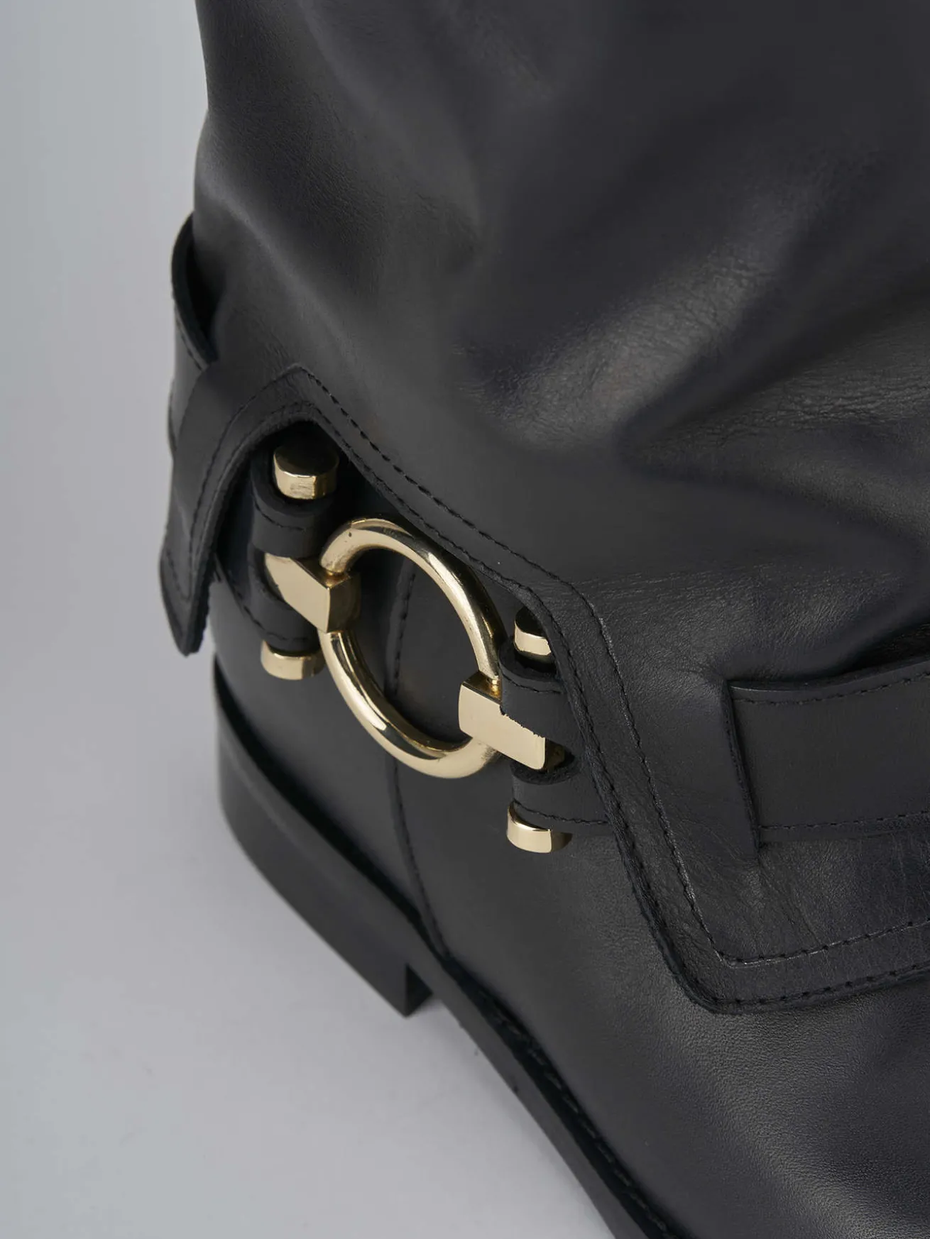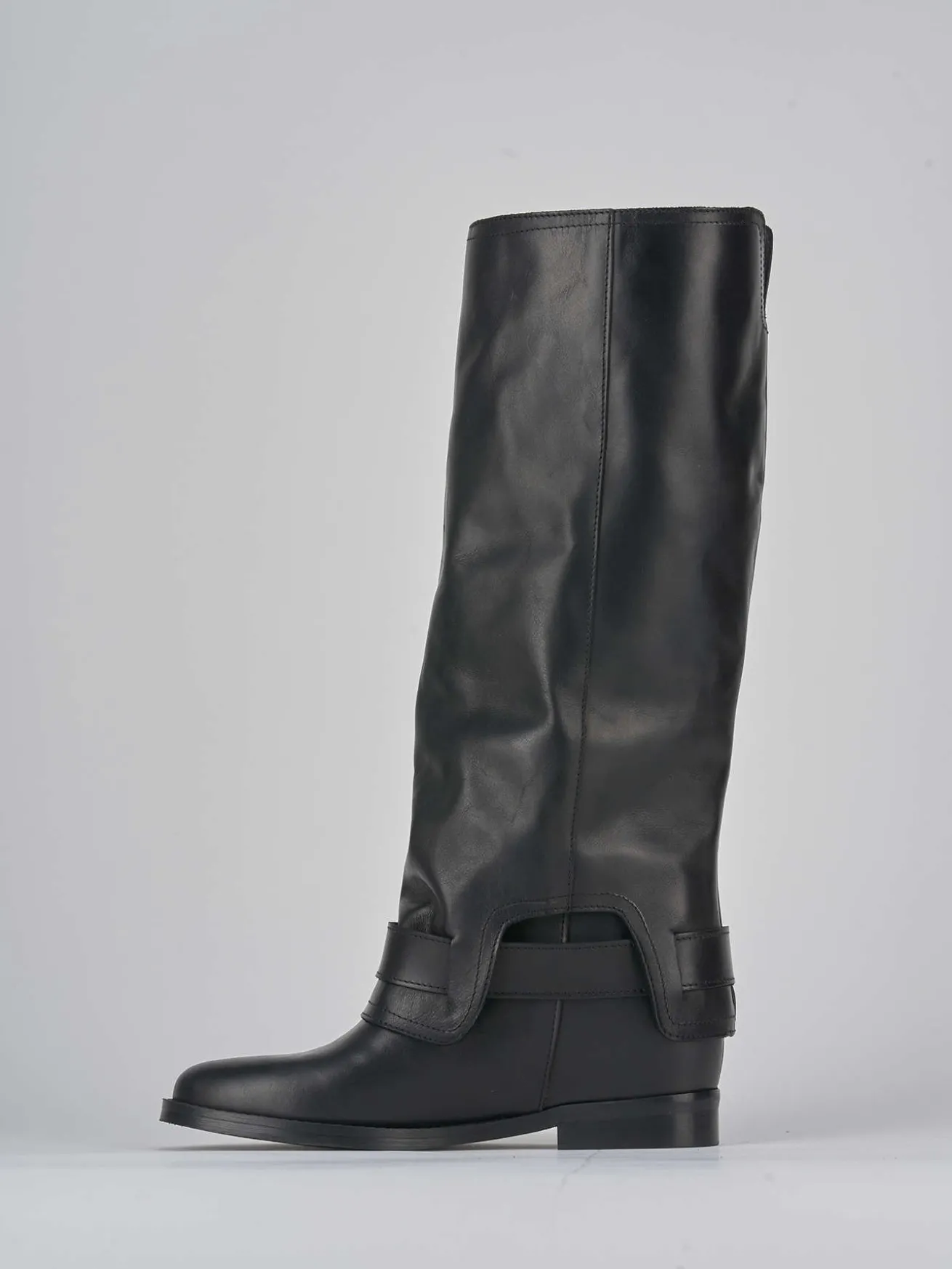 stivale tacco 2 cm fondo in gomma e soletto interno in vera pelle. tomaia in morbida pelle, punta tonda, accessorio in metallo in caviglia, risvolto lungo tutto il gambale che è tubolare e misura appena sotto il ginocchio. zeppa interna di 3 cm. la sua versatilità ti stupirà.