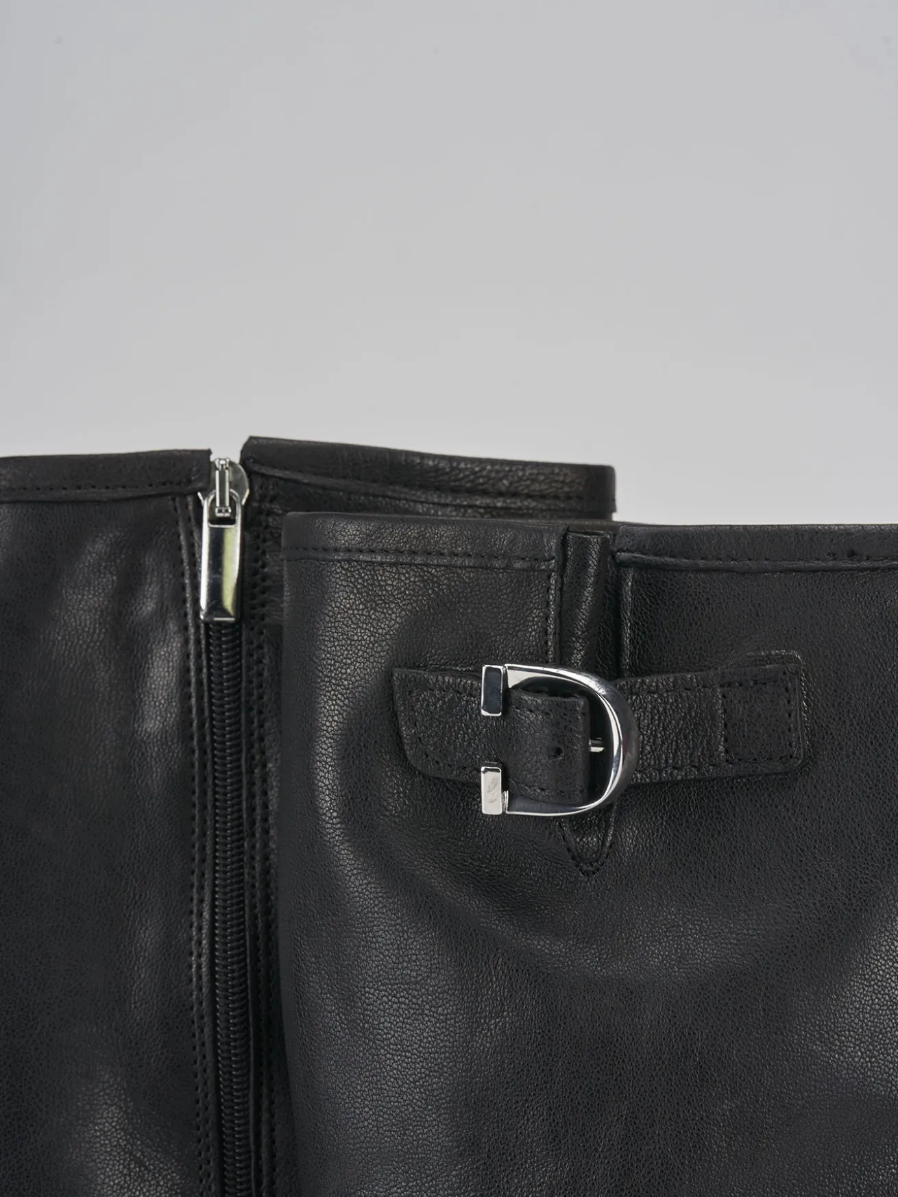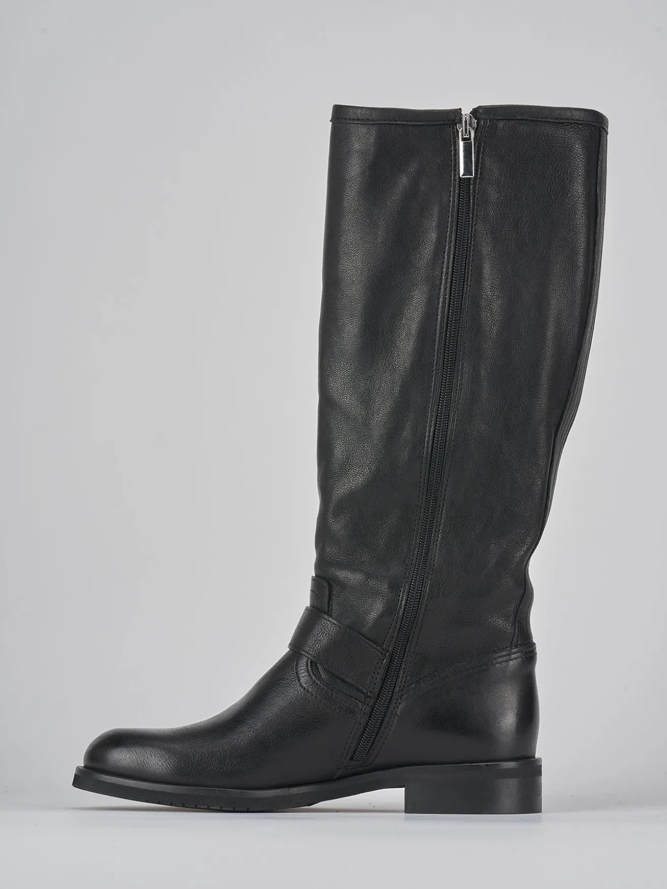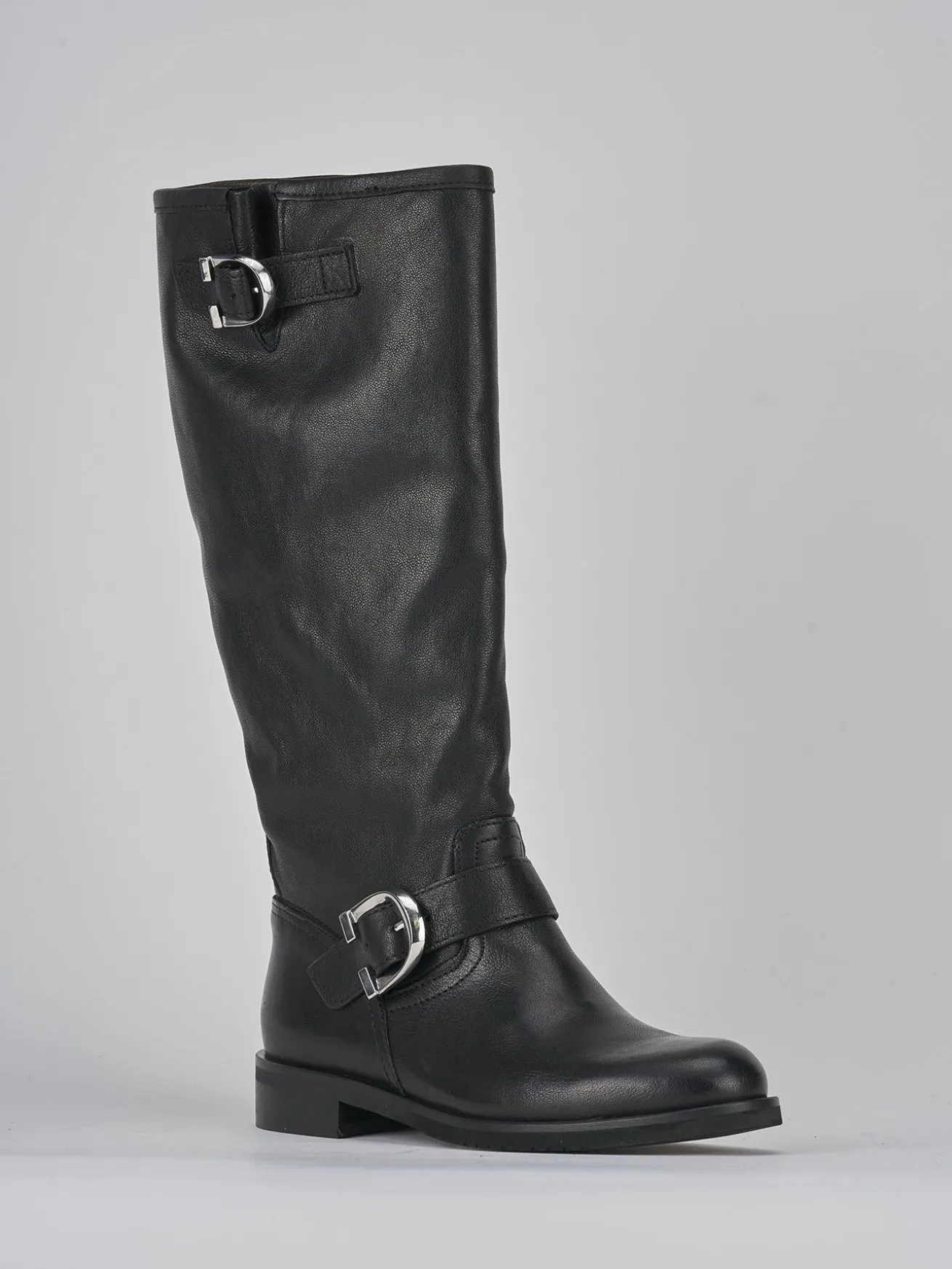 Stivale biker tacco 2 cm fondo in gomma e soletto interno in vera pelle. Tomaia in morbida pelle, punta tonda, cuciture visibili, gambale che misura appena sotto il ginocchio e fibbia regolabile in cima oltre ad una fibbia aggiuntiva a livello della caviglia. Questo stivale rappresenta un modello estremamente versatile per i tuoi look cool.