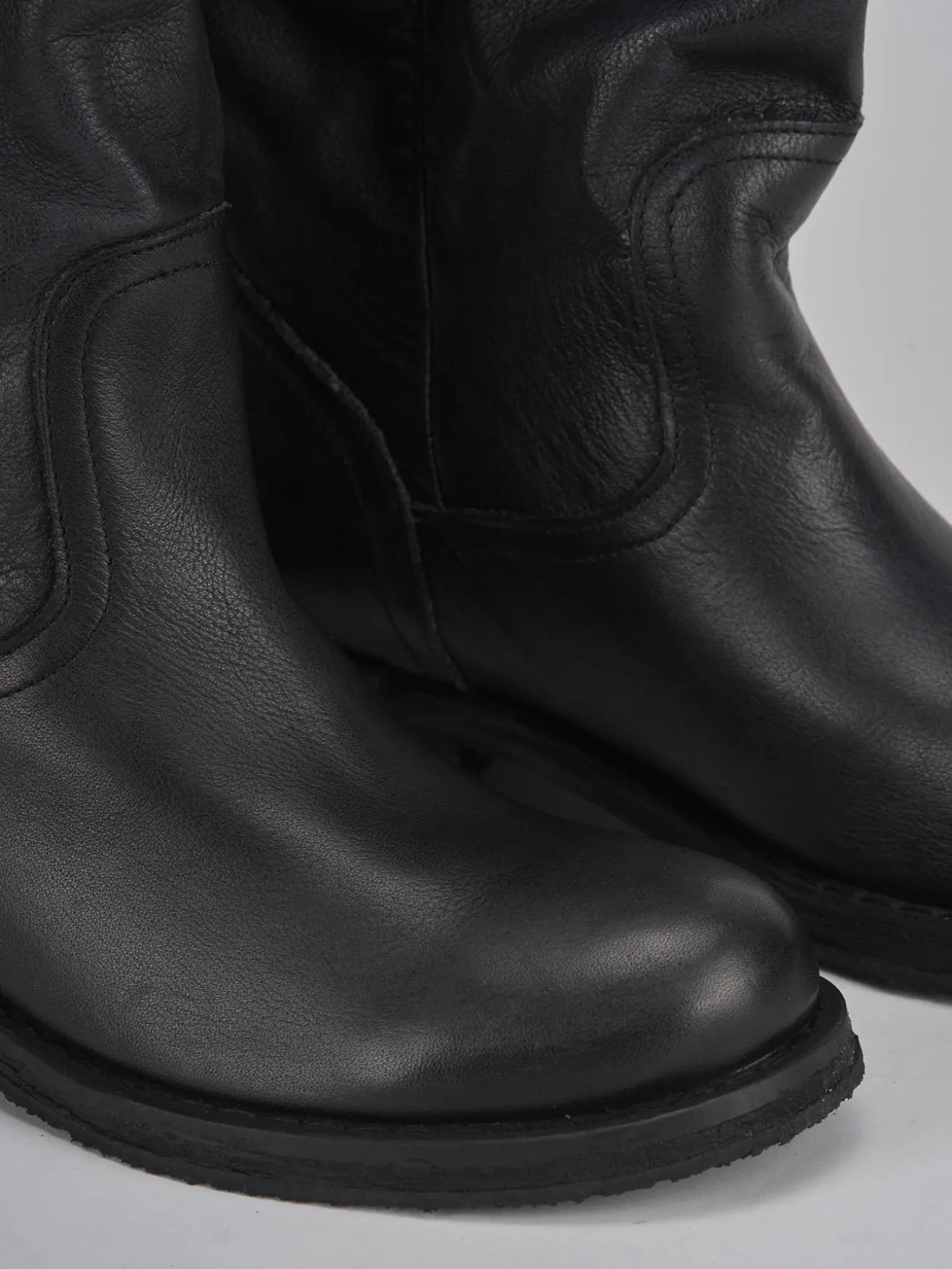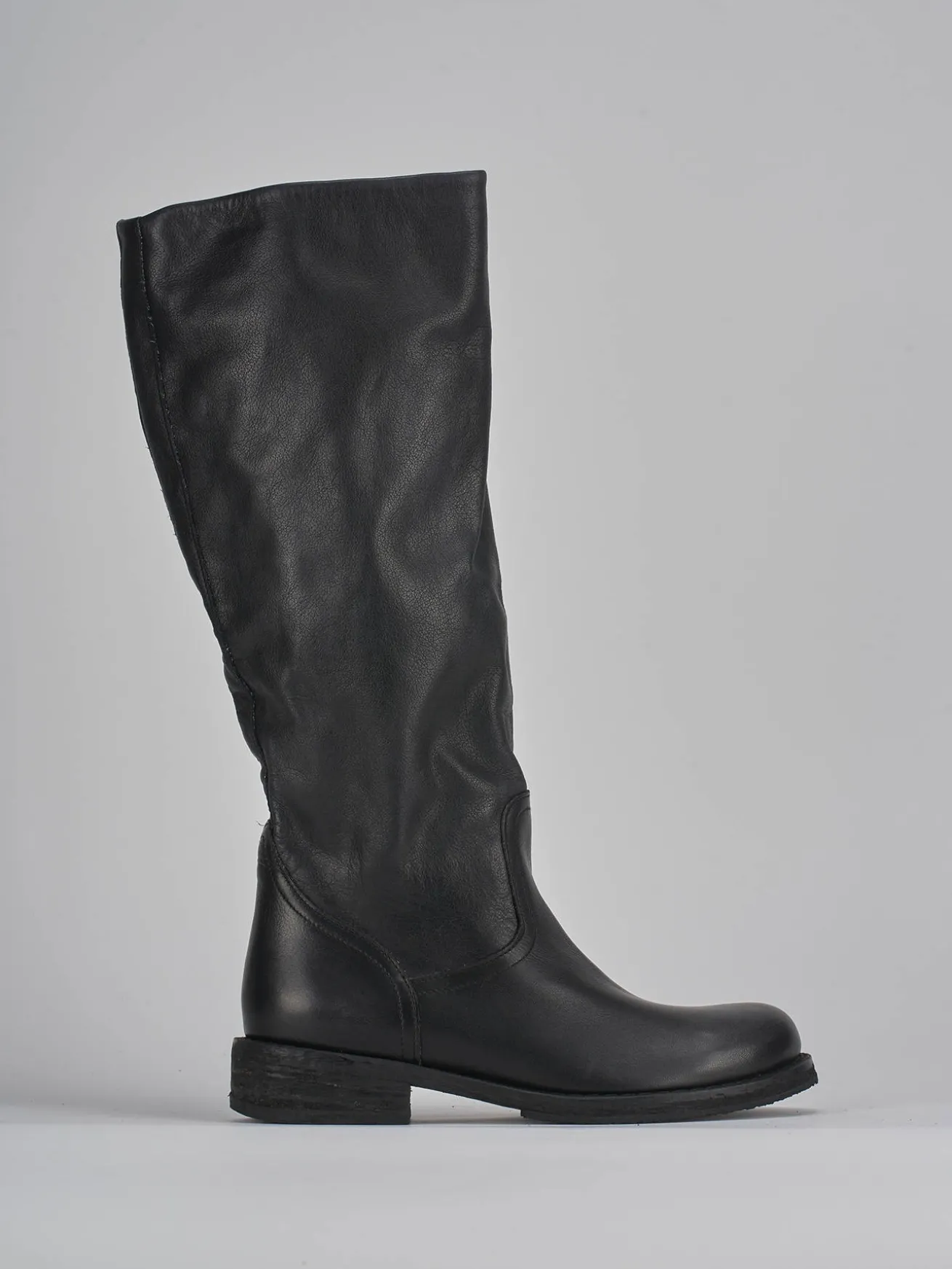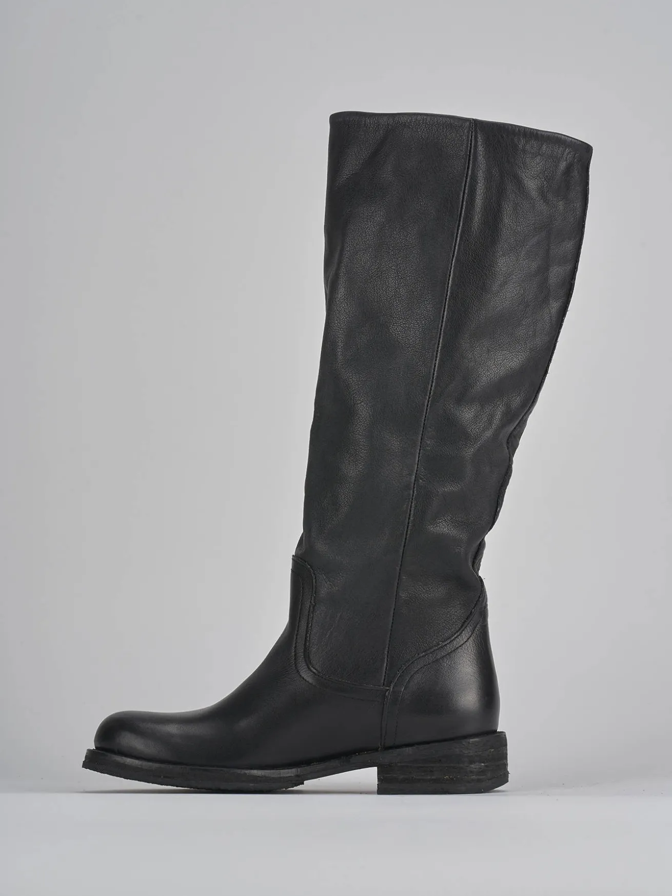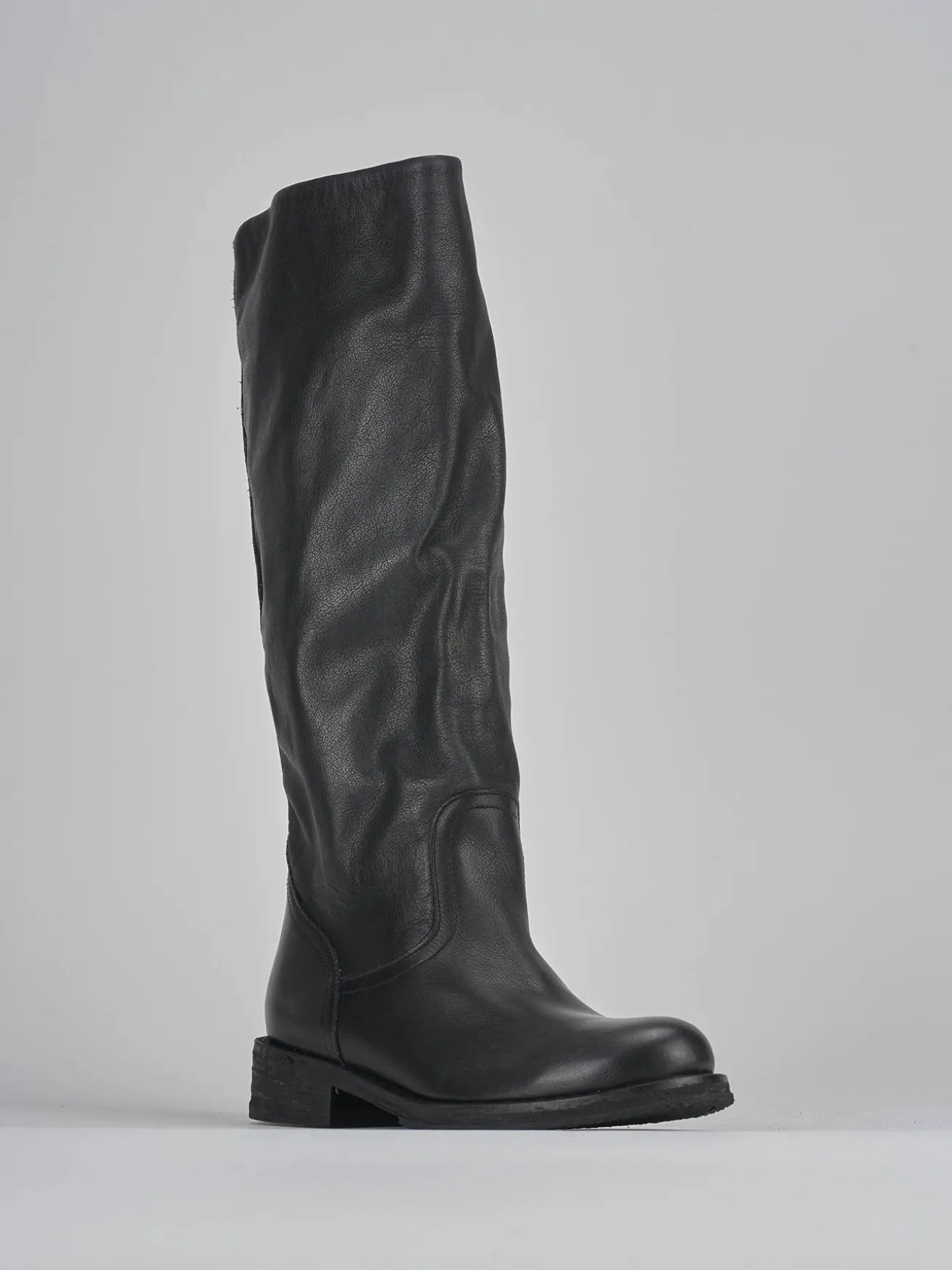Le cuciture visibili aggiungono un dettaglio sofisticato, mentre il gambale tubolare, che arriva appena sotto il ginocchio, dona un look cool e moderno.
