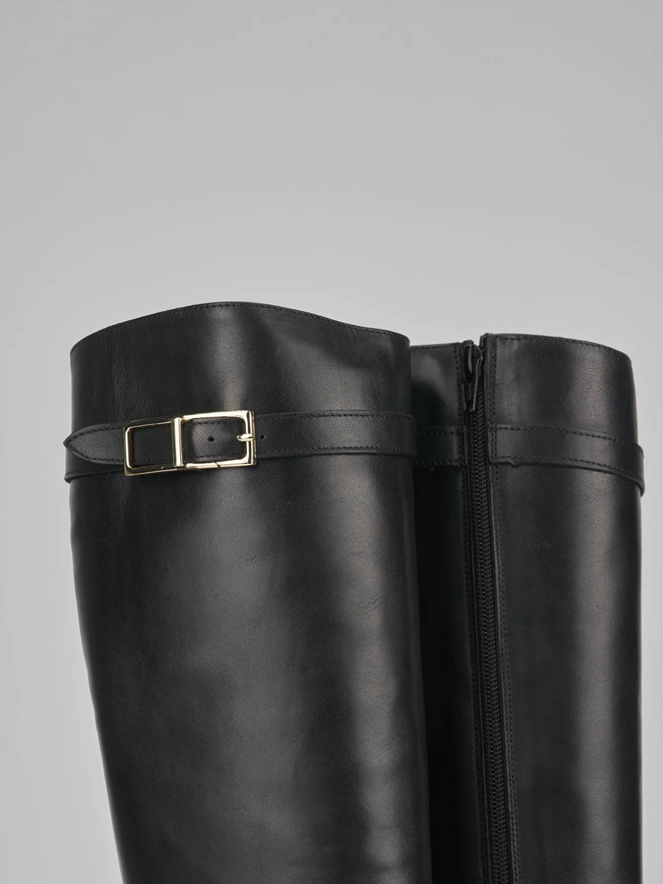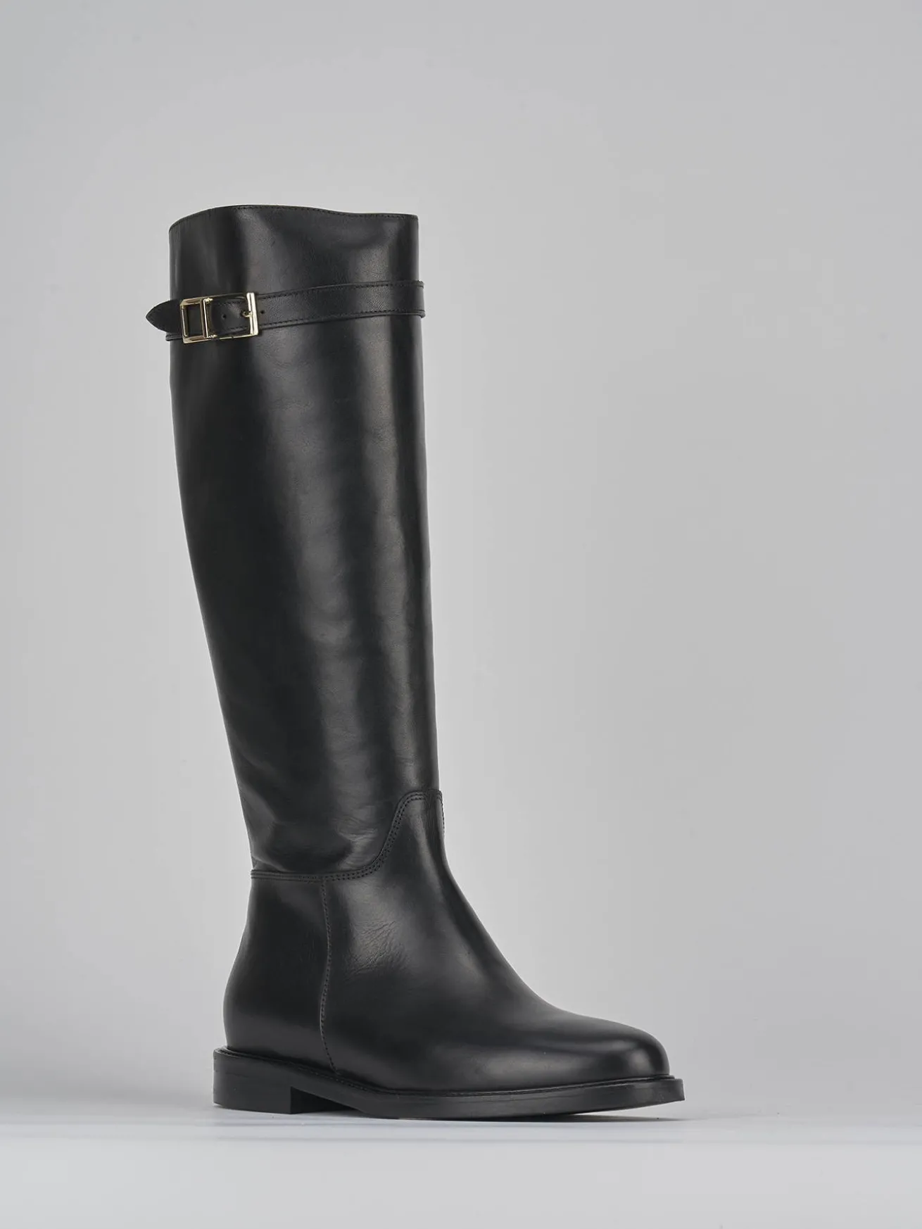 stivale tacco 2 cm fondo in gomma e soletto interno in vera pelle. tomaia in morbida pelle, punta affusolata, cinturino con accessorio all’altezza ginocchio. altezza gambale appena sotto il ginocchio e cerniera laterale. perfetto da abbinare con una minigonna e una camicia.
