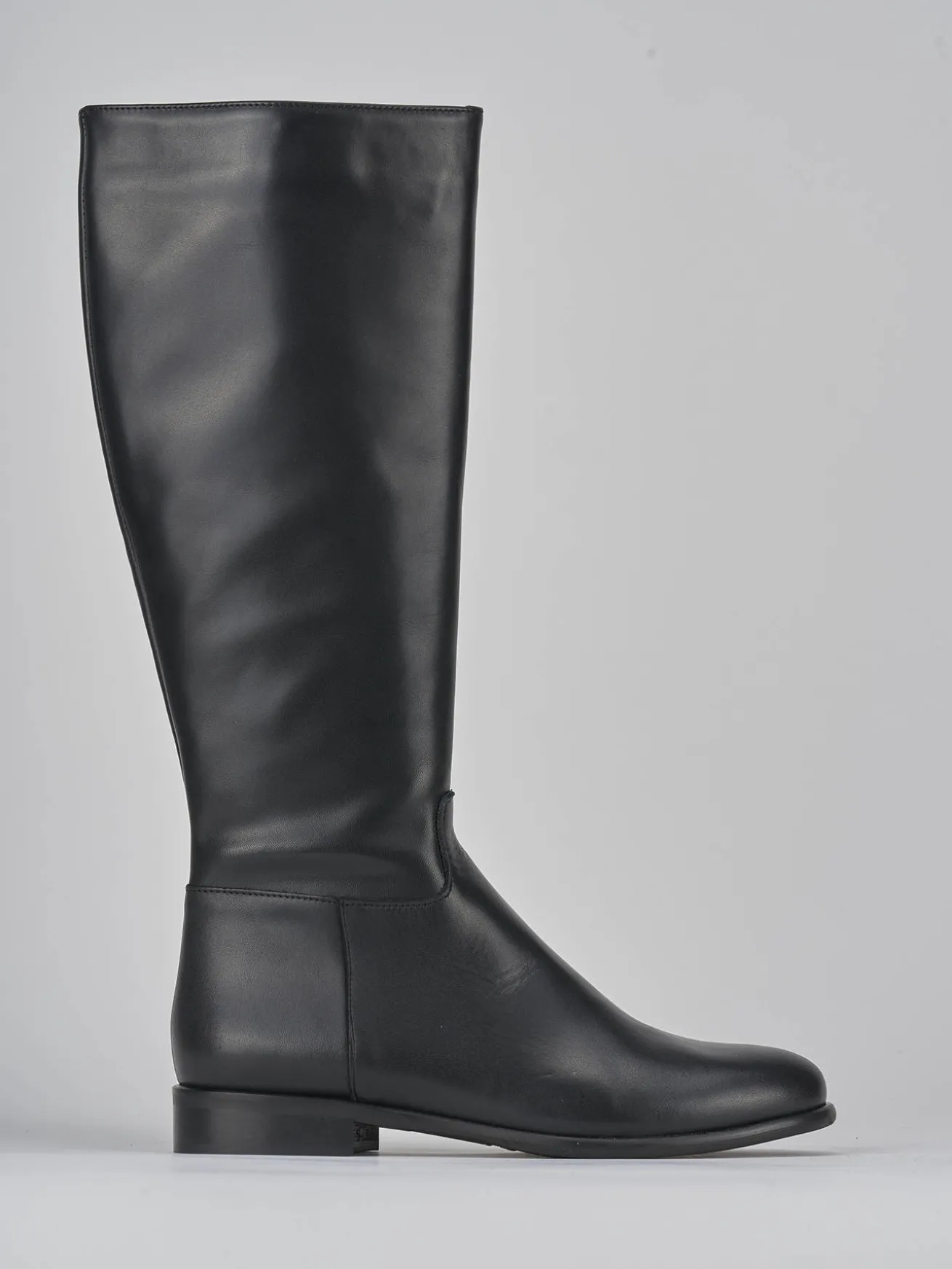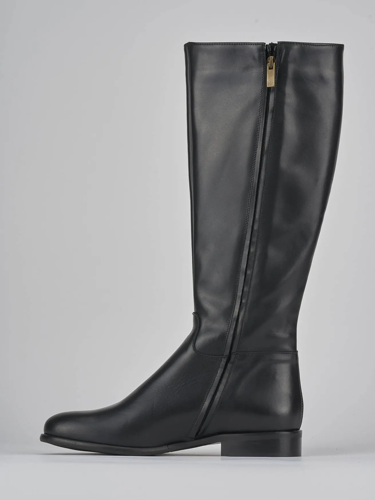 Stivale tacco 2 cm fondo in gomma e soletto interno in vera pelle. Tomaia in morbida pelle, punta tonda, gambale a tubo con altezza fino a sotto il ginocchio e comoda cerniera laterale per un look che non passa mai di moda. Comodo anche per polpacci generosi