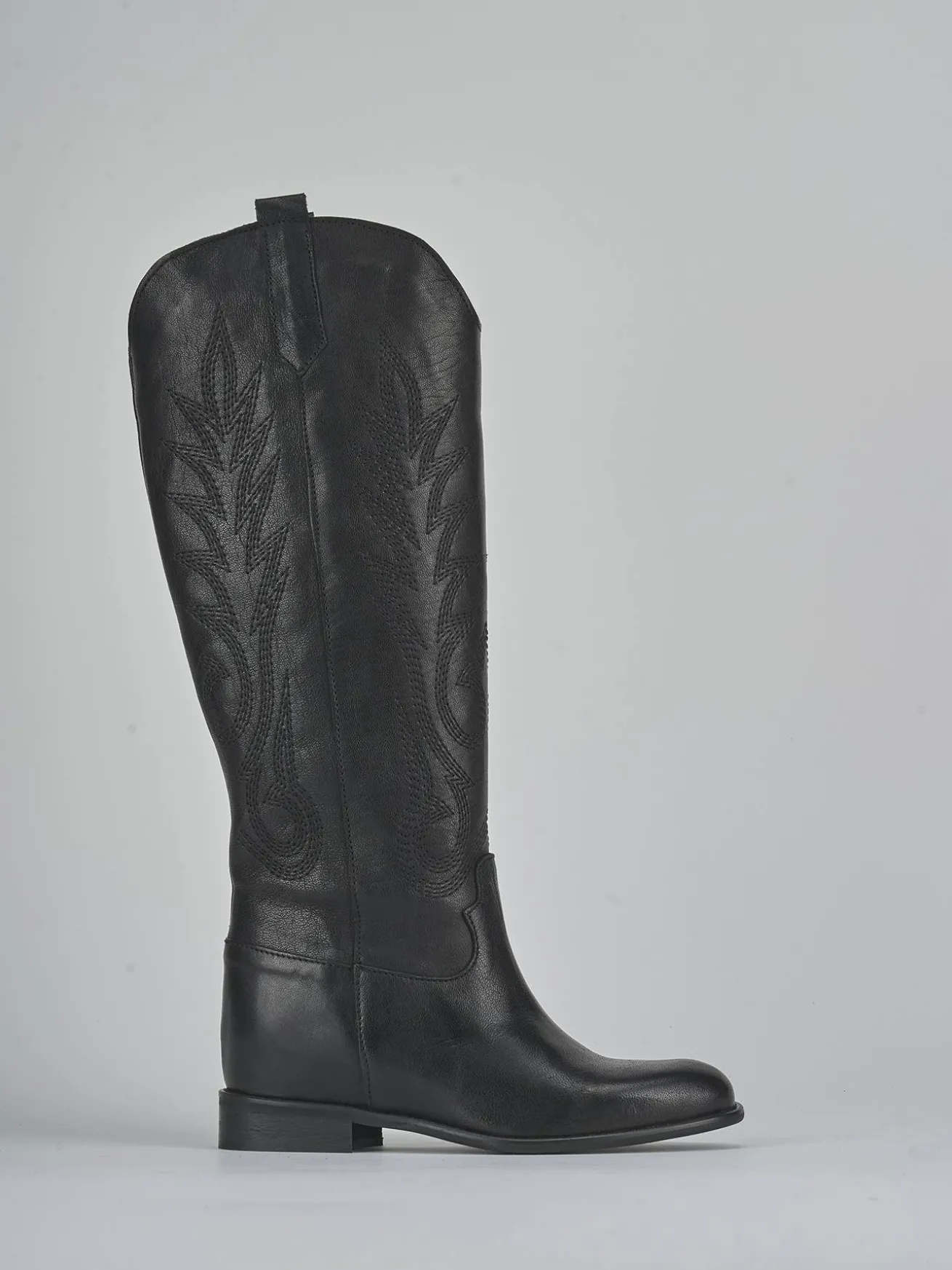 Realizzati in morbida pelle, questi stivali presentano una punta affusolata e ricami a mano sul gambale tubolare, che si ferma appena sotto il ginocchio.