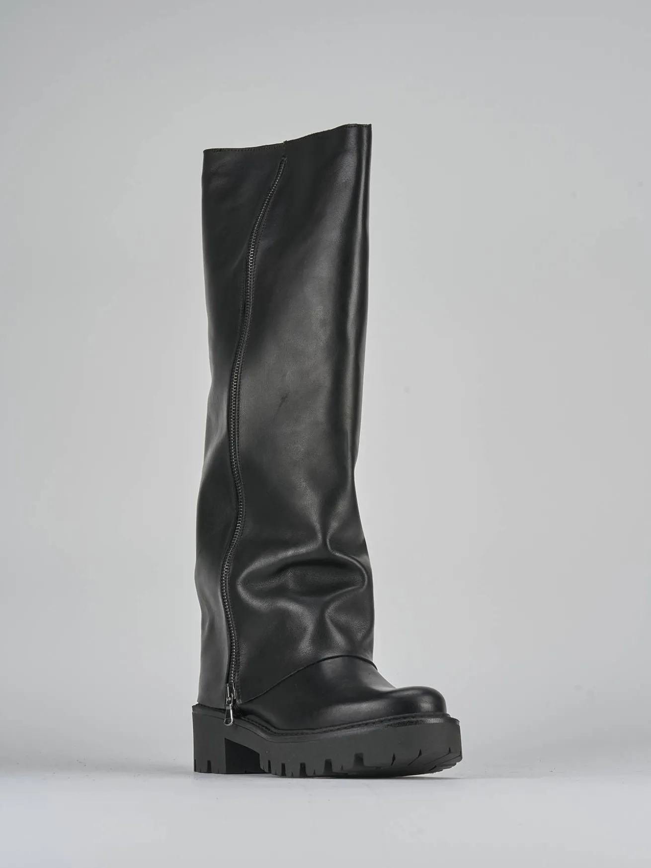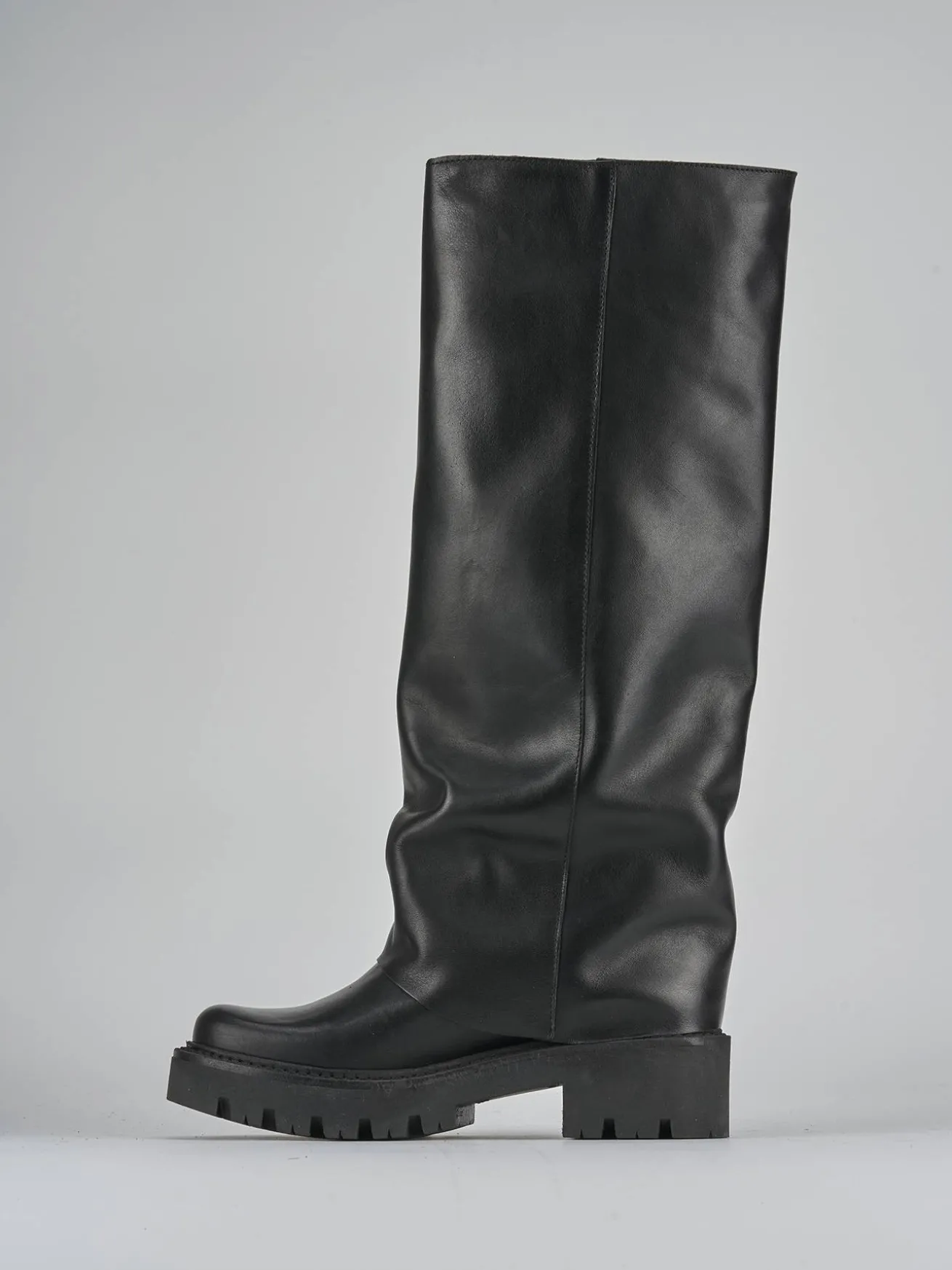 Realizzati in morbida pelle con una punta affusolata, presentano cuciture a mano sul gambale che arriva appena sotto il ginocchio.