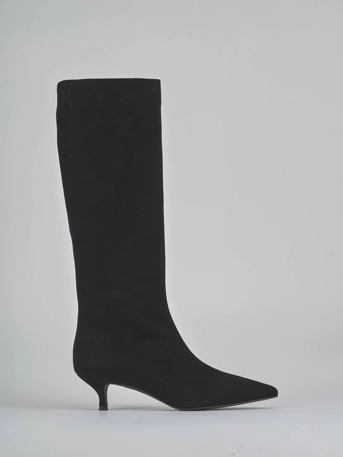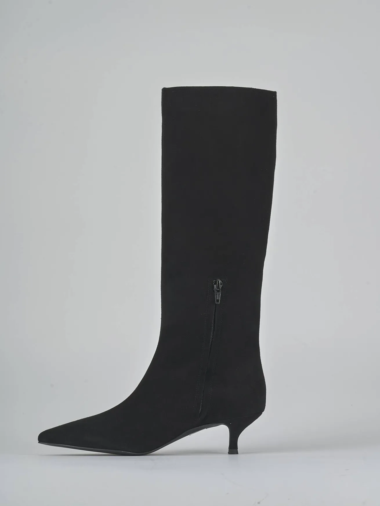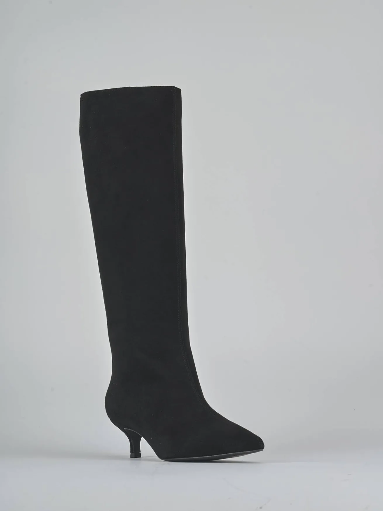 Realizzati in morbido camoscio, questi stivali presentano una punta sfilata e una cucitura a mano sul gambale, che si ferma appena sotto il ginocchio.