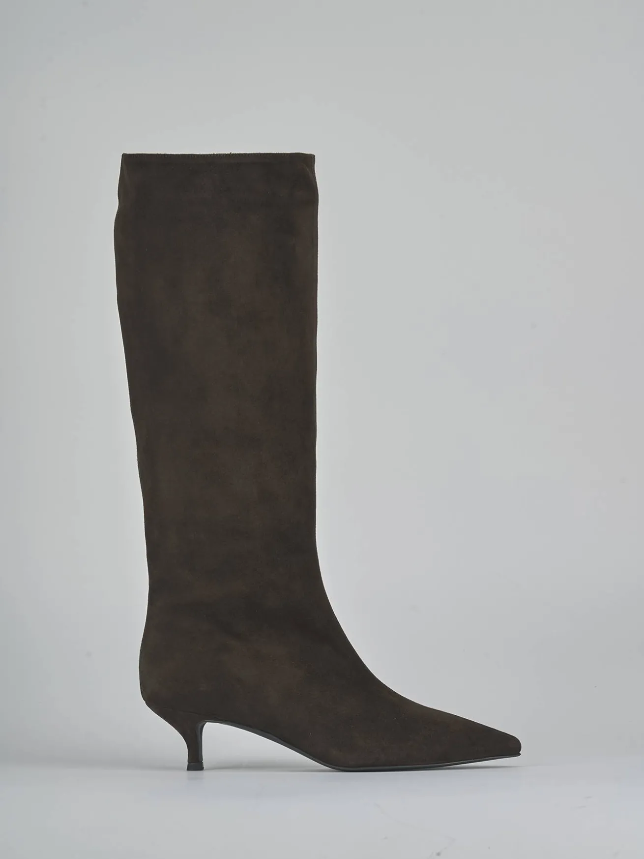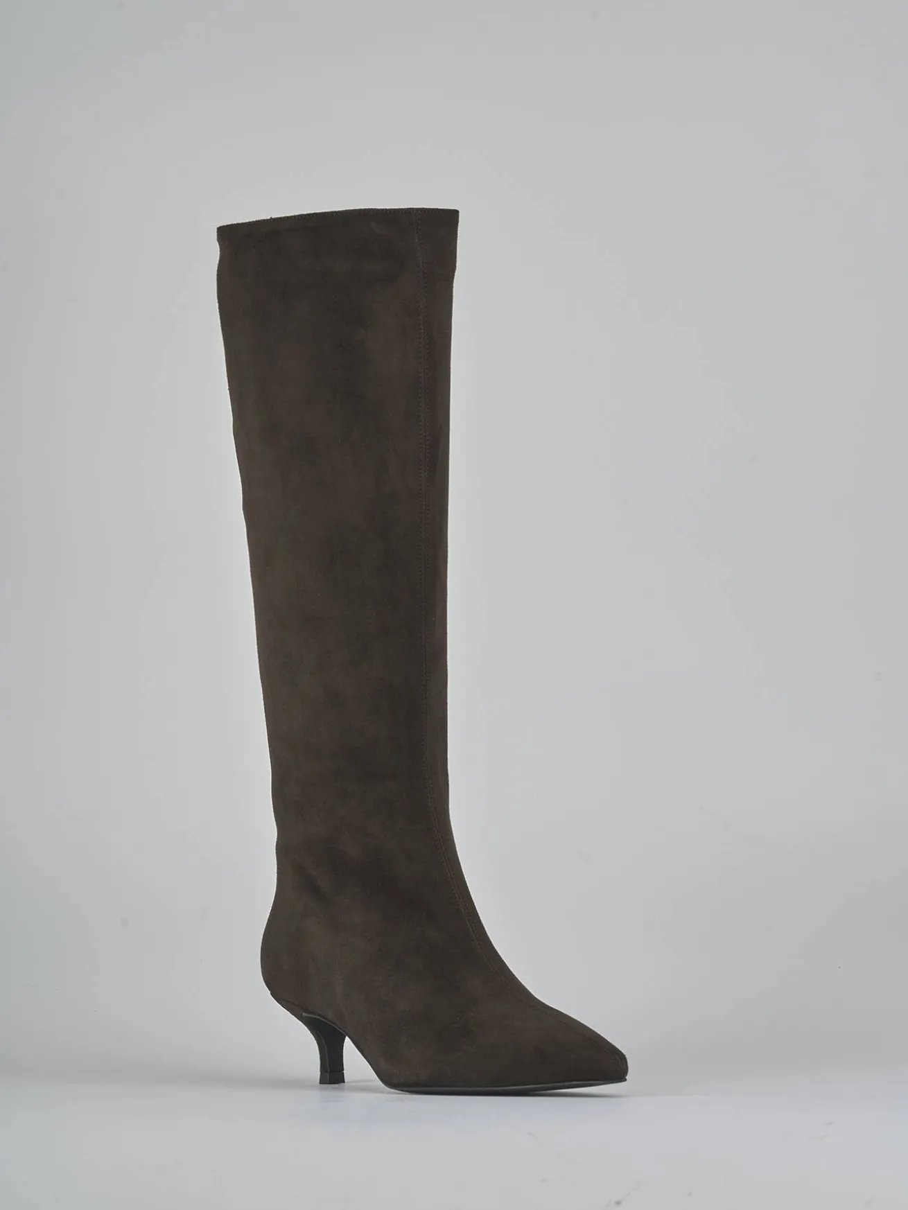 La punta sfilata e la cucitura a mano sul gambale, che si ferma appena sotto il ginocchio, aggiungono dettagli raffinati.
