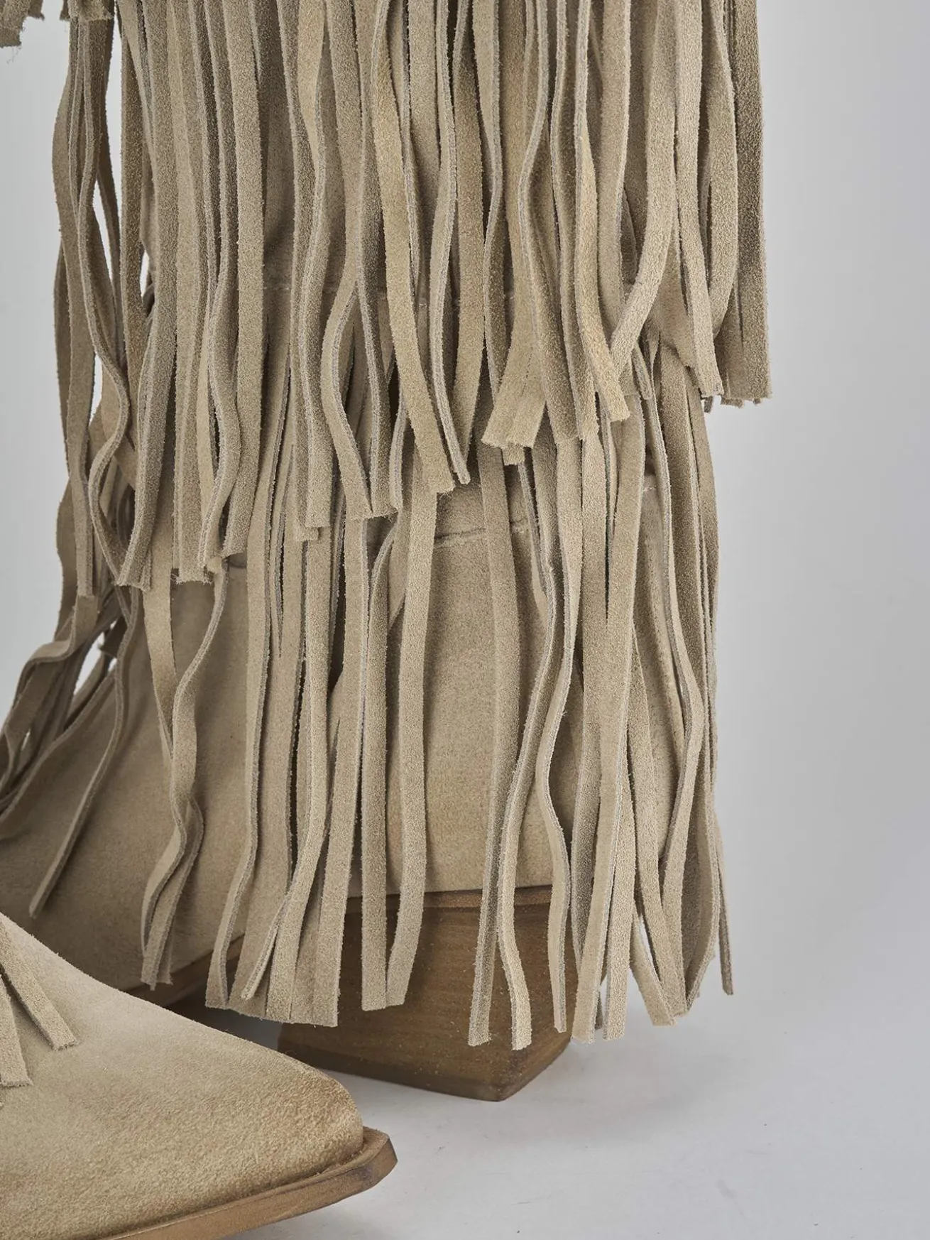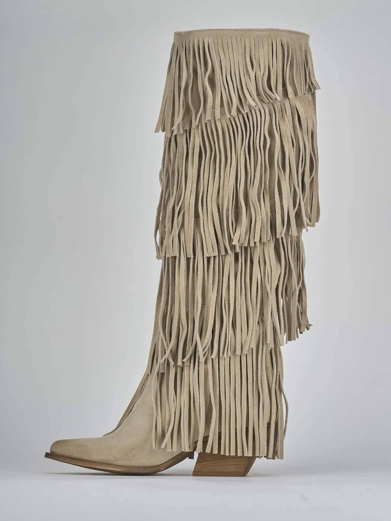 Stivale texano tacco 5 cm fondo in gomma e soletto interno in vera pelle. Tomaia in morbida pelle scamosciata, punta sfilata, frange lunghe sul gambale che misura appena sotto il ginocchio. Tacco cubano, gambale ampio, è perfetto con una gonna o un vestito.