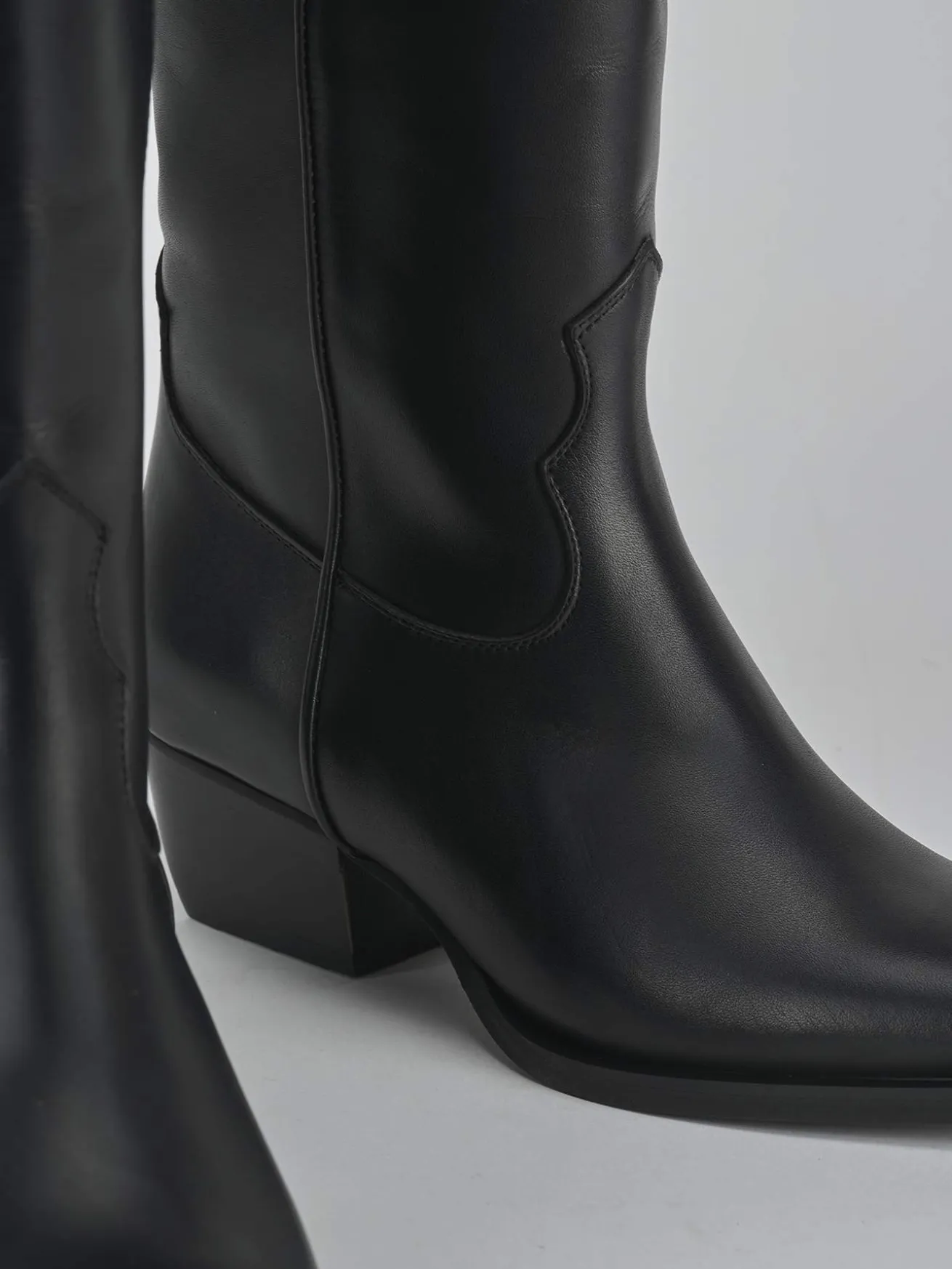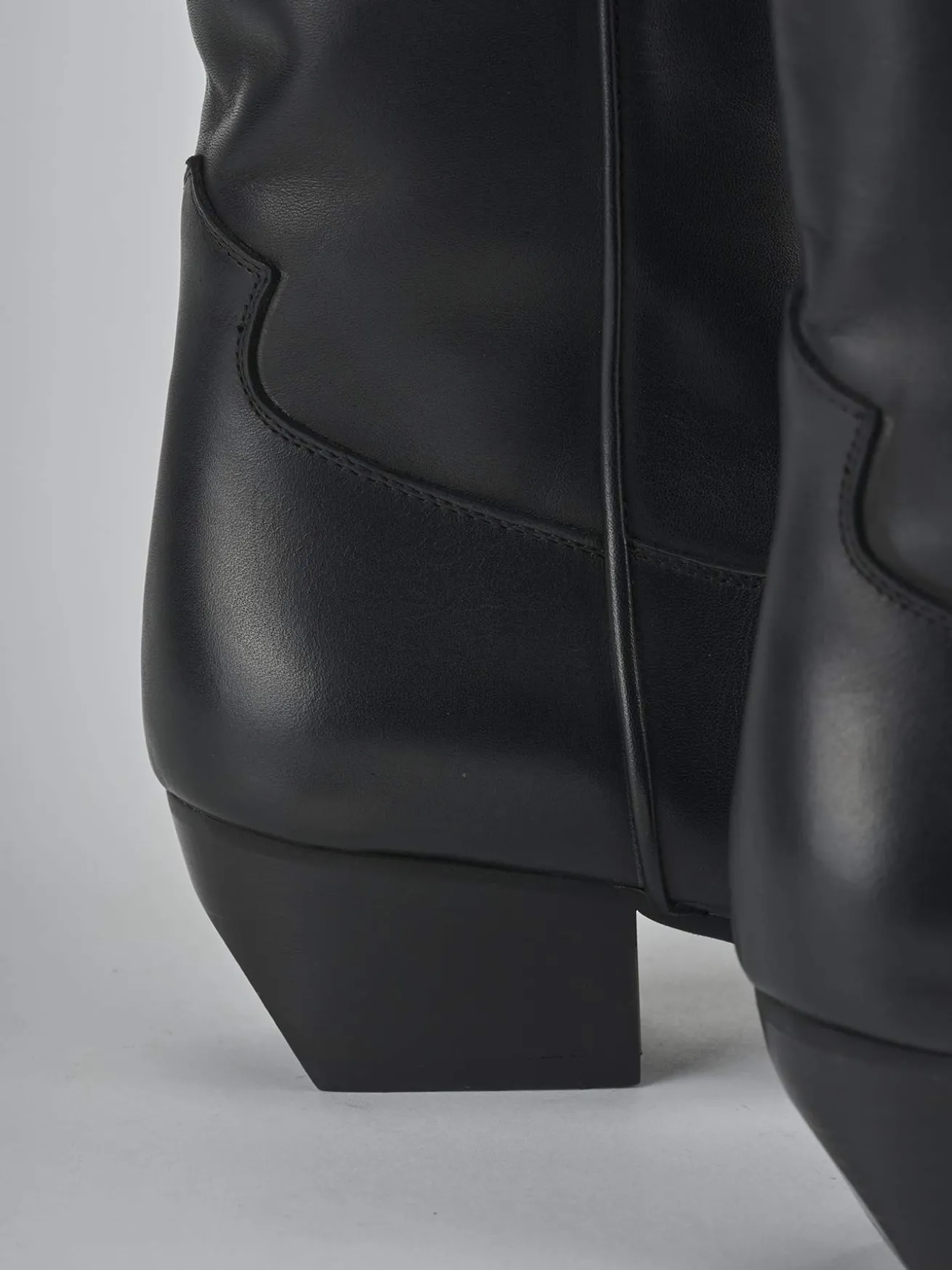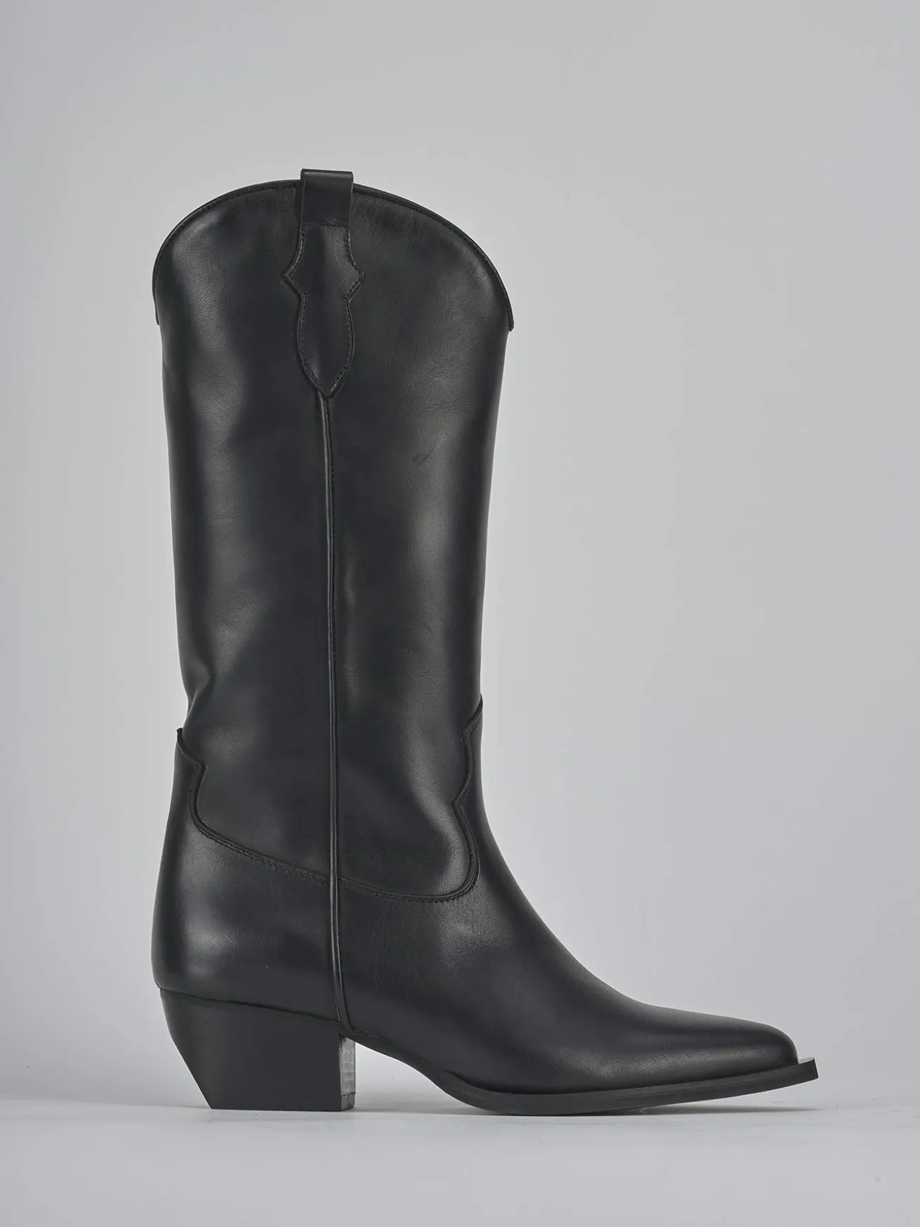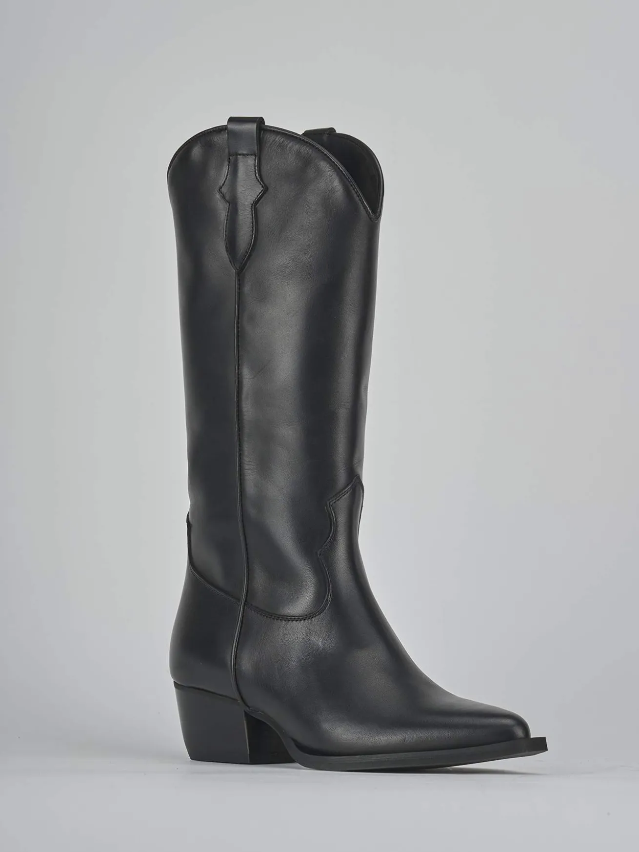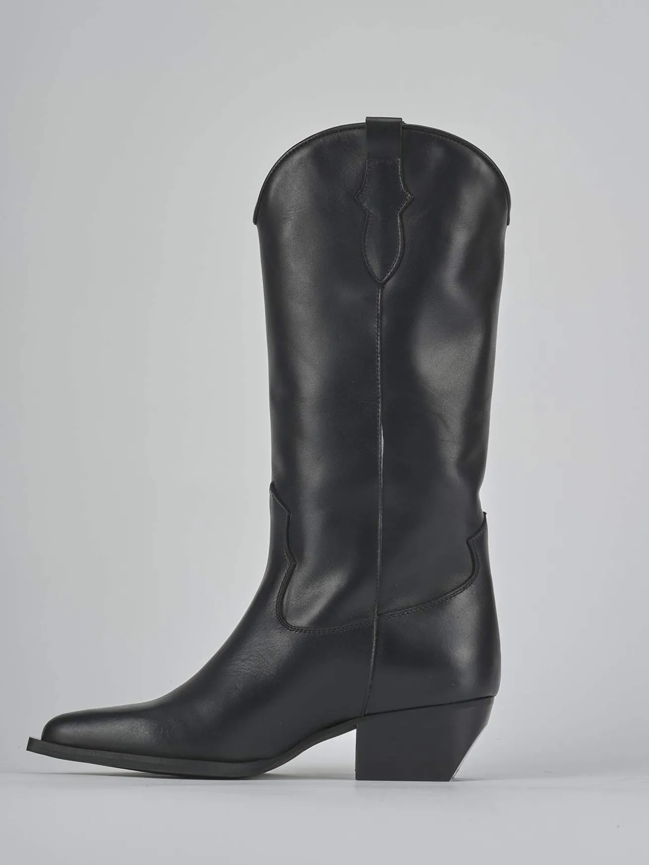 Stivale texano tacco 5 cm fondo in gomma e soletto interno in vera pelle. Tomaia in morbida pelle, punta sfilata, cuciture a mano visibili sul gambale che misura appena sotto il ginocchio, ghette e tacco cubano. Apertura a ‘V’ frontale per un look cool.