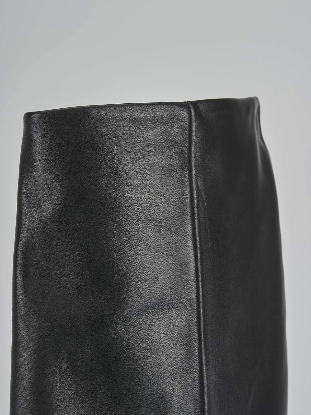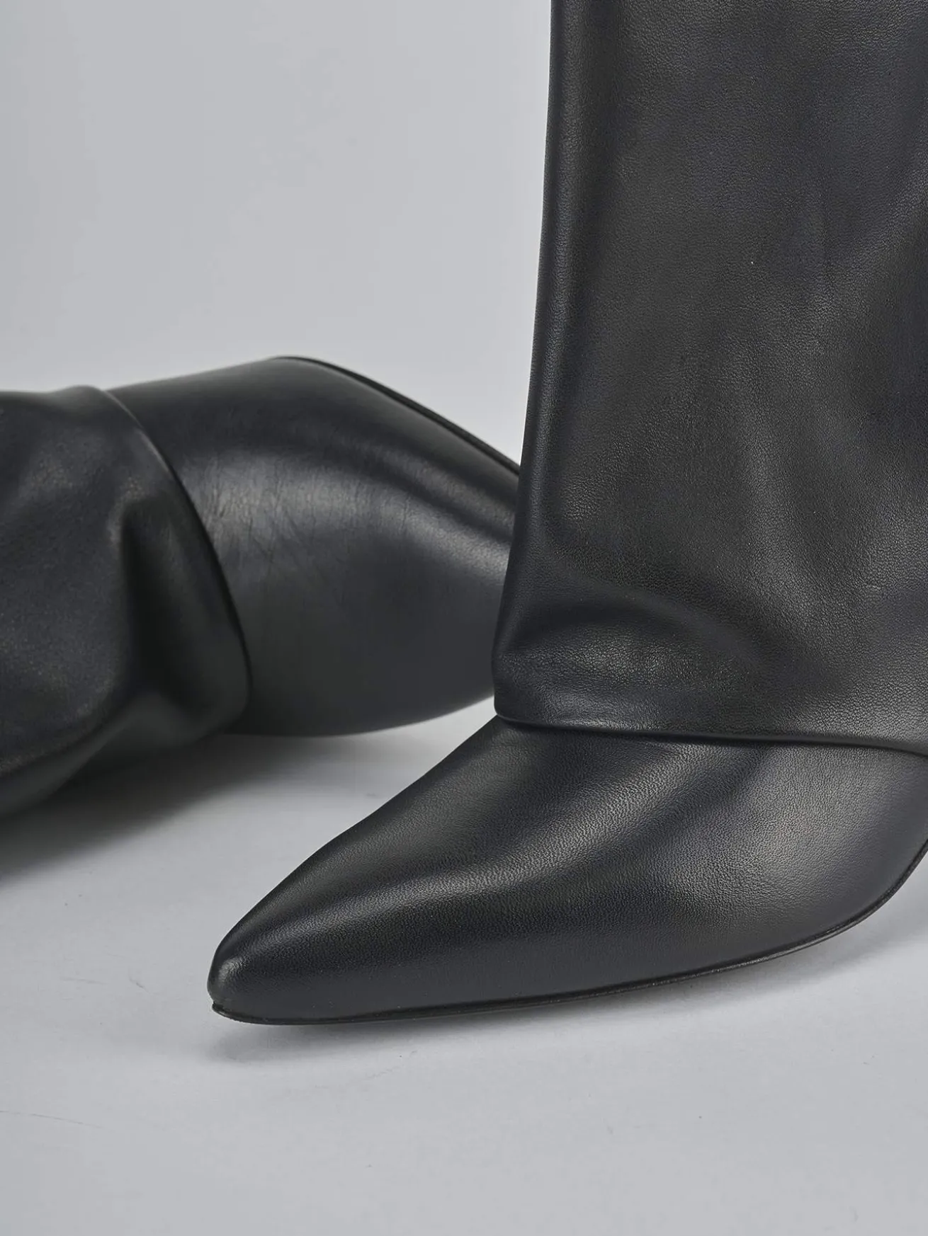 Stivale tacco 5 cm fondo in cuoio e soletto interno in vera pelle. Tomaia in morbida nappa , punta sfilata, cuciture visibili, altezza gambale fino al ginocchio ricoperto da un risvolto fino al tacco e tacco fino rocchetto. Per un look cool.