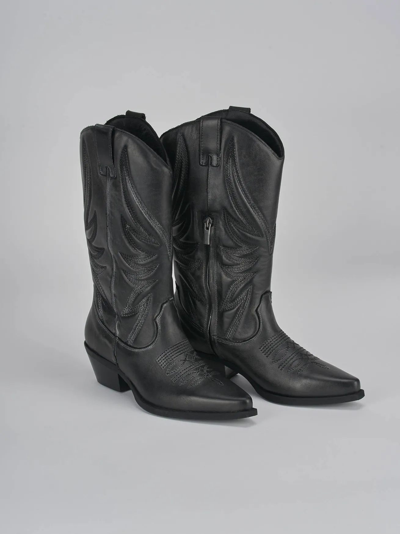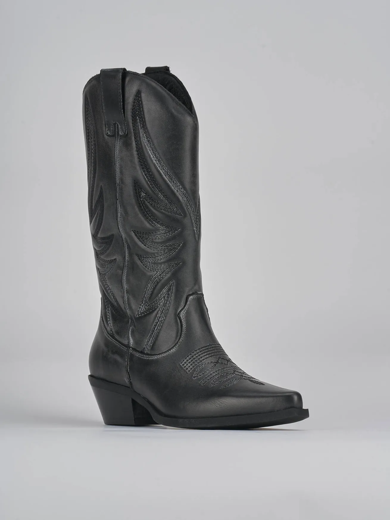 Stivale tacco 5 cm fondo in gomma e soletto interno in vera pelle. Tomaia in morbido vitello, punta sfilata, raffinati ricami sul collo del piede e sul gambale che misura 3/4 del polpaccio. dettaglio del guardolo sporgente, ghette e comoda cerniera laterale. perfetto con una gonna o pantaloni ampi a pinocchietto.