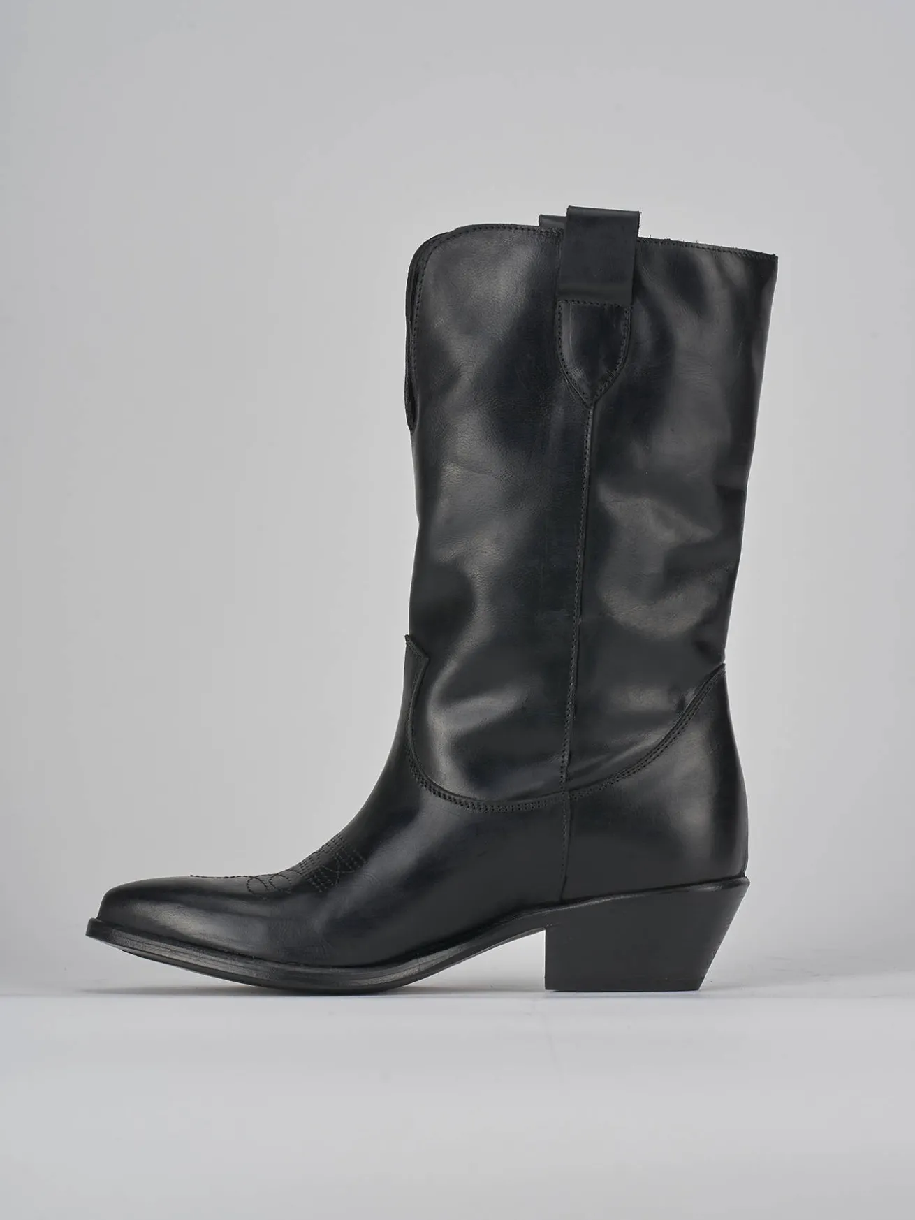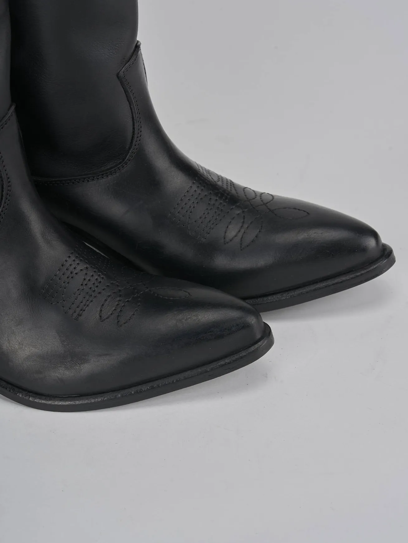 Stivale texano tacco 5 cm fondo in cuoio e soletto interno in vera pelle. Tomaia in pelle di ottima qualità, punta sfilata, ricami in tinta sulla punta del piede, ghette e apertura frontale a forma di V sul gambale per un tex look cool. altezza gambale a 3/4 del polpaccio.
