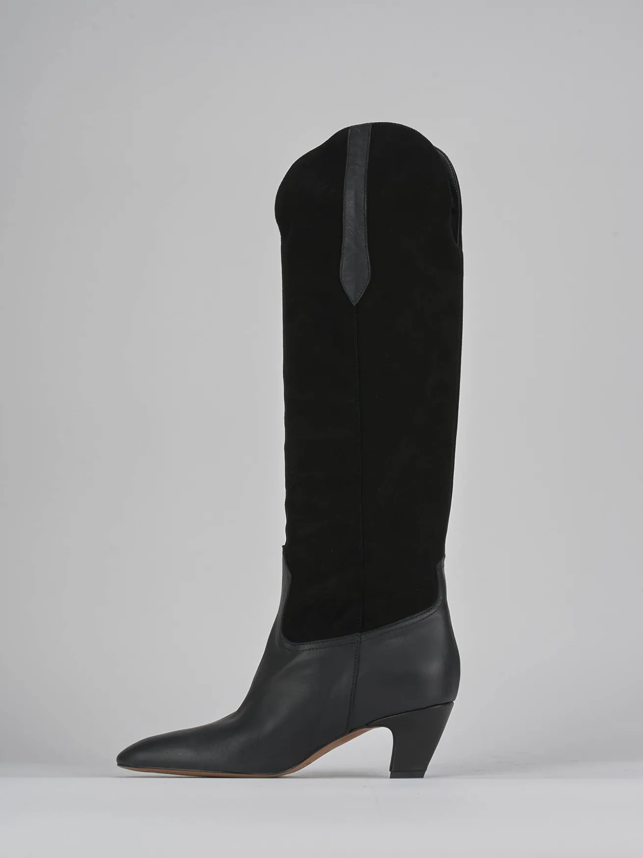 Stivale tacco 5 cm fondo in gomma e soletto interno in vera pelle. Tomaia in morbida pelle, punta sfilata, cuciture visibili, ghette, gambale scamosciato che misura appena sotto il ginocchio con apertura a V per un richiamo allo stile texano.
