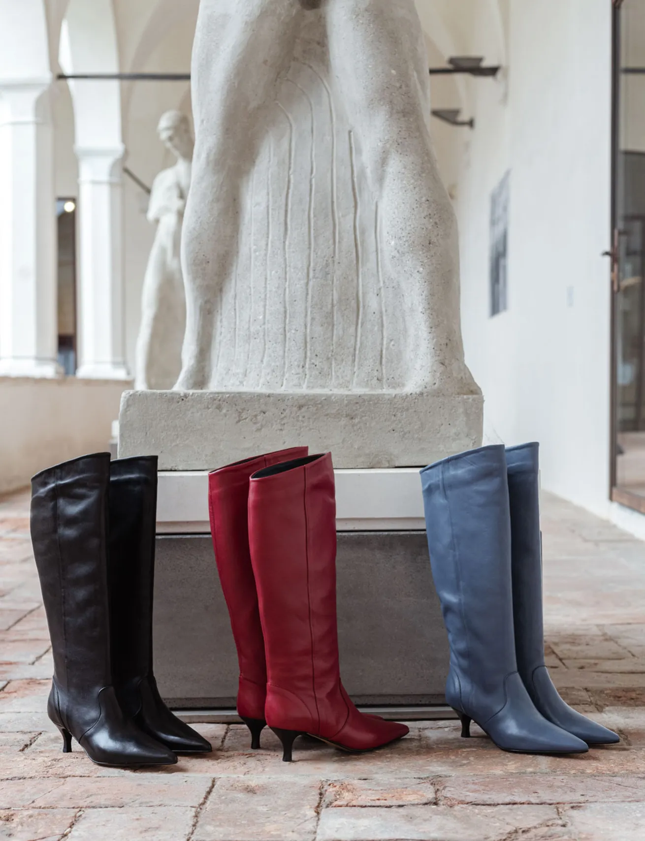 Stivale tacco 5 cm fondo in leggera gomma e soletto interno in vera pelle. Tomaia in morbida pelle, punta sfilata, cuciture a vista, cerniera laterale interna e nuovissimo tacco rocchetto. gambale tubolare che misura appena sotto il ginocchio con taglio obliquo per un look che ti farà notare.