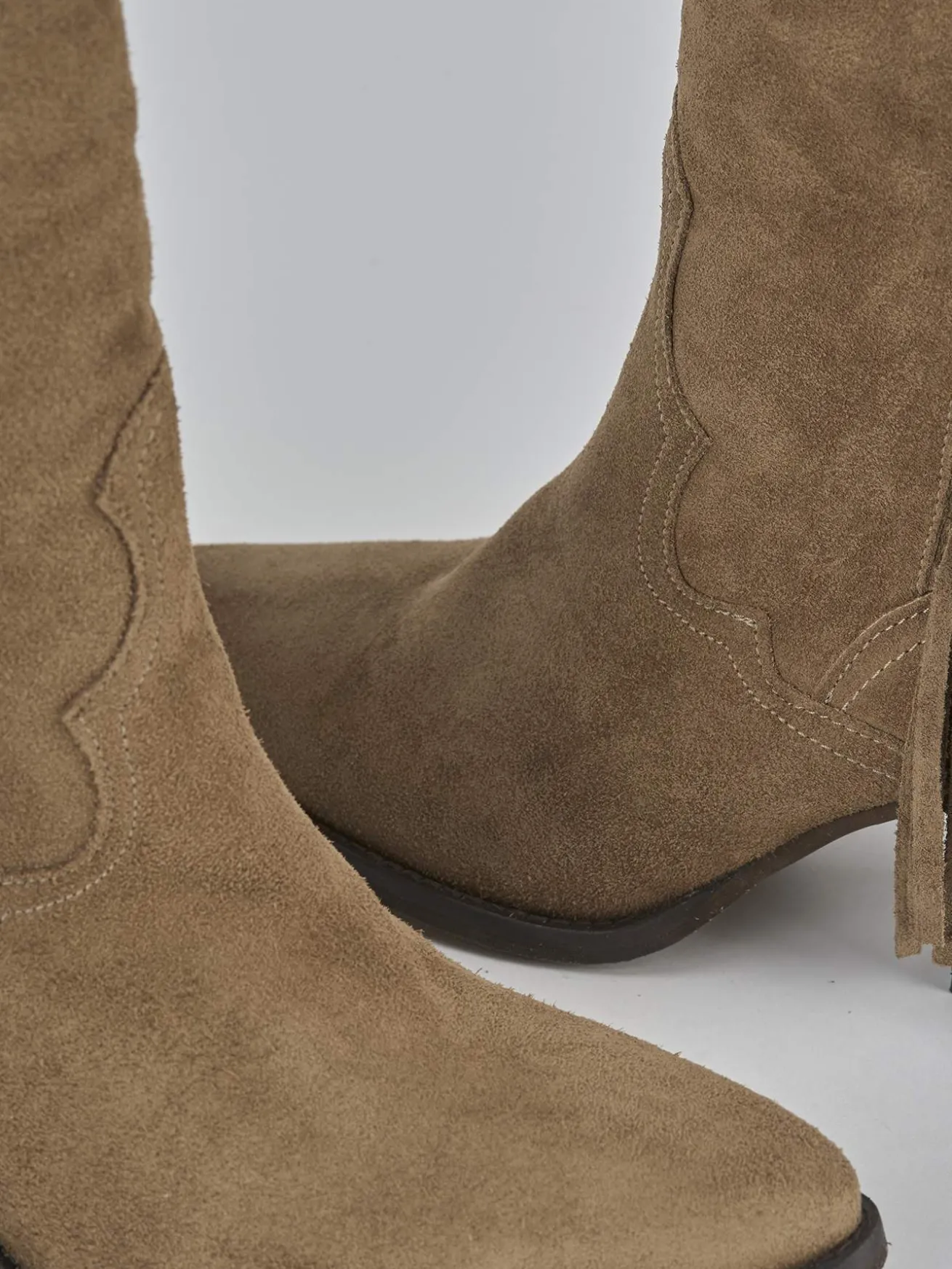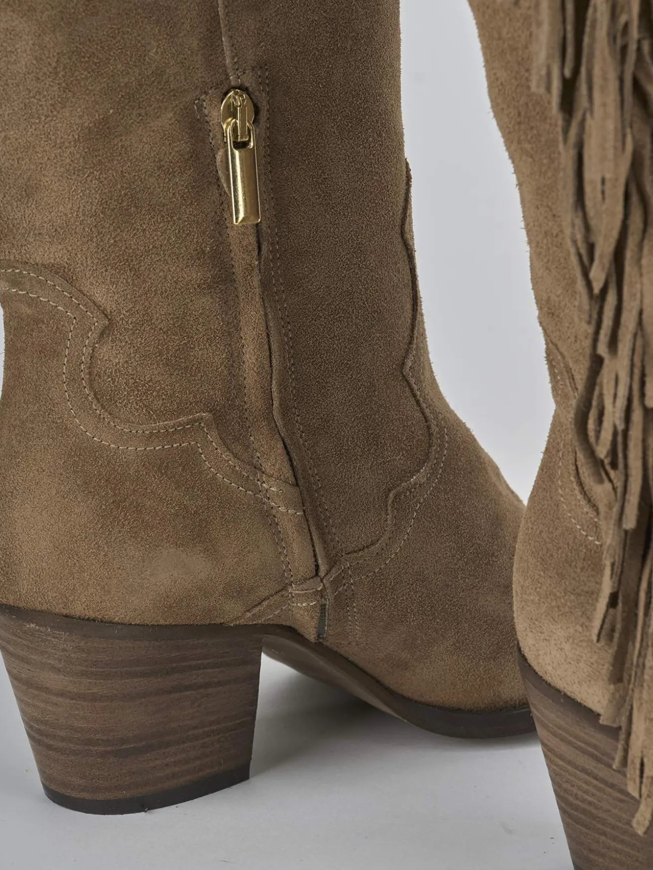 Stivale tacco 6 cm fondo in gomma e soletto interno in vera pelle. Tomaia in morbida pelle scamosciata, punta sfilata, comoda cerniera laterale, ghette sul gambale che misura appena sotto il ginocchio, frange laterali e tacco cubano. Apertura davanti a ‘V’ sul gambale. Versatile per ogni tua occasione.