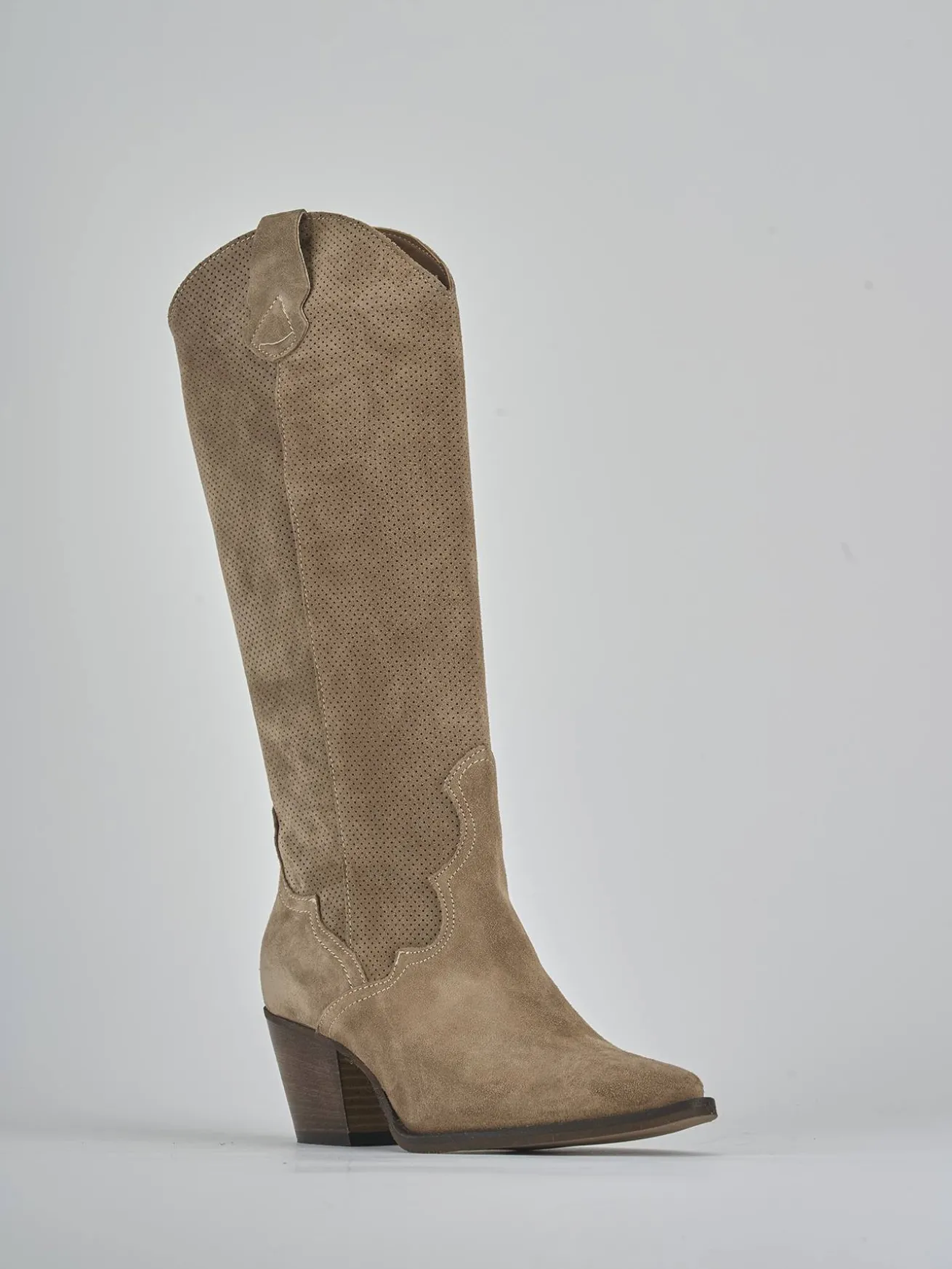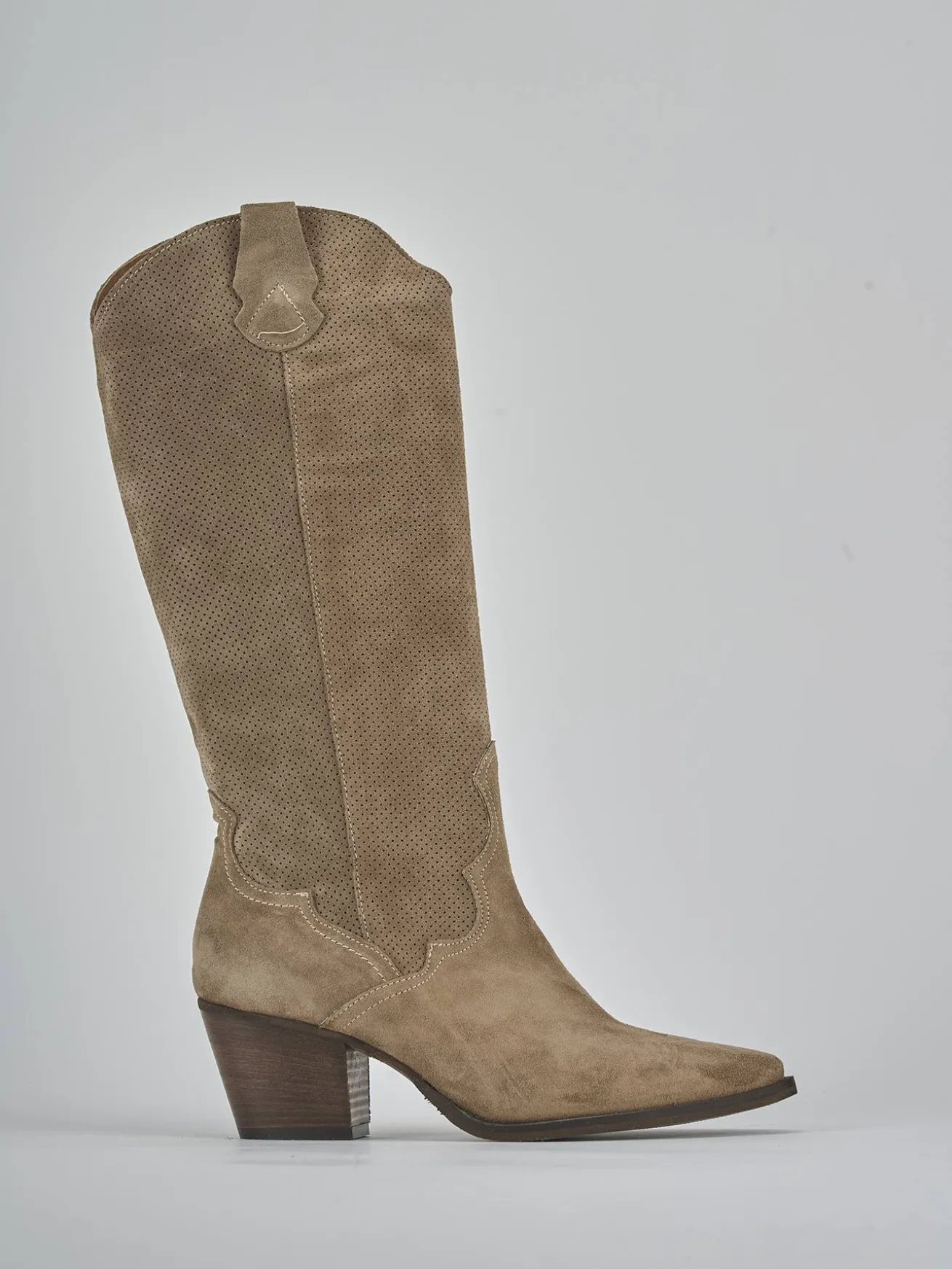 Stivale texano tacco 6 cm fondo in gomma e soletto interno in vera pelle. Tomaia in morbida pelle scamosciata, punta sfilata, cuciture a mano, comoda cerniera laterale, forato, ghette che mantegono la forma del gambale che arriva appena sotto il ginocchio e tacco grosso. Dal design ricercato per un look cool.
