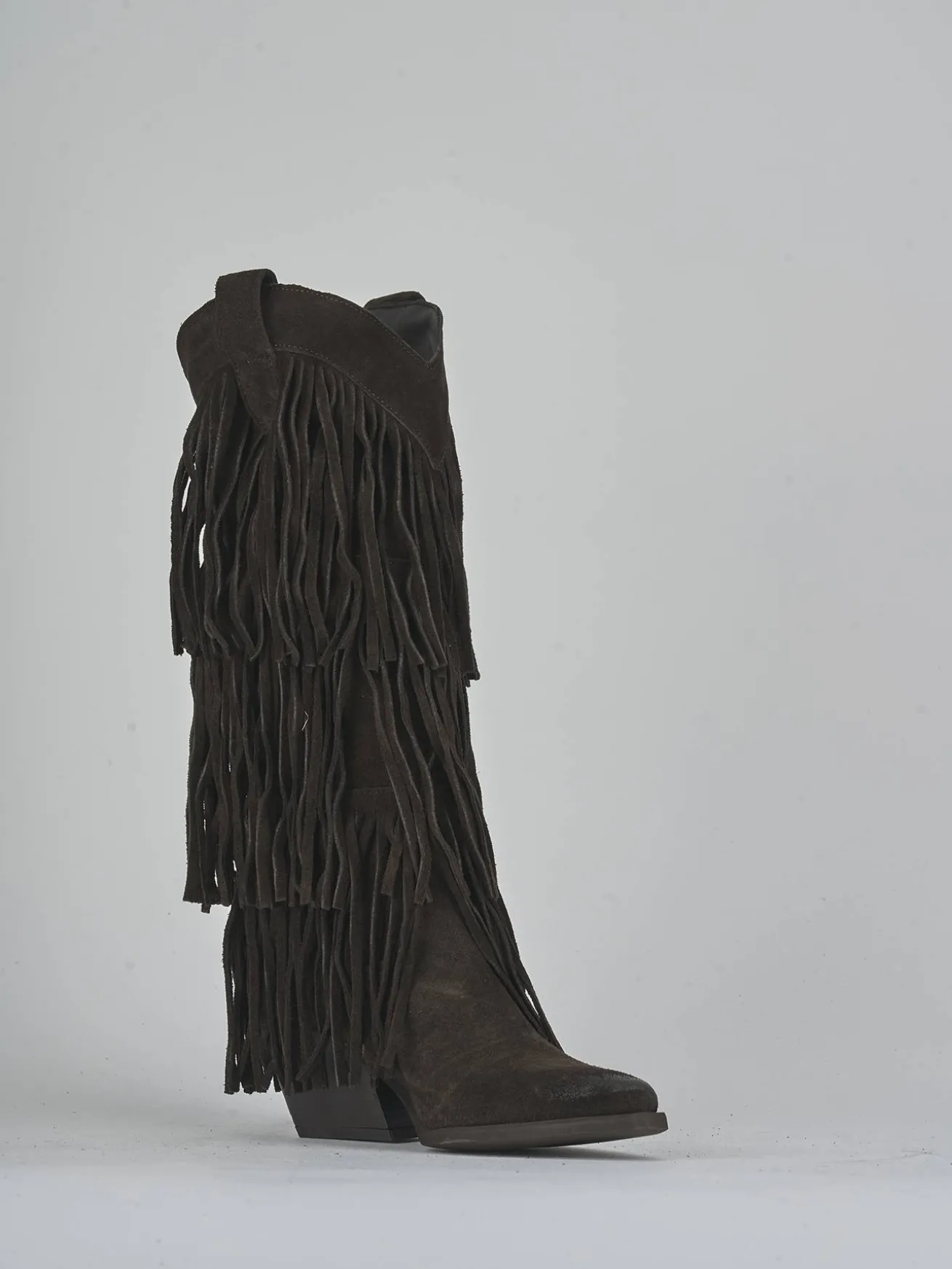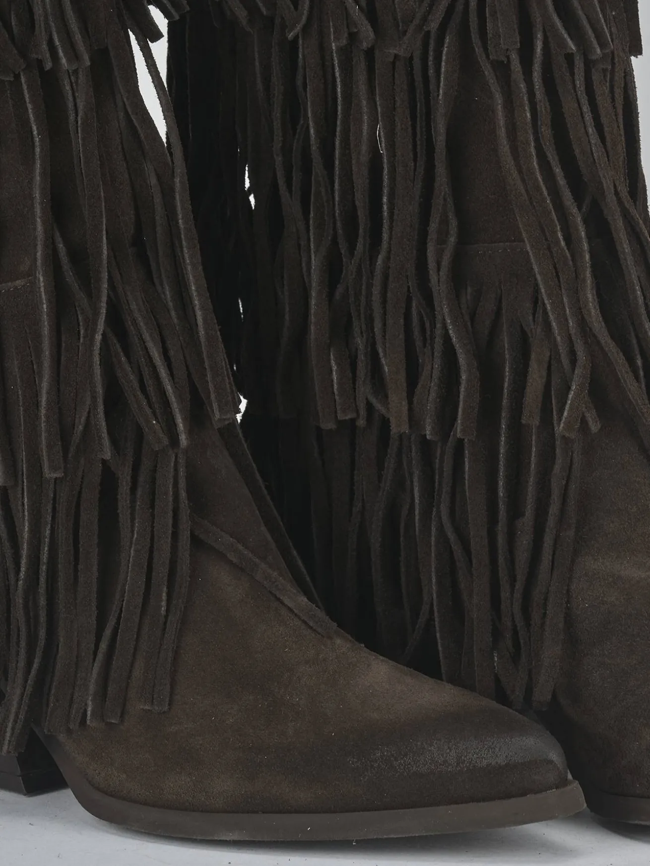 Realizzati in morbido camoscio, questi stivali presentano una punta sfilata e frange accattivanti che catturano l’attenzione a ogni passo.