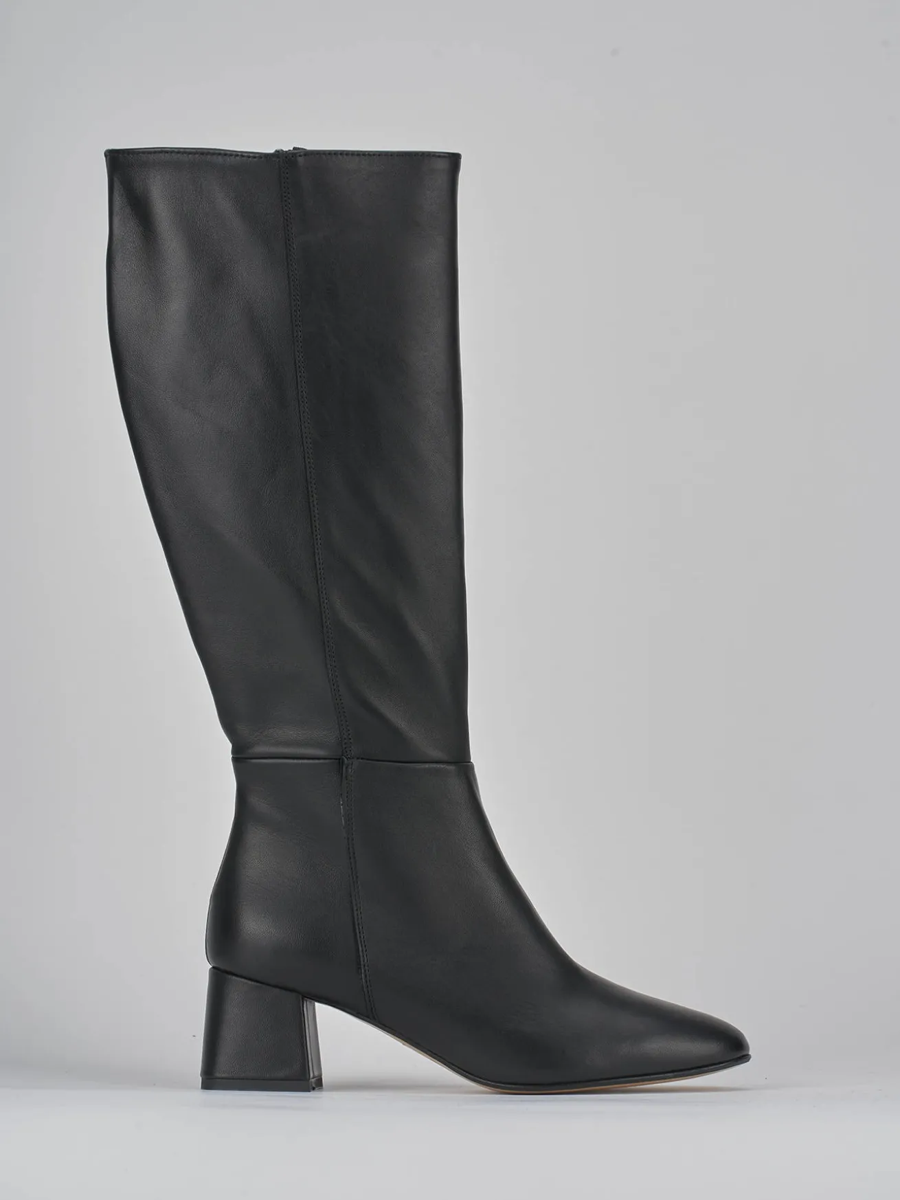 stivale tacco 5.5 cm fondo in leggera gomma e soletto interno in vera pelle. tomaia in morbida pelle nappata, punta affusolata, gambale tubolare foderato che misura appena sotto il ginocchio, cerniera laterale, fondo liscio e tacco grosso. la scarpa classica d’eccellenza per un look cool tutti i giorni.