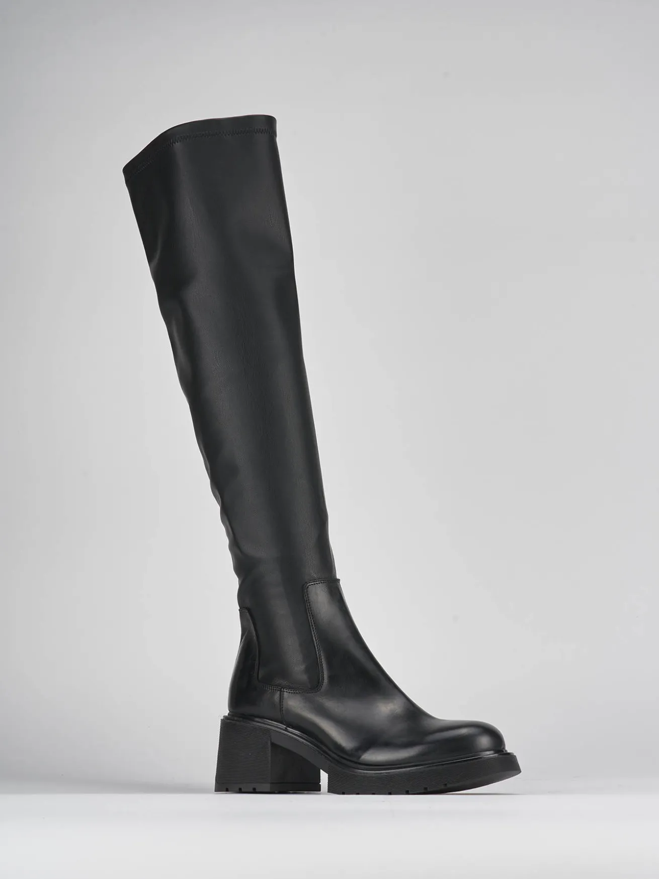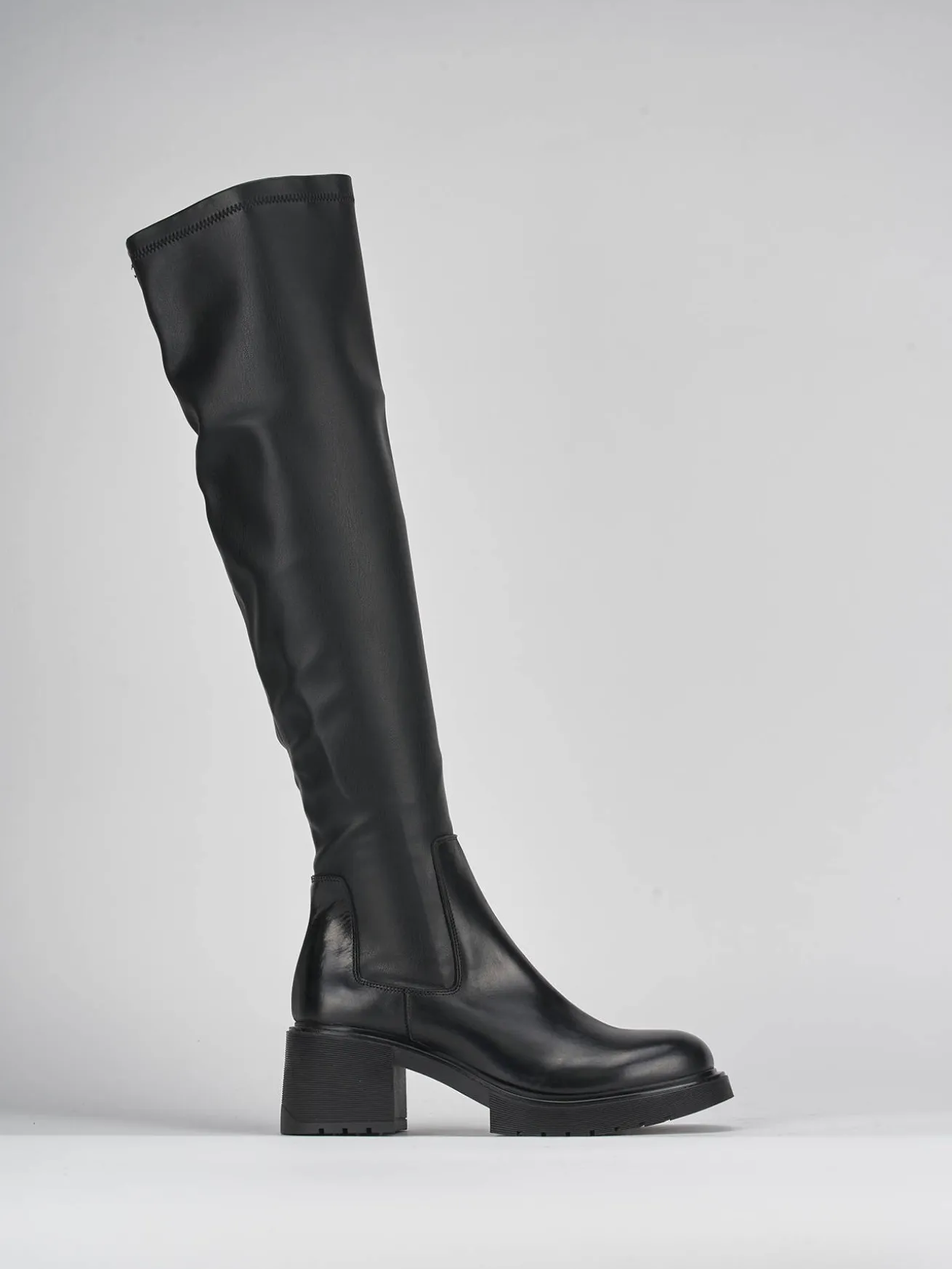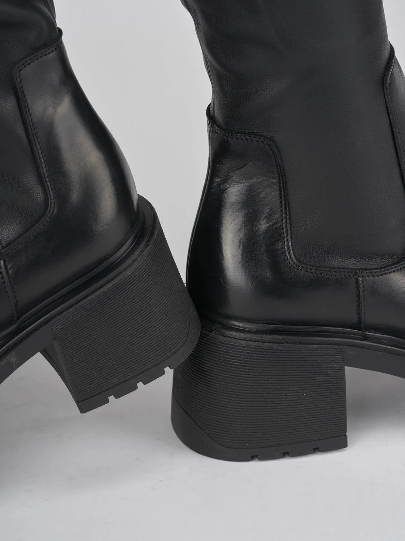Stivale tacco 6 cm fondo in gomma e soletto interno in vera pelle. Tomaia in morbida pelle, punta arrotondata, cuciture visibili, gambale elasticizzato per un fit su misura che misura appena sopra il ginocchio. Comoda cerniera laterale e tacco grosso. perfetto con una minigonna o mini dress.