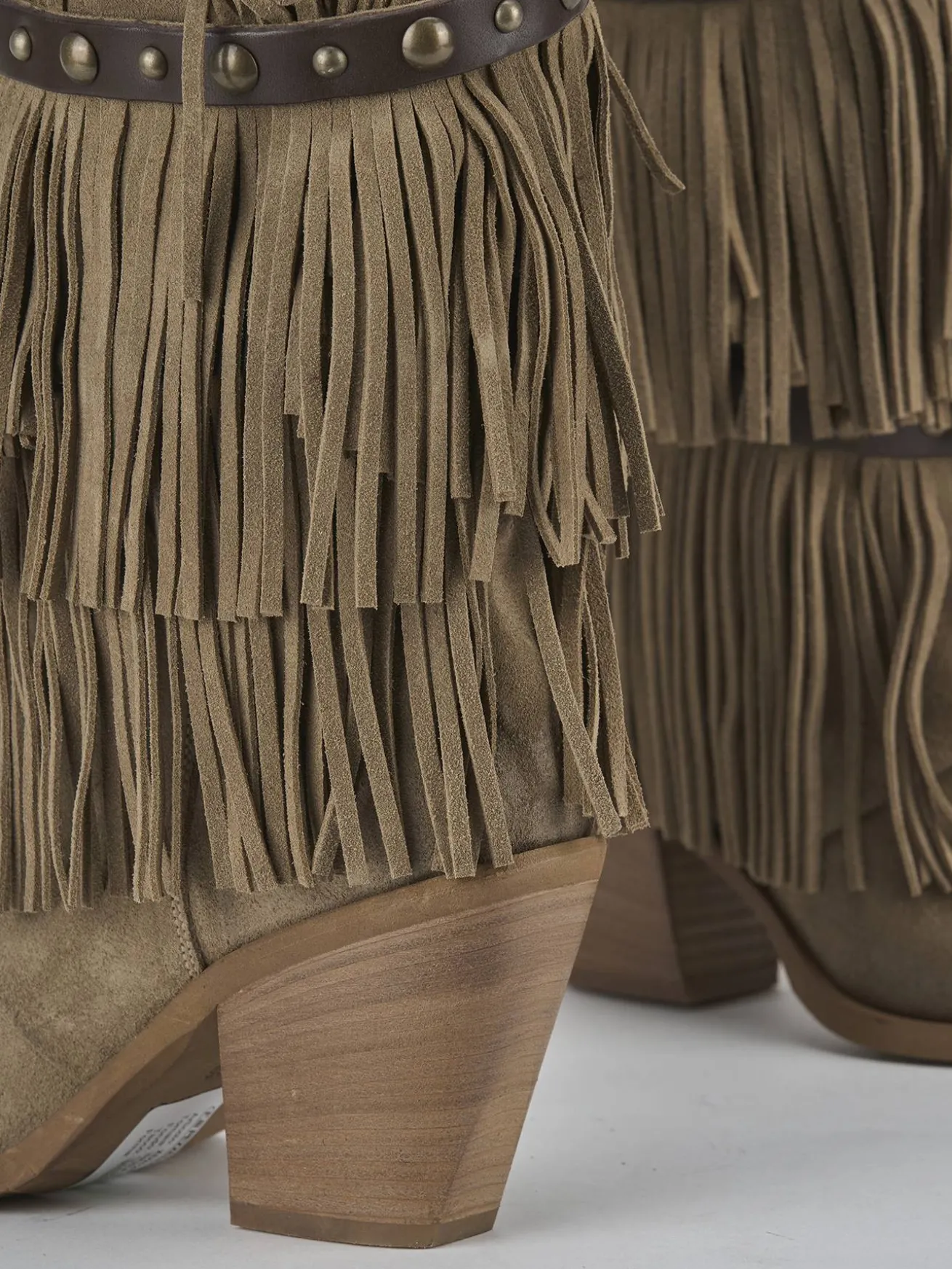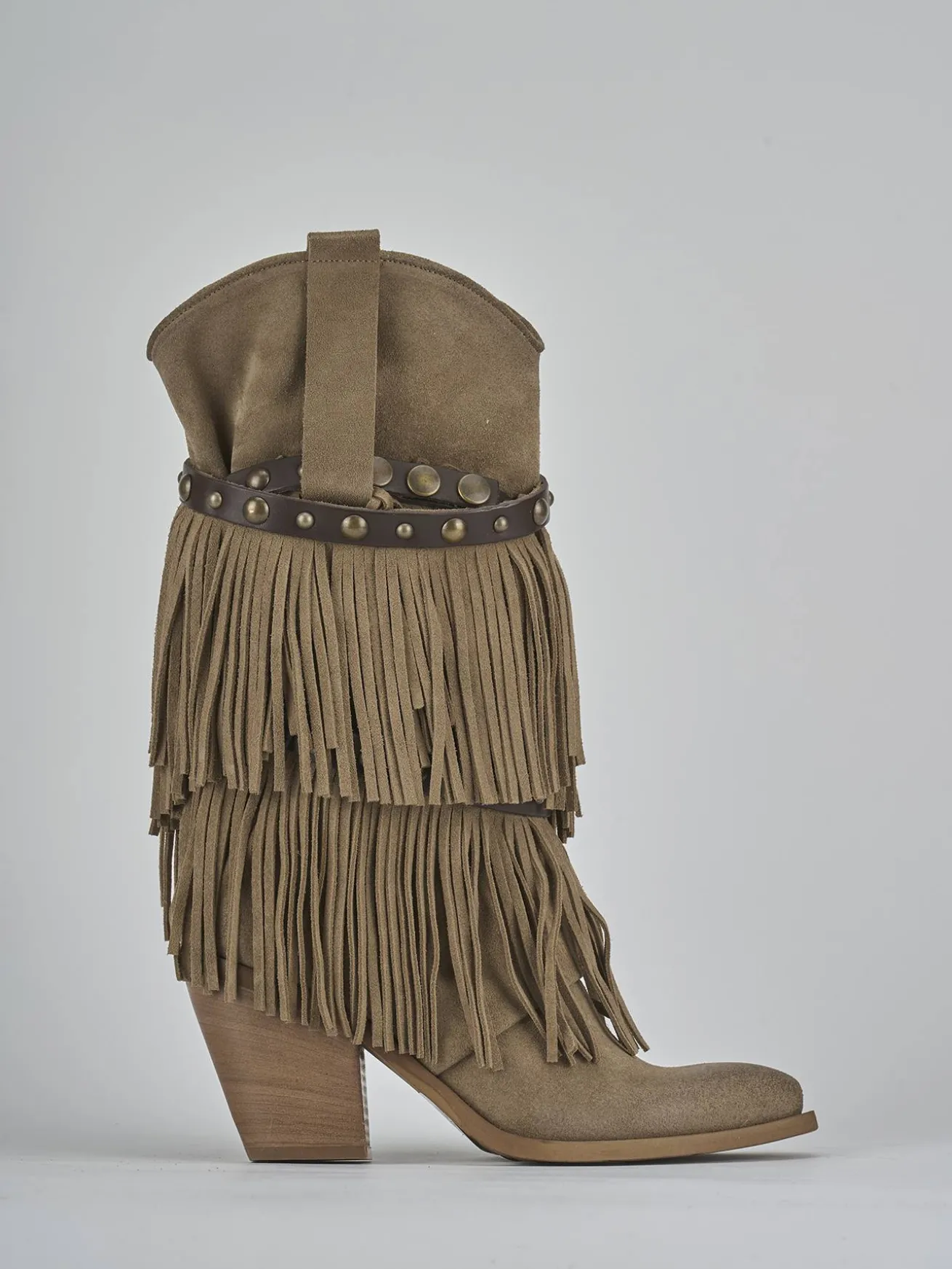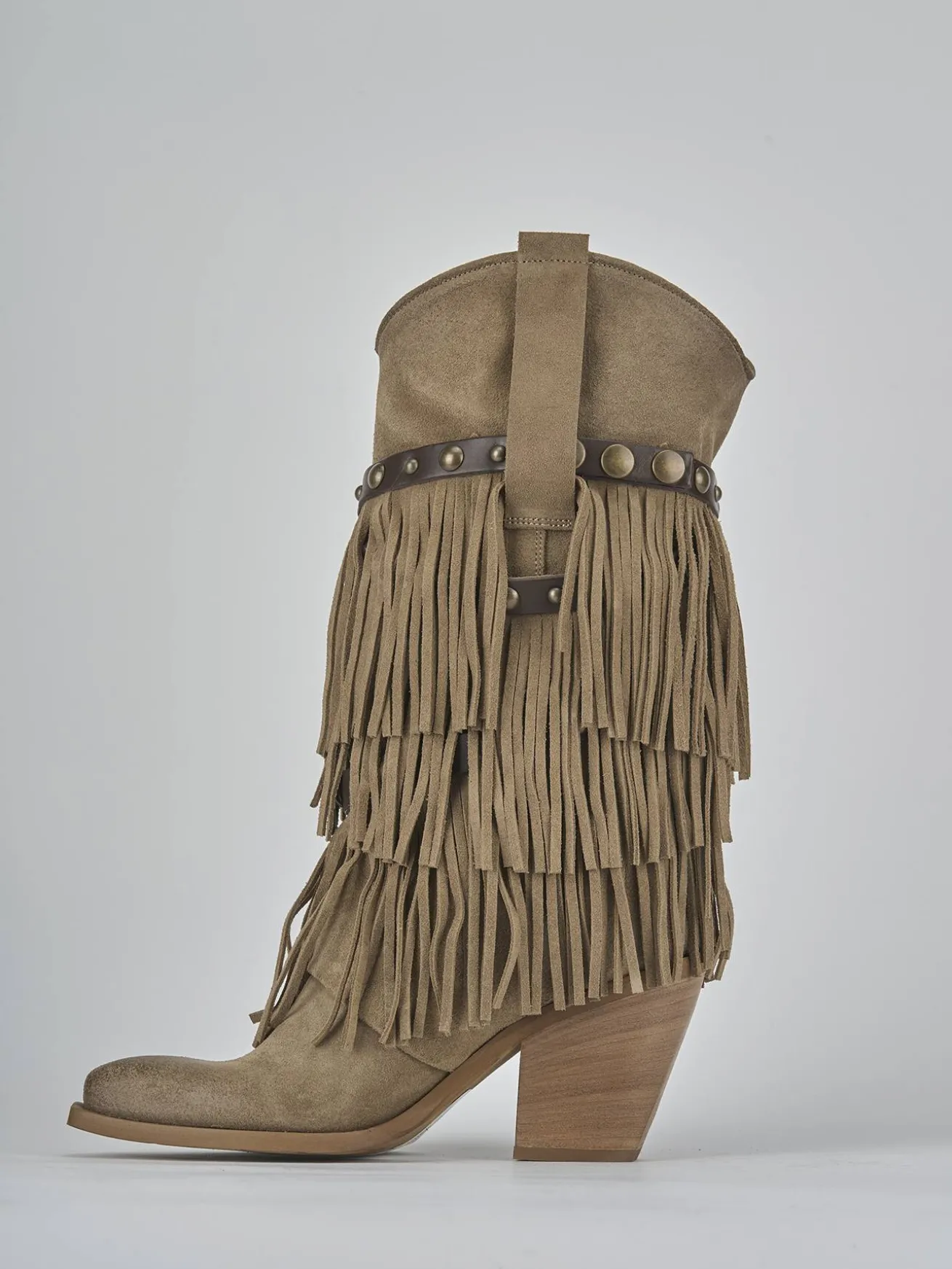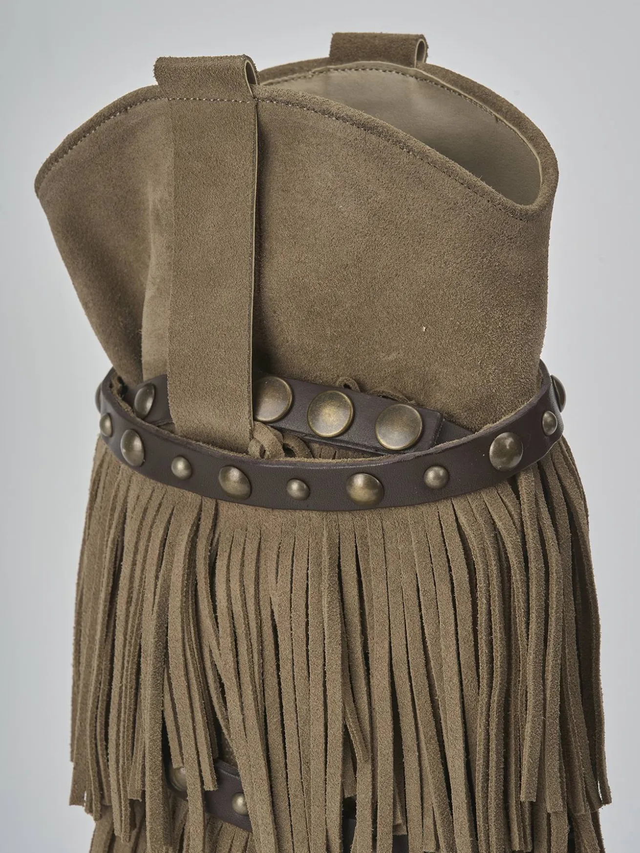 Stivale texano tacco 9 cm fondo in gomma e soletto interno in vera pelle. Tomaia in morbida pelle scamosciata, punta sfilata, frange, ghette che mantegono la forma del gambale che misura appena sotto il ginocchio, cinturino incrociato con borchie in ottone per un look che ti farà notare.