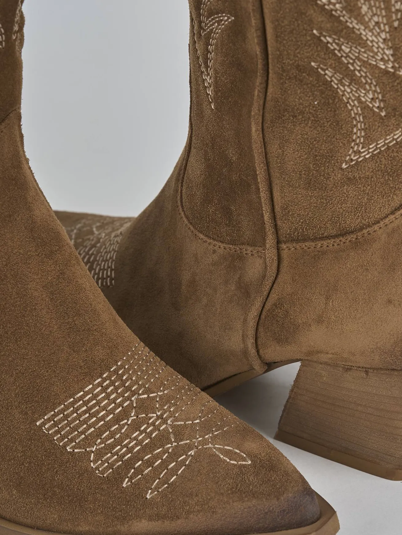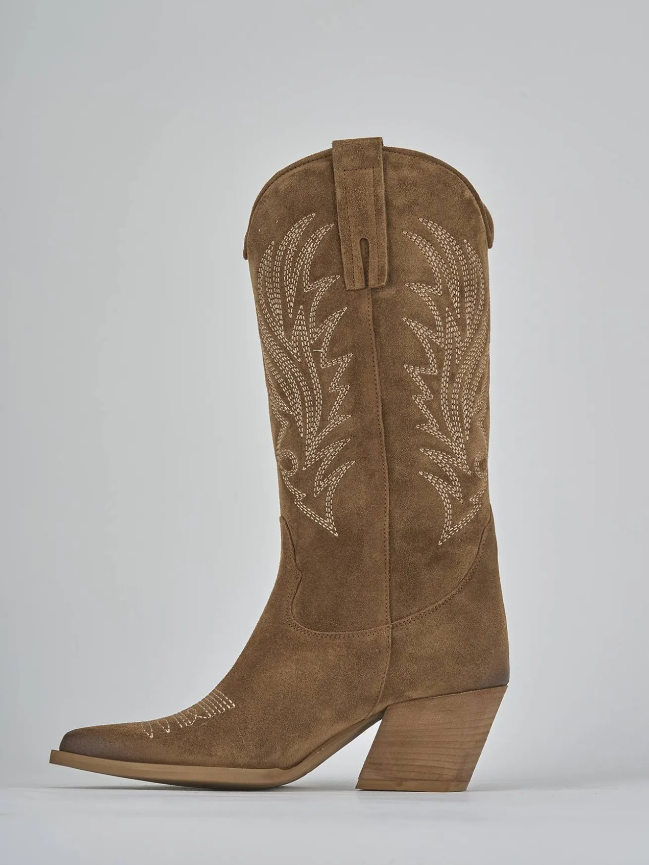 Stivale texano tacco 4cm fondo in leggera gomma e soletto interno in vera pelle. Tomaia in morbido camoscio, punta sfilata, preziosissimi ricami sul puntale e su tutto il gambale, ghette e tacco cubano. Altezza gambale 4 cm sotto al ginocchio per uno dei must della tua primavera.