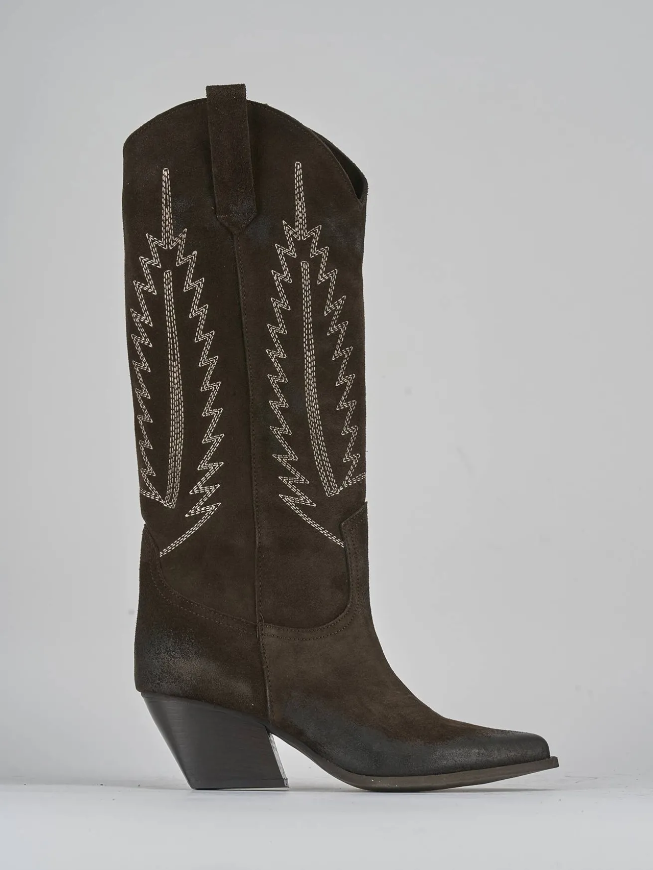 I ricami a contrasto sul gambale, che si ferma appena sotto il ginocchio, donano un dettaglio distintivo e sofisticato.