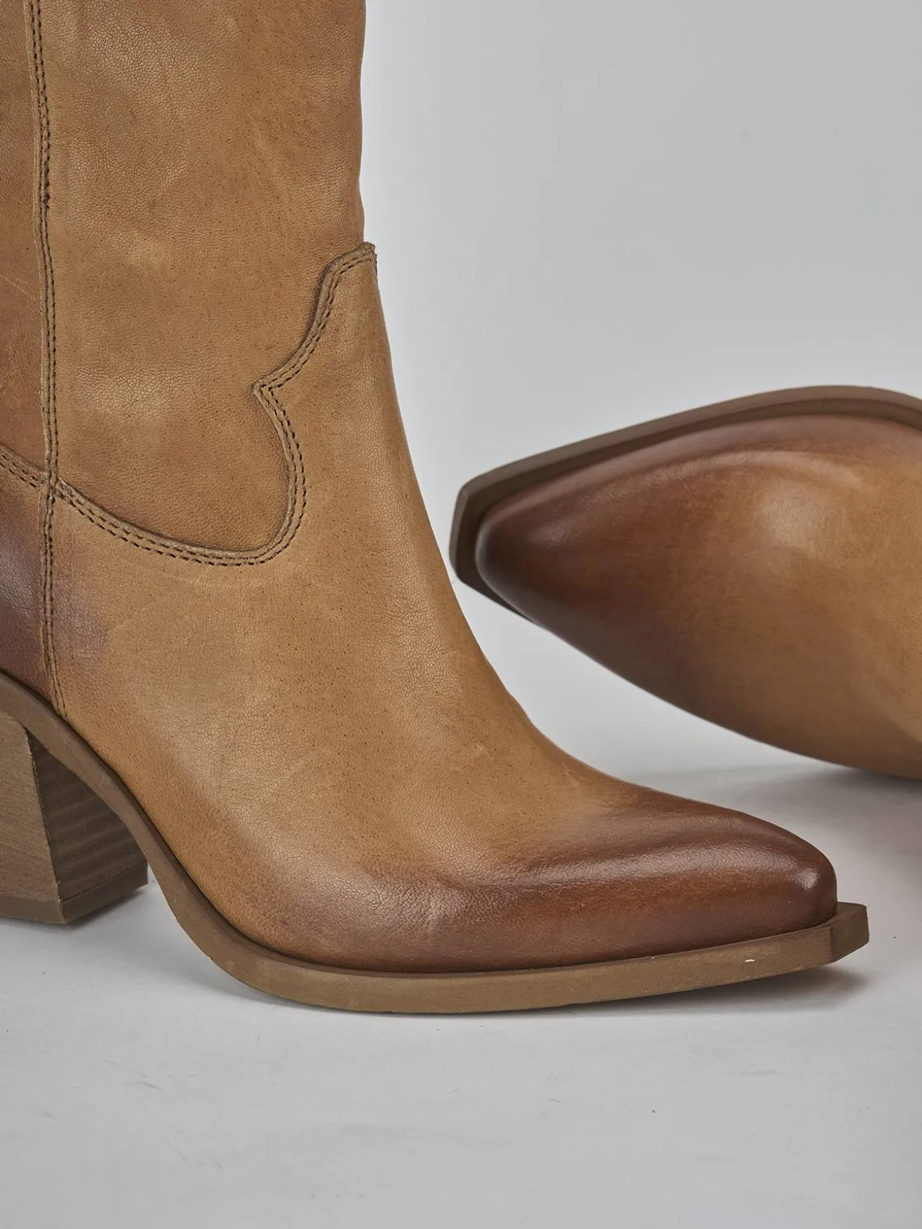 Stivale texano tacco 7 cm fondo in gomma e soletto interno in vera pelle. Tomaia in morbida pelle, punta sfilata, cuciture a mano, ghette che mantengono la forma del gambale che misura appena sotto il ginocchio. Comoda cerniera laterale e tacco cubano. Perfetto sia con un pantalone che con un vestito.
