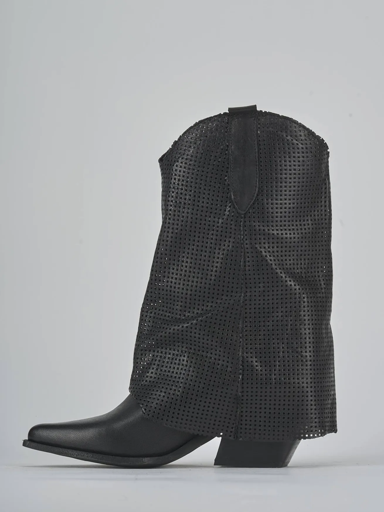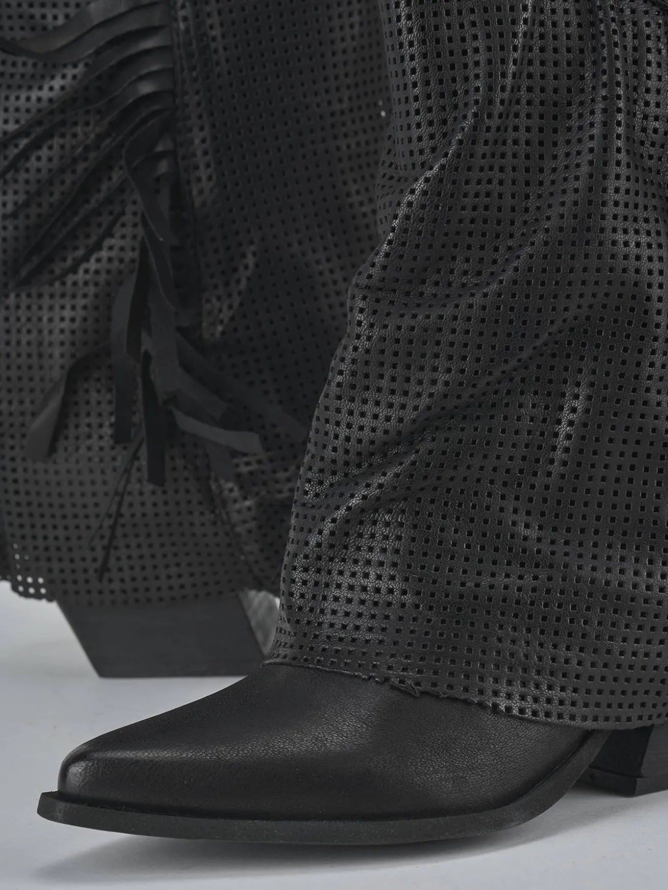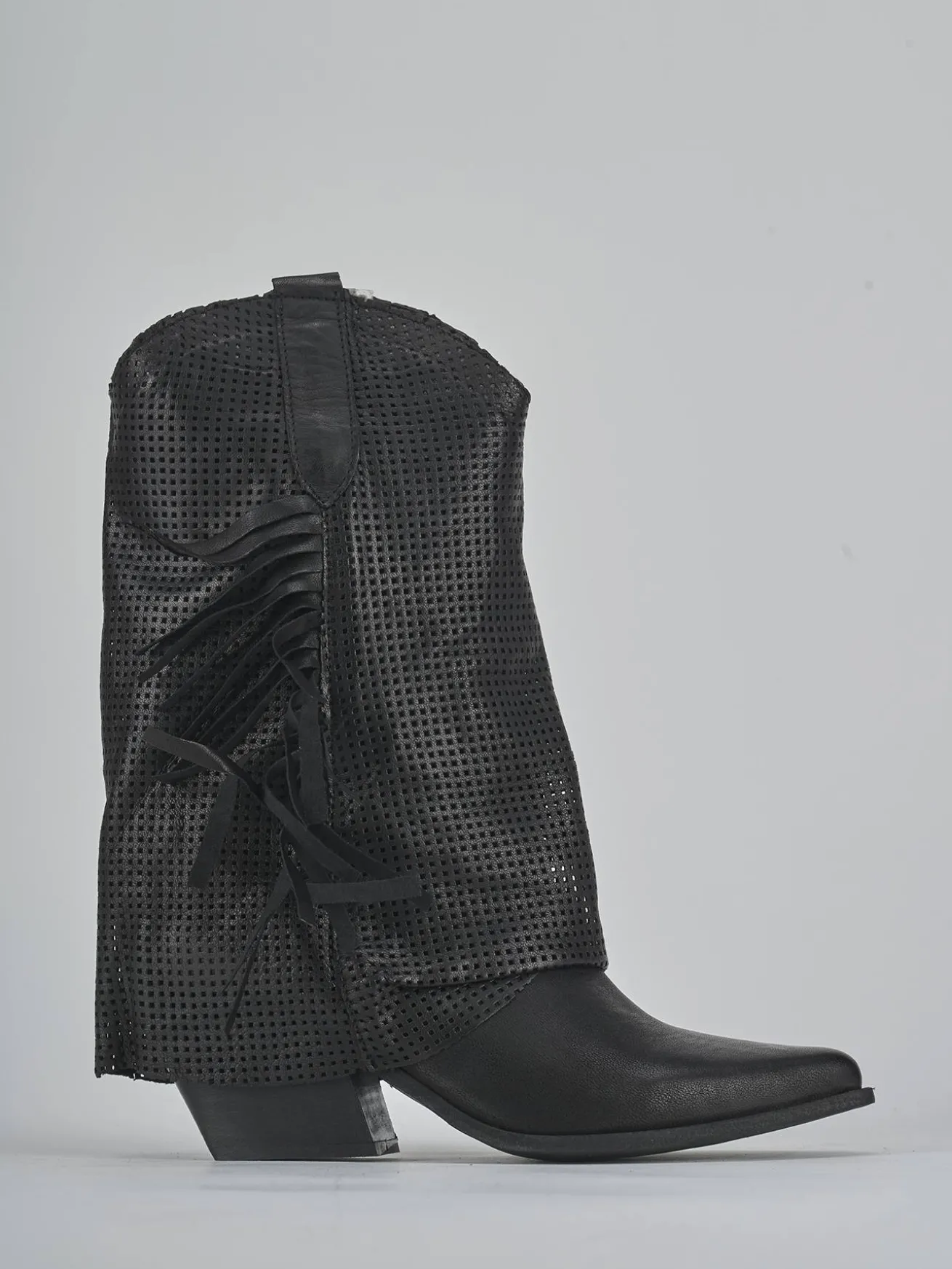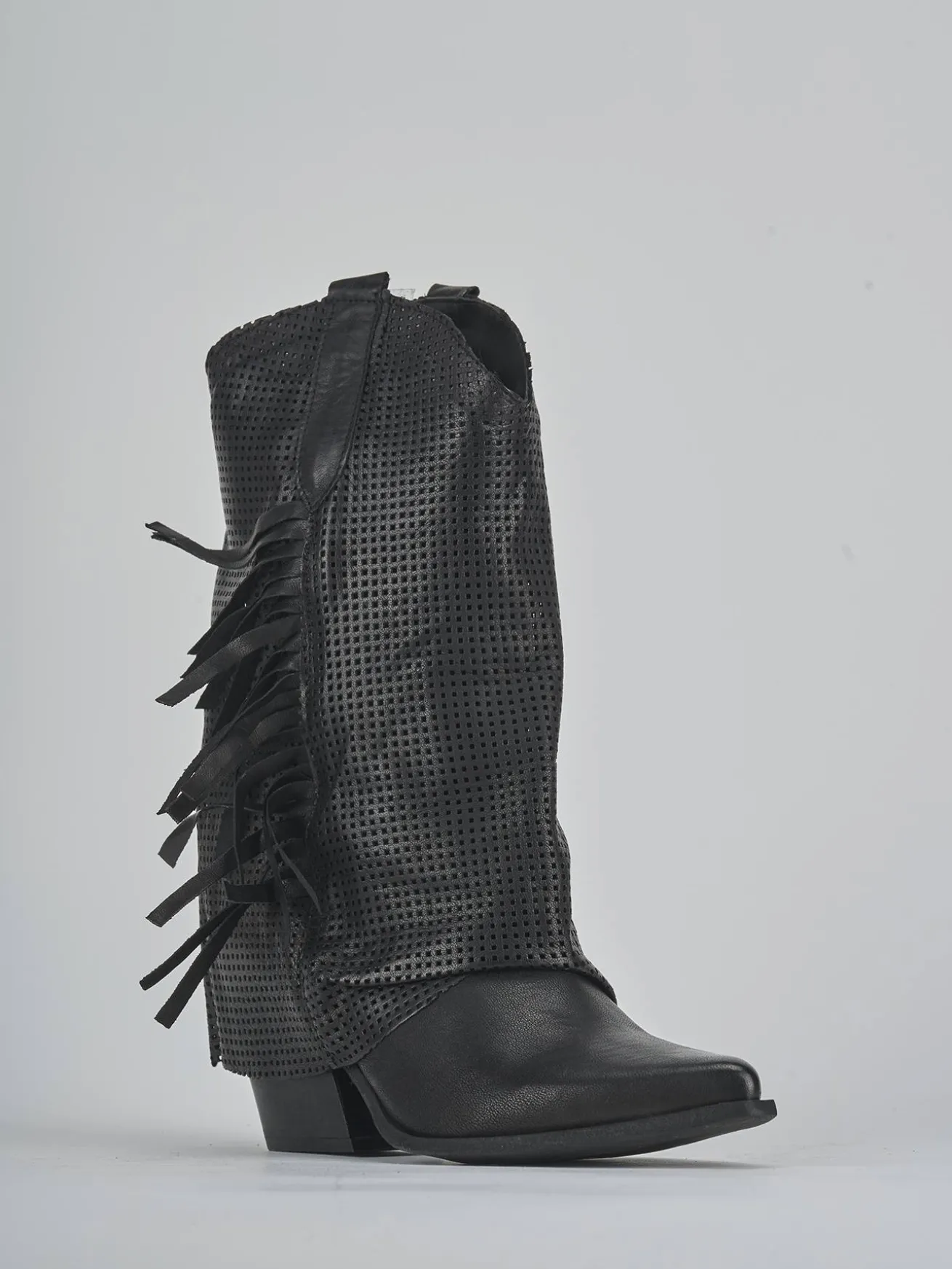 Stivale tacco 7 cm fondo in gomma e soletto interno in vera pelle. Tomaia in morbida pelle, punta sfilata, cuciture a mano, forato, ghette laterati e frangia sul gambale che misura a 3/4 del polpaccio. Per un look trendy.