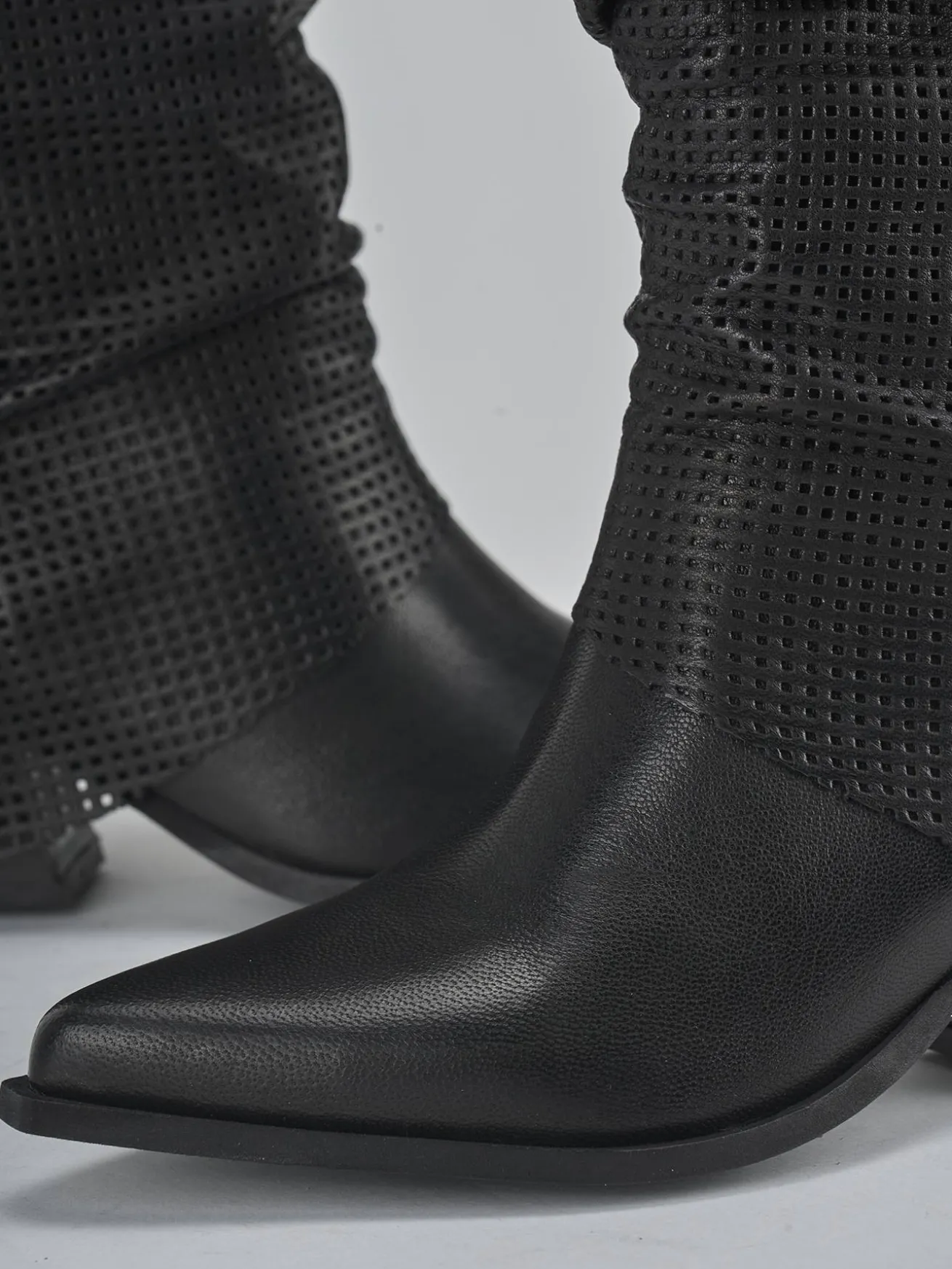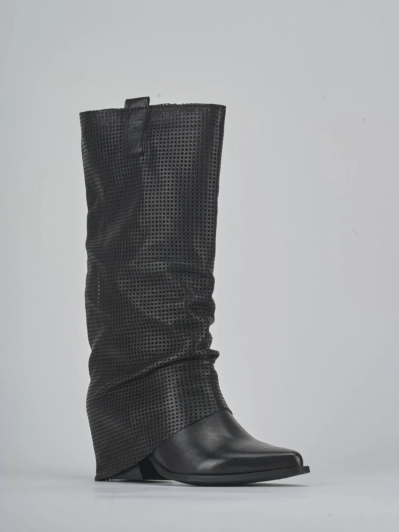 Stivale tacco 7 cm fondo in gomma e soletto interno in vera pelle. Tomaia in morbida pelle, punta sfilata, forato, ghette che mantengono la forma del gambale che misura a 3/4 del polpaccio. Tacco cubano per una camminata sicura.