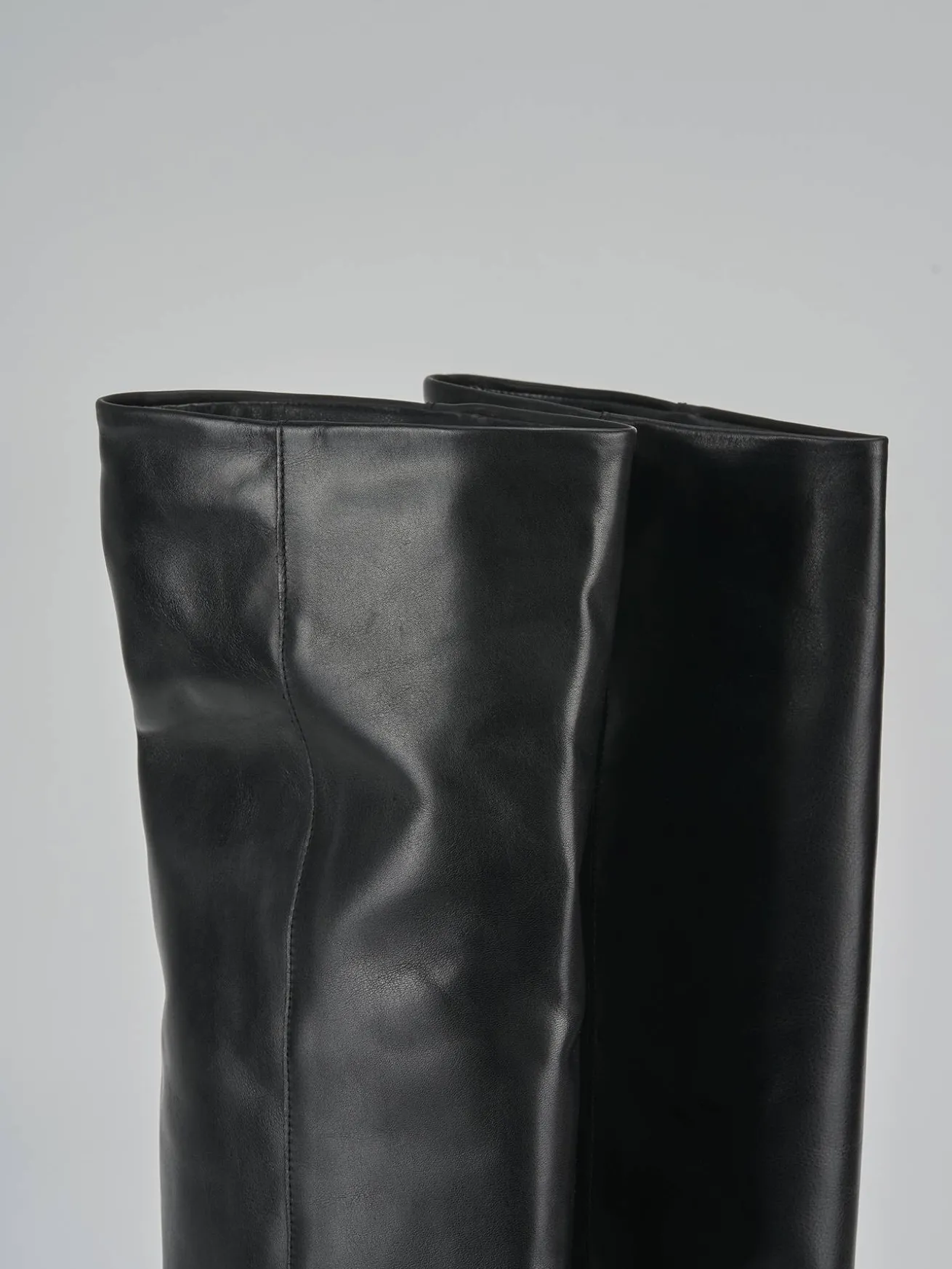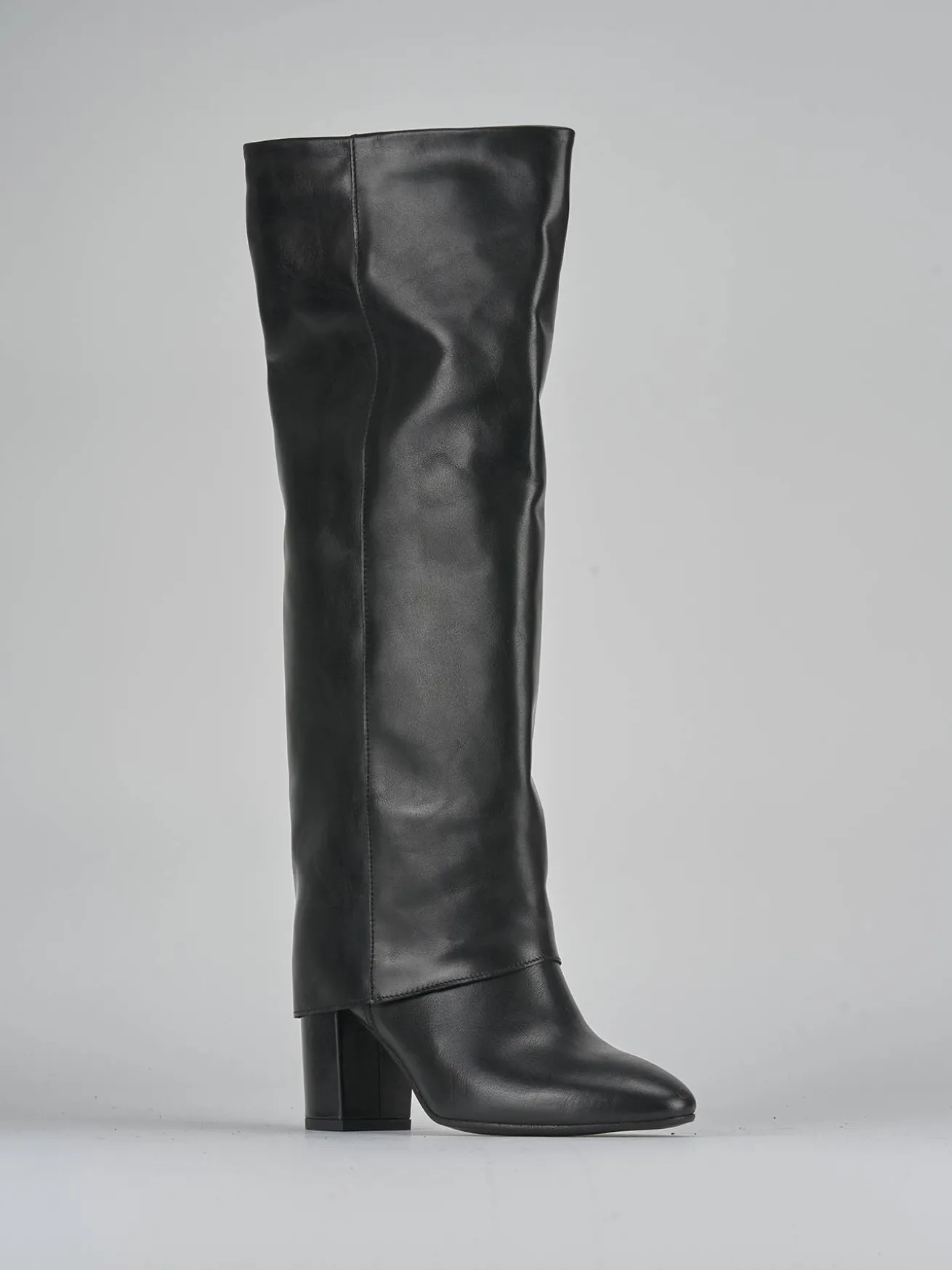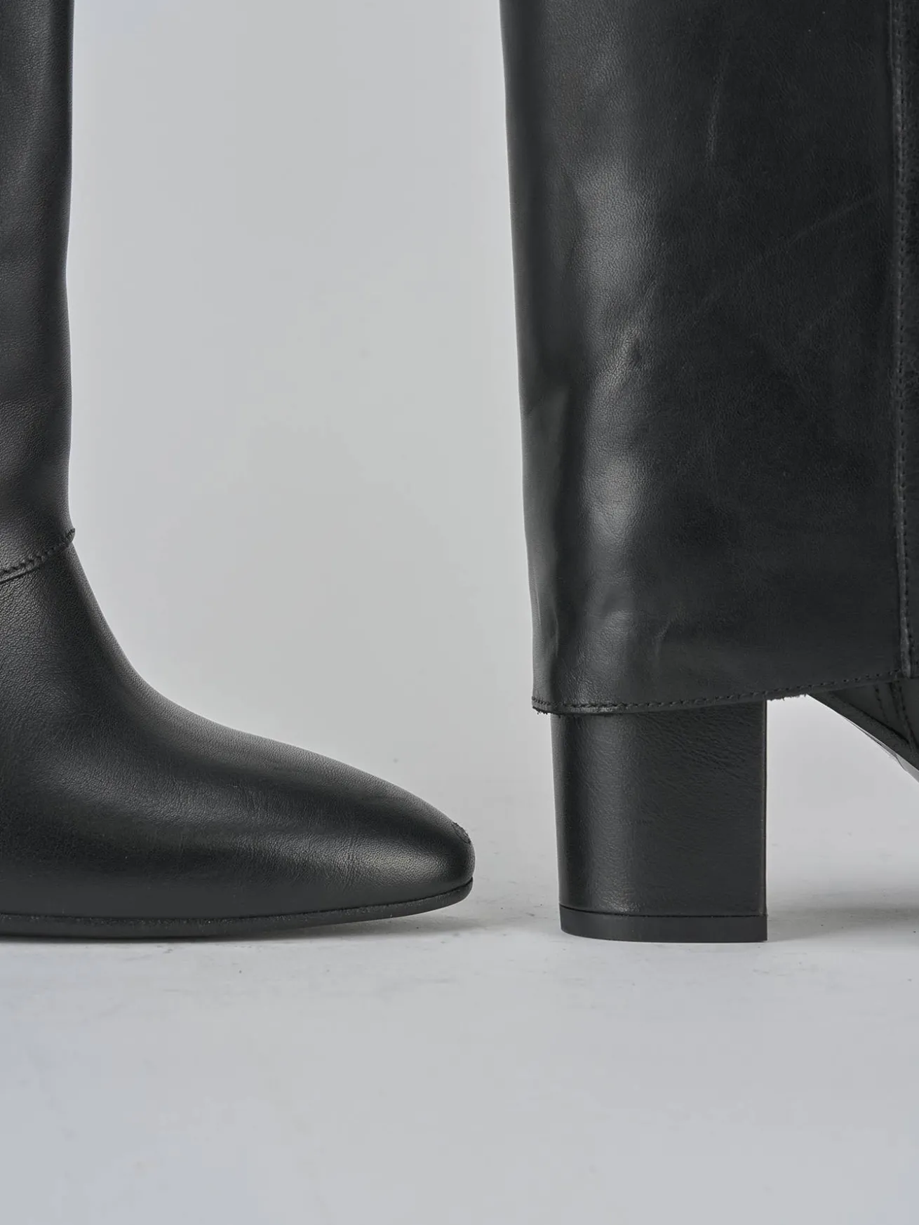 Questi eleganti stivali in pelle nera presentano un tacco di 7 cm, ideale per esaltare la femminilità e la sicurezza in ogni passo.