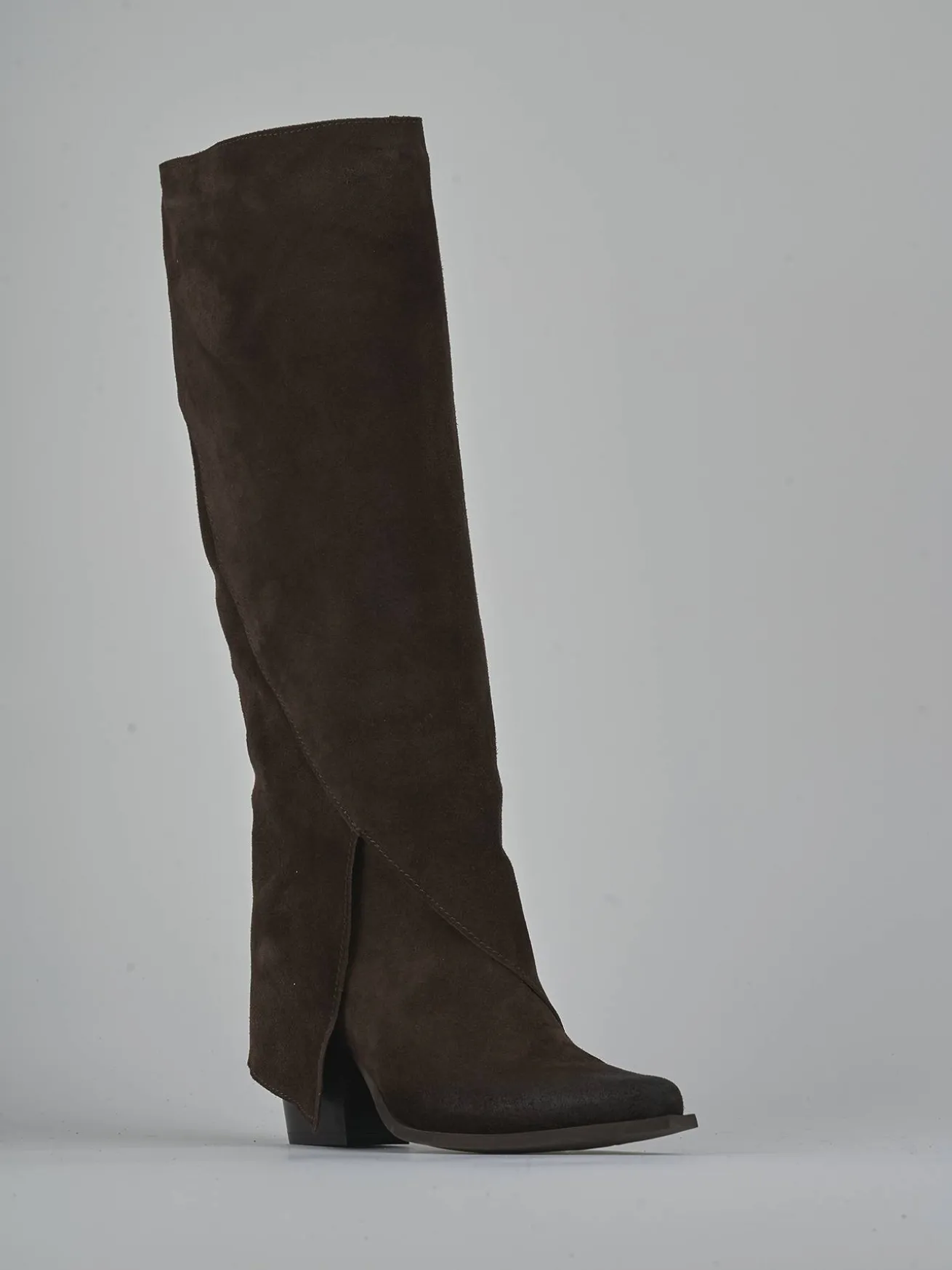 La tomaia in morbido camoscio avvolge la gamba fino appena sotto il ginocchio, mentre la punta sfilata aggiunge un dettaglio sofisticato.