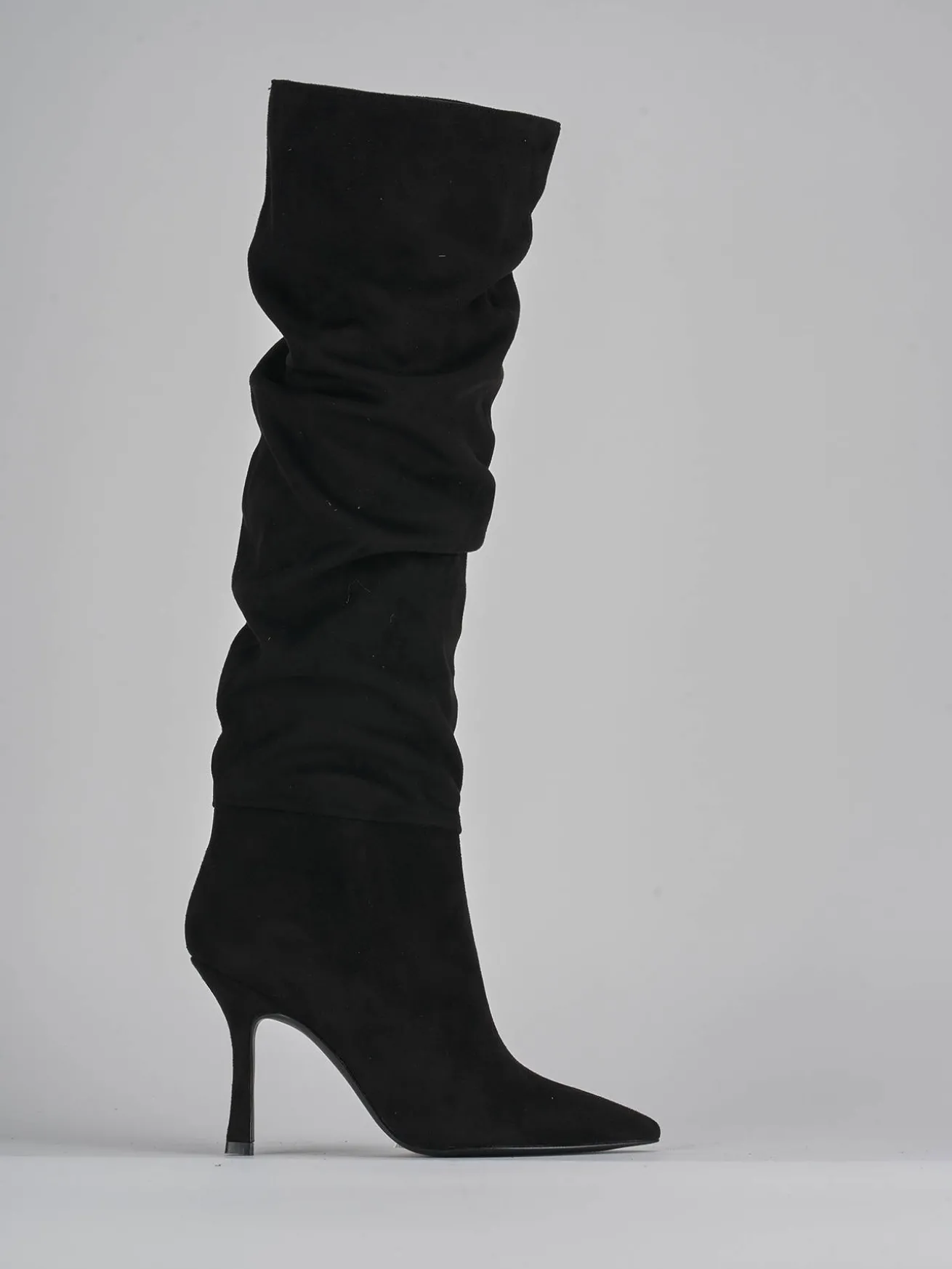 stivale tacco 9 cm fondo in leggera gomma e soletto interno in vera pelle. tomaia in morbido camoscio, punta sfilata, gambale arricciato che misura appena sotto il ginocchio e tacco rocchetto. perfetto per aggiungere un tocco glamour ai tuoi look.