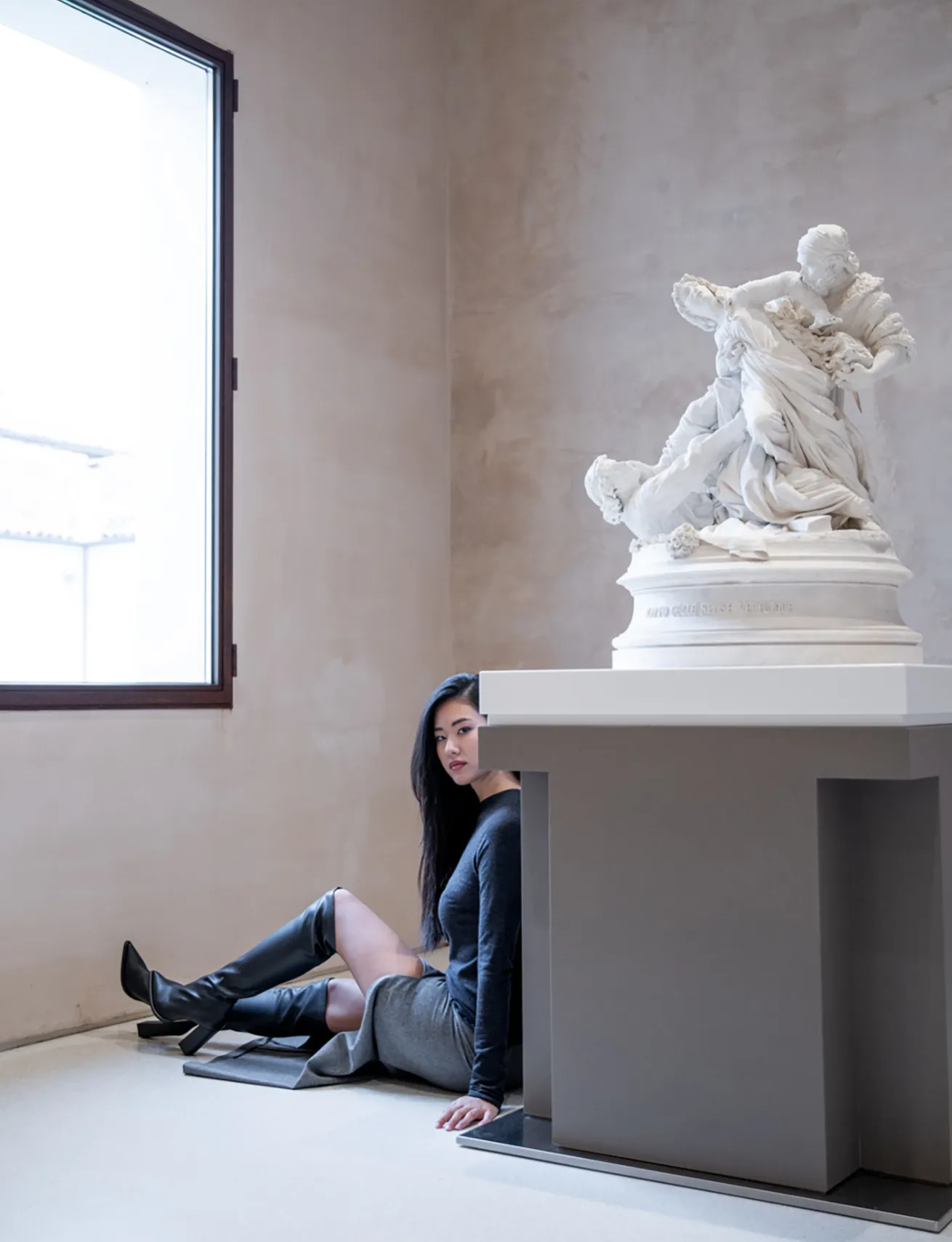 stivale tacco 9 cm fondo in leggera gomma e soletto interno in vera pelle. tomaia in morbida pelle stretch, punta sfilata, cuciture a vista, gambale aderente che misura appena sopra il ginocchio. guardolo sporgente per un look edgy.
