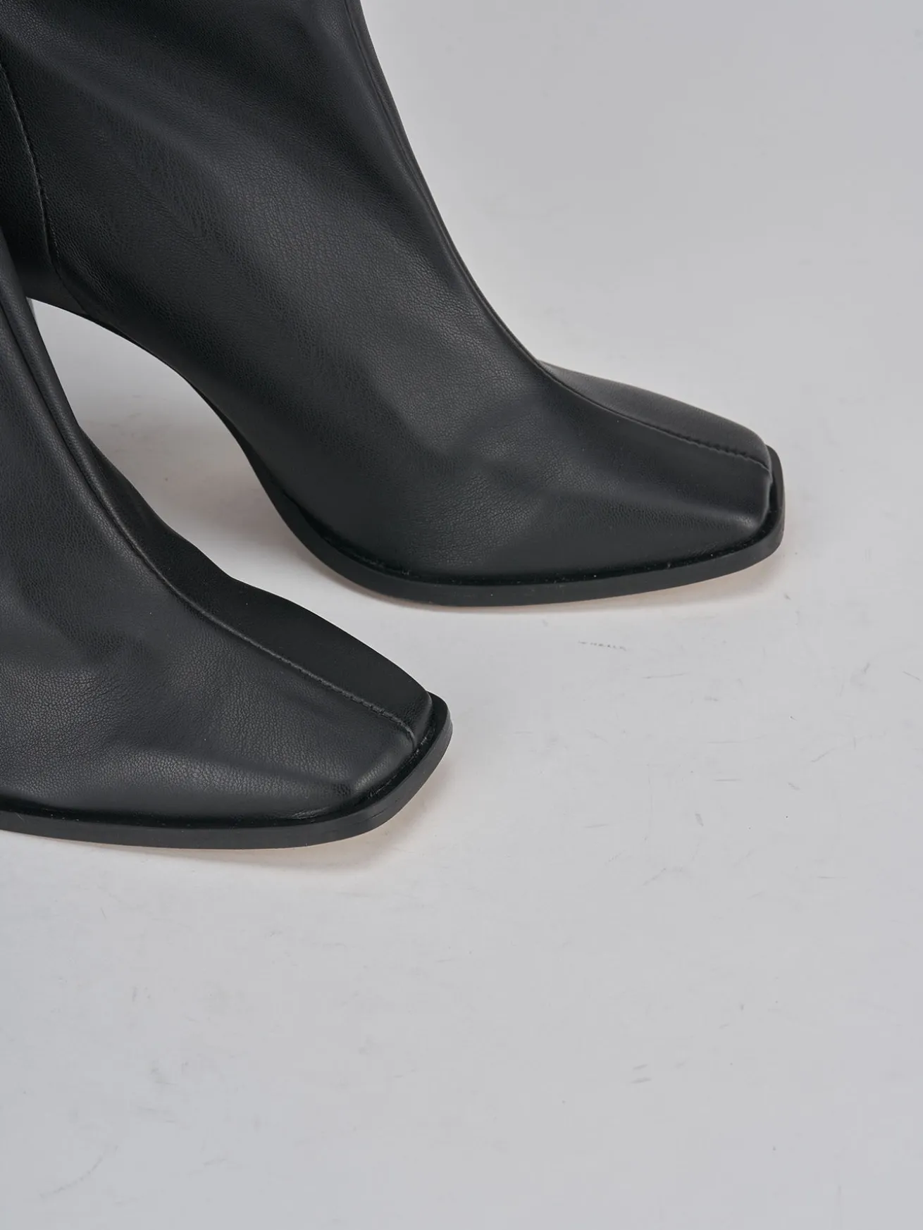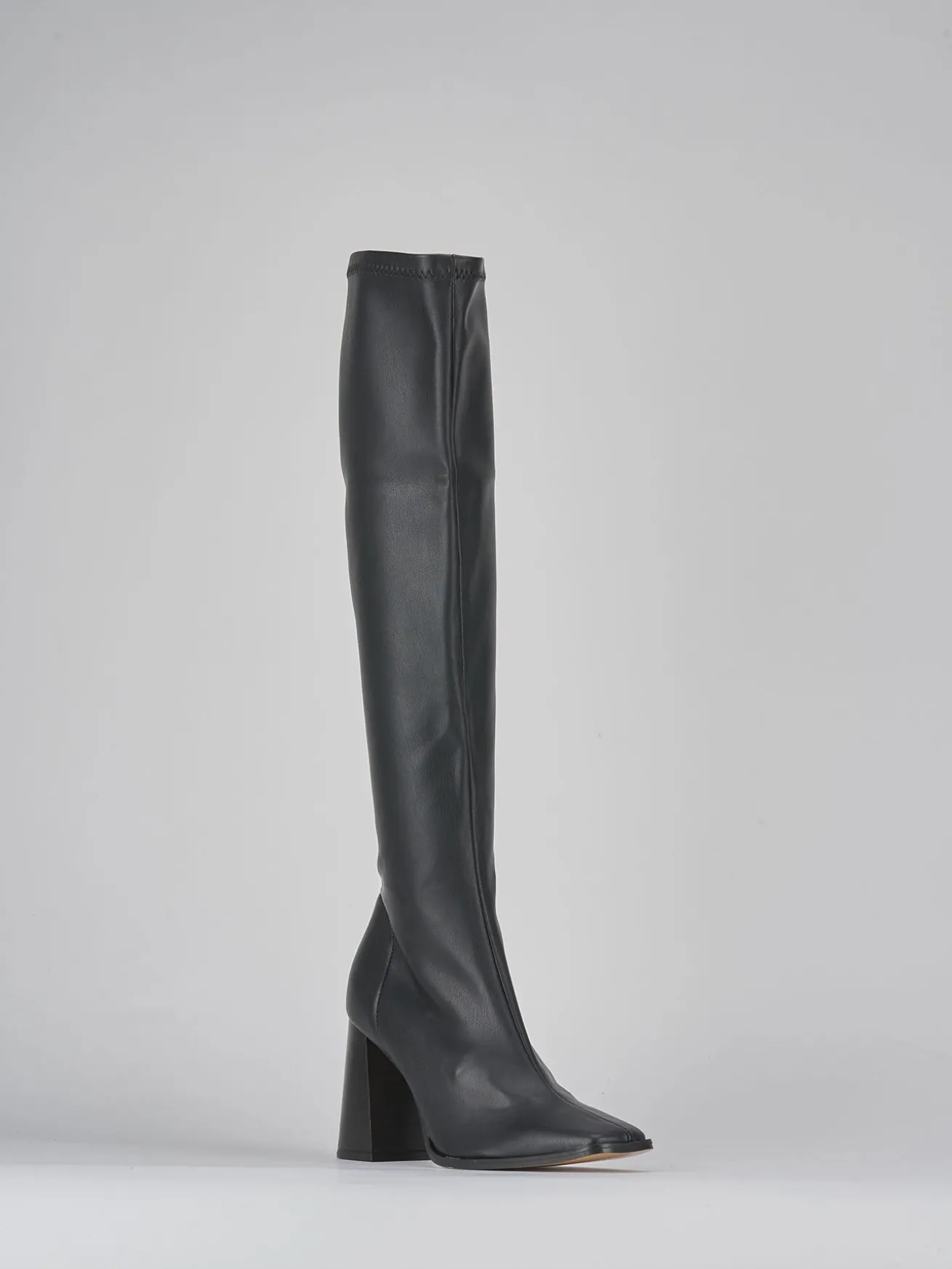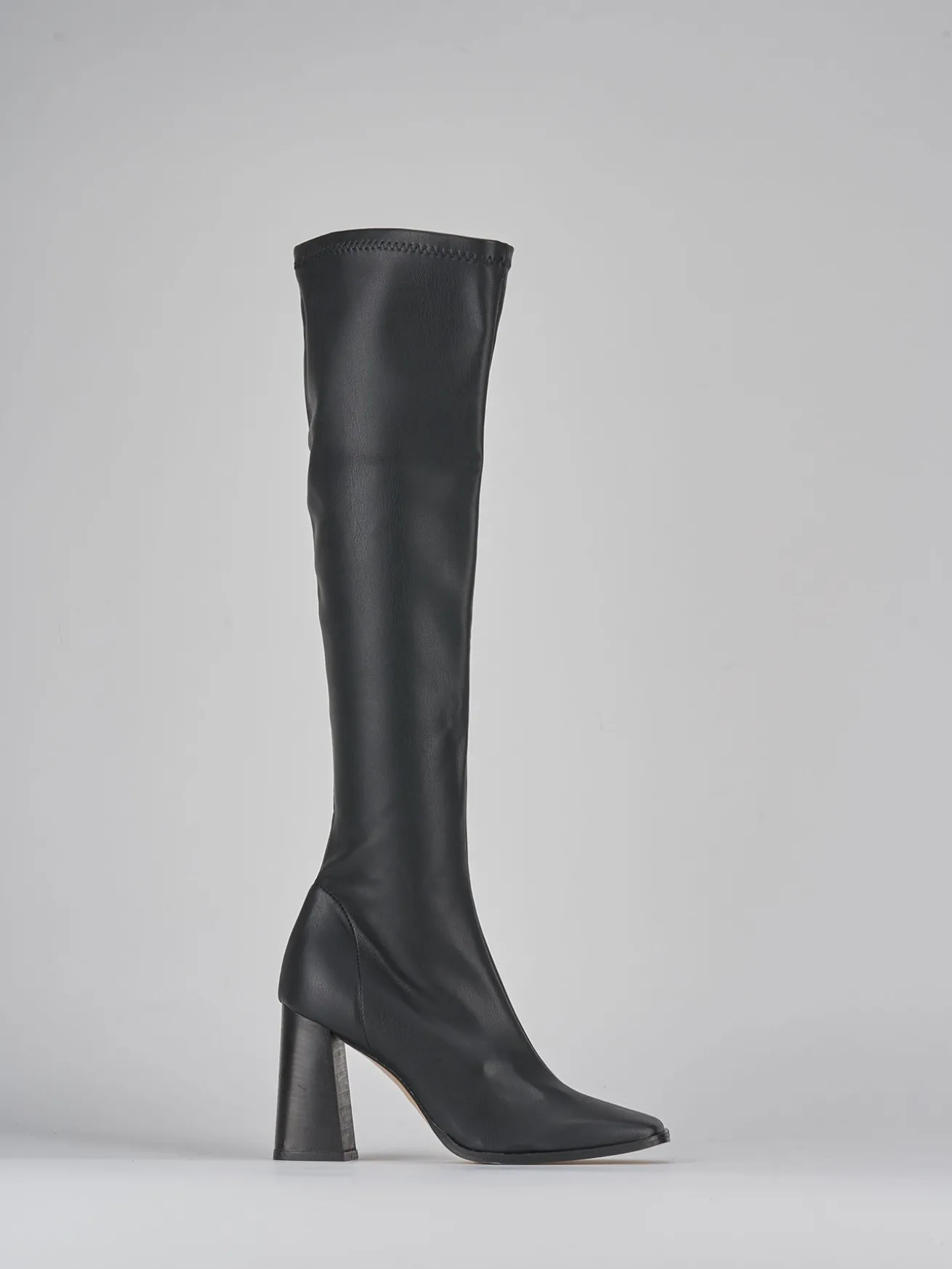 stivale tacco 9 cm fondo in leggera gomma e soletto interno in vera pelle. tomaia in morbida pelle stretch, punta squadrata, cuciture a vista a metà stivale, gambale aderente a tutte le gambe per un fit perfetto e che misura appena sopra il ginocchio. tacco grosso in cuoio e guardolo sporgente.