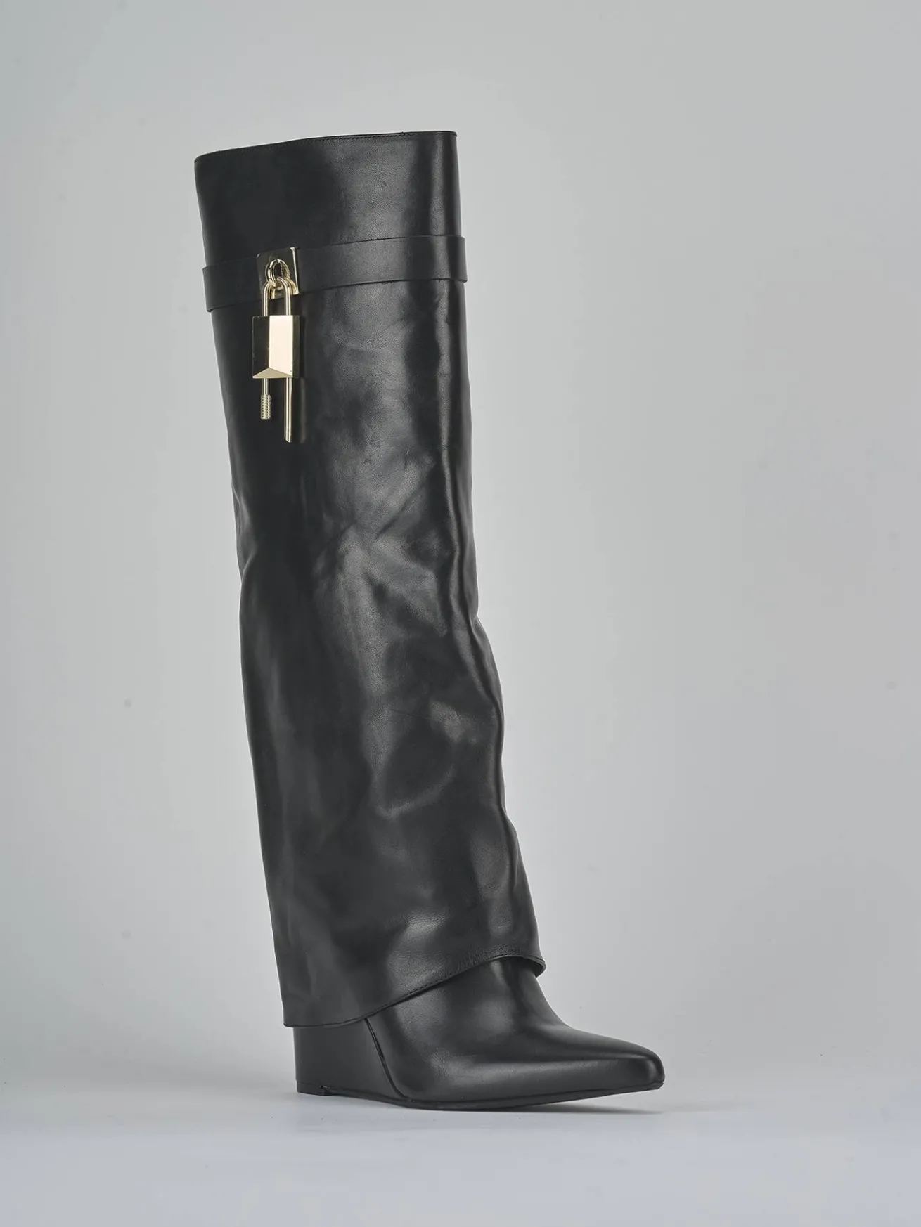 Un elegante accessorio a forma di lucchetto laterale impreziosisce il tutto, mentre la zeppa piena assicura stabilità e comfort.