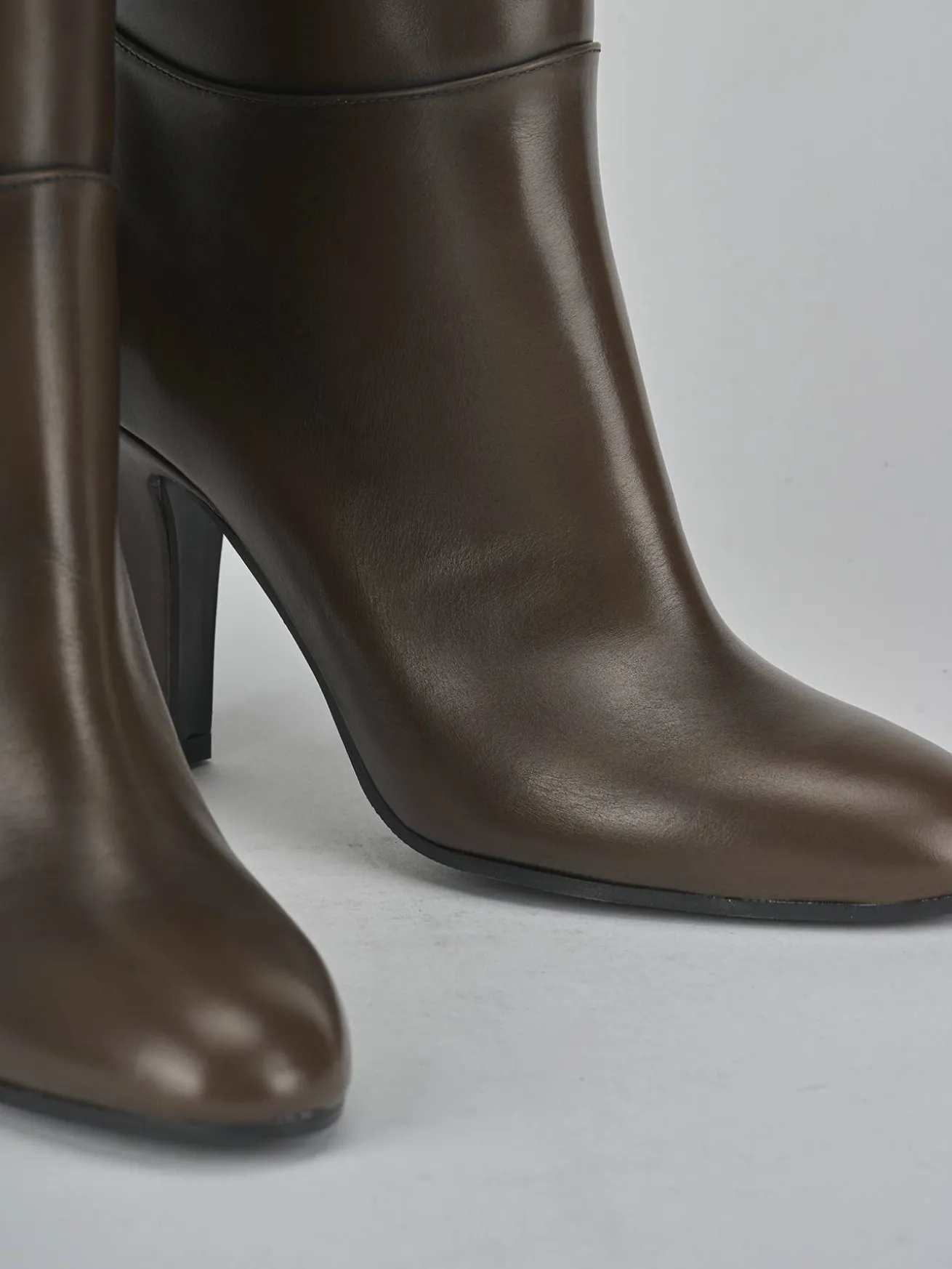 La punta affusolata e le cuciture visibili lungo il gambale tubolare, che si ferma appena sotto il ginocchio, conferiscono un tocco sofisticato e moderno.