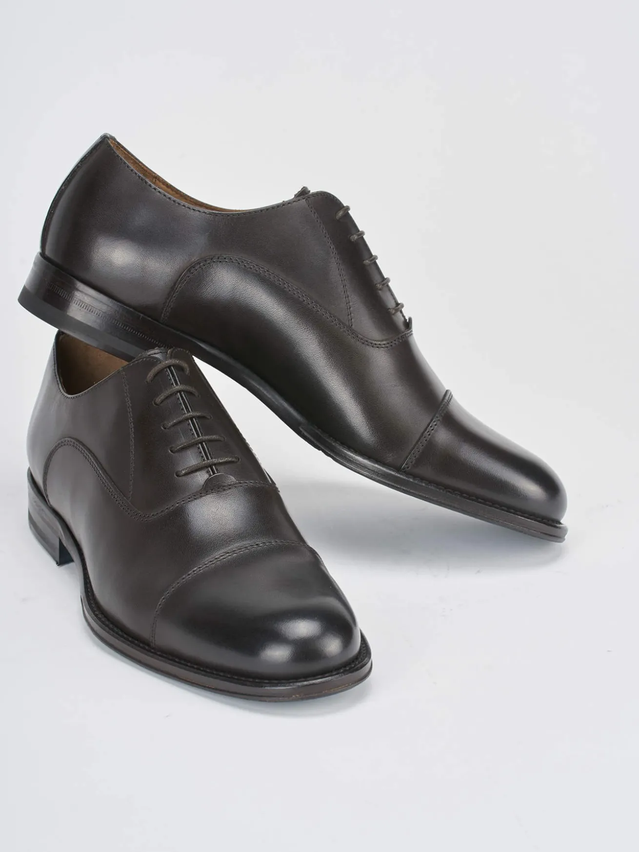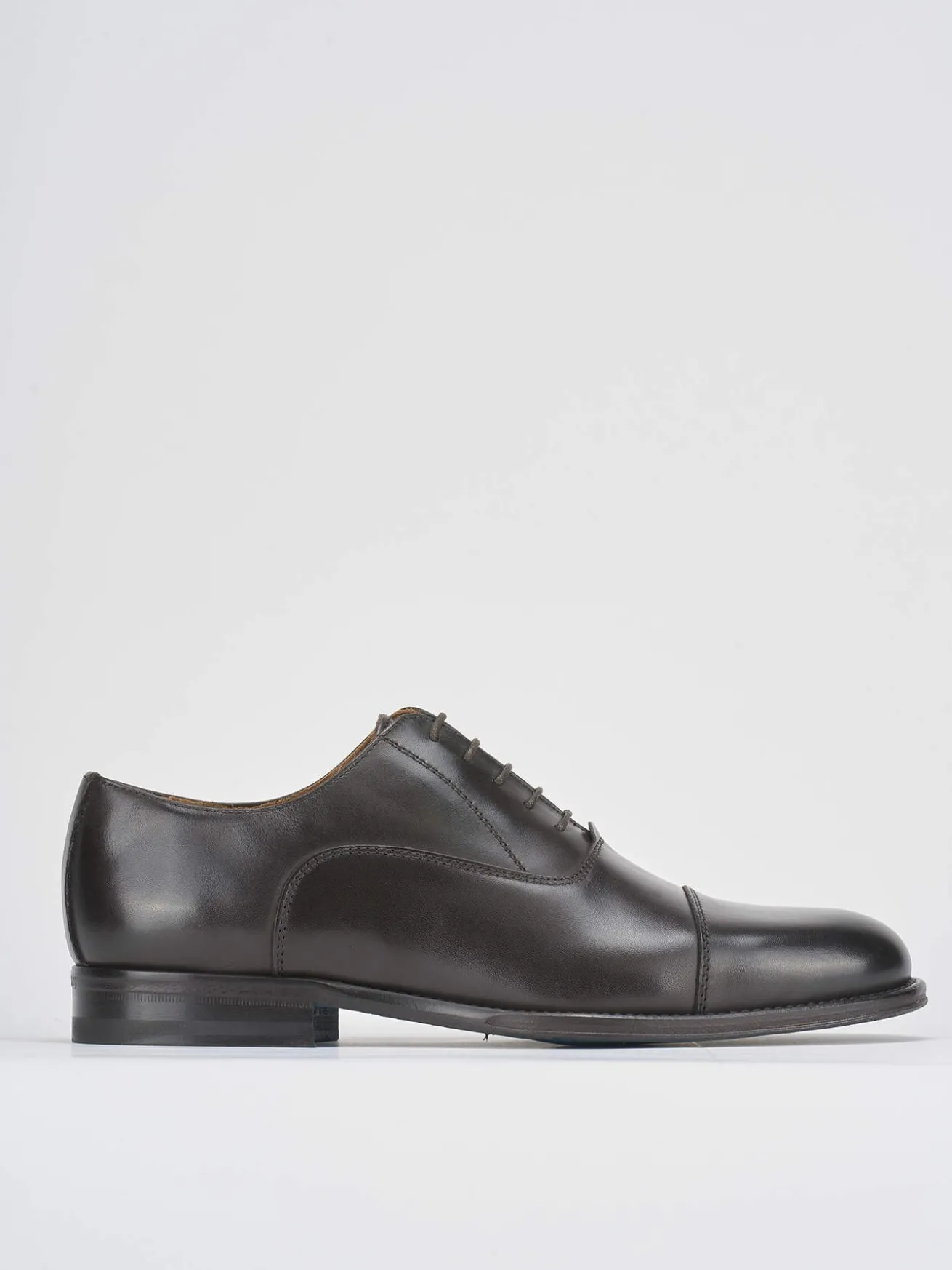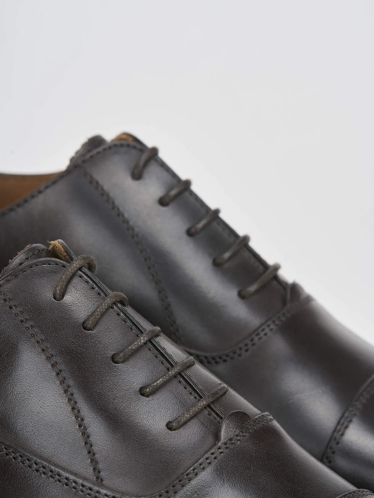 La scarpa presenta una raffinata allacciatura a cinque fori, che si adatta perfettamente al piede, mentre la punta affusolata e il puntale evidenziato da doppia cucitura aggiungono un tocco di classe artigianale.