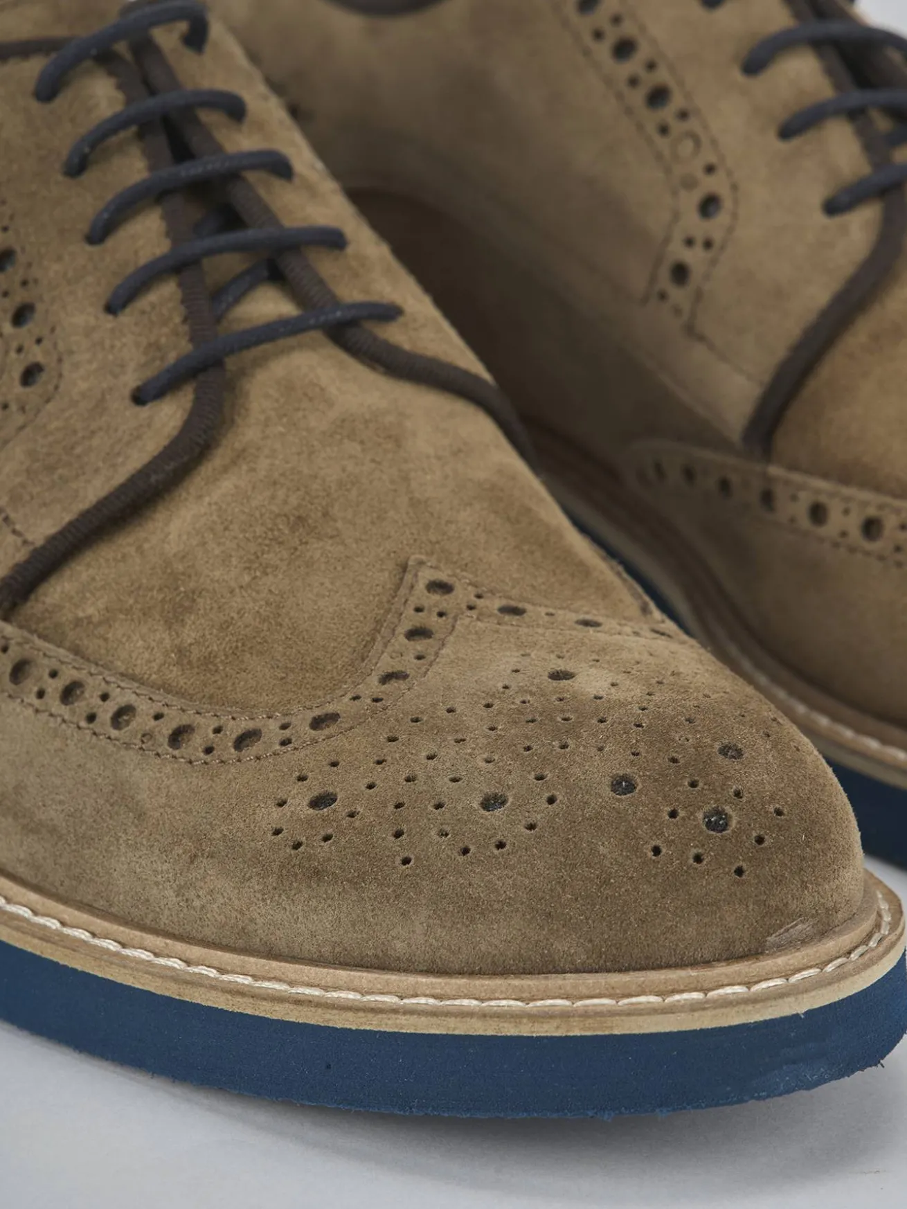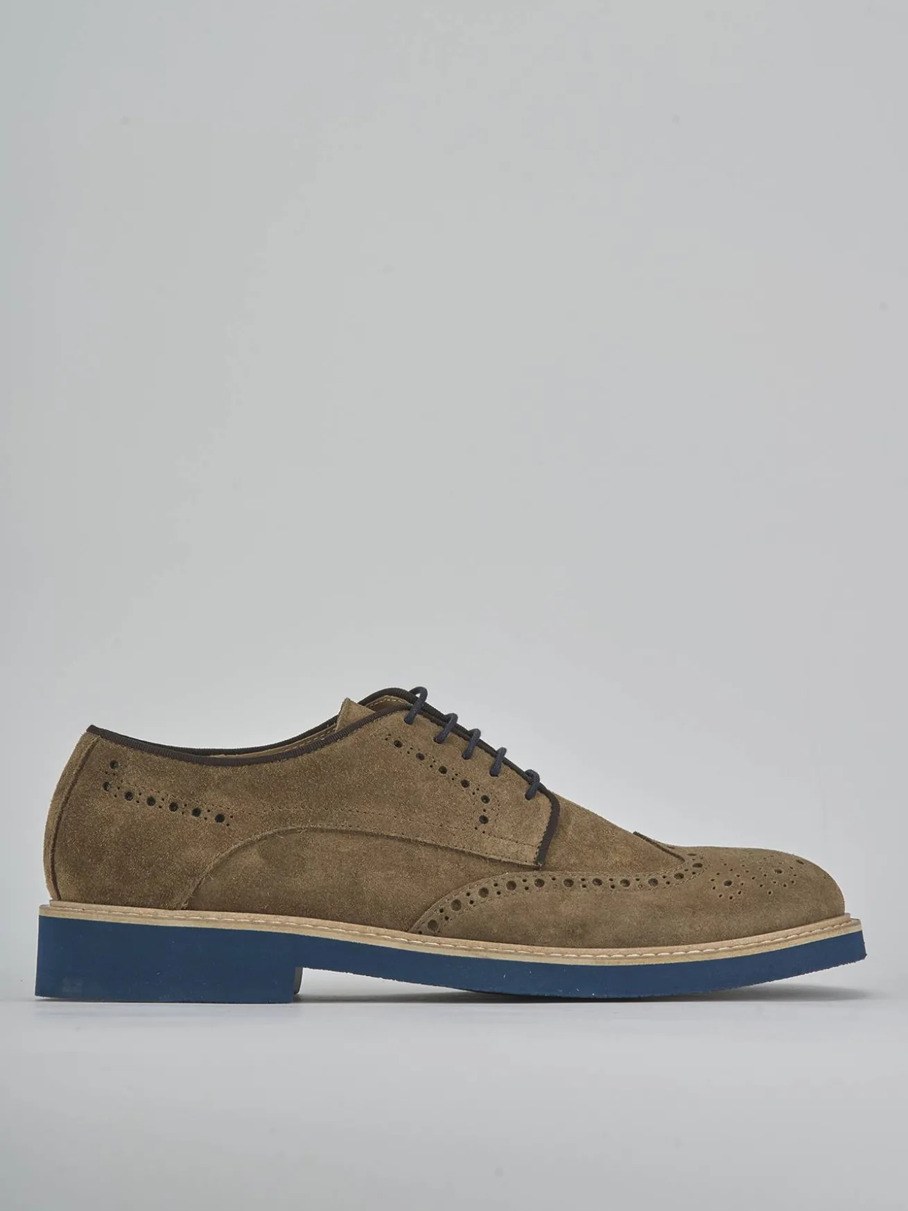 Il modello derby è arricchito da una punta affusolata e una pregiata lavorazione inglese, con cuciture a mano che esaltano la qualità artigianale.